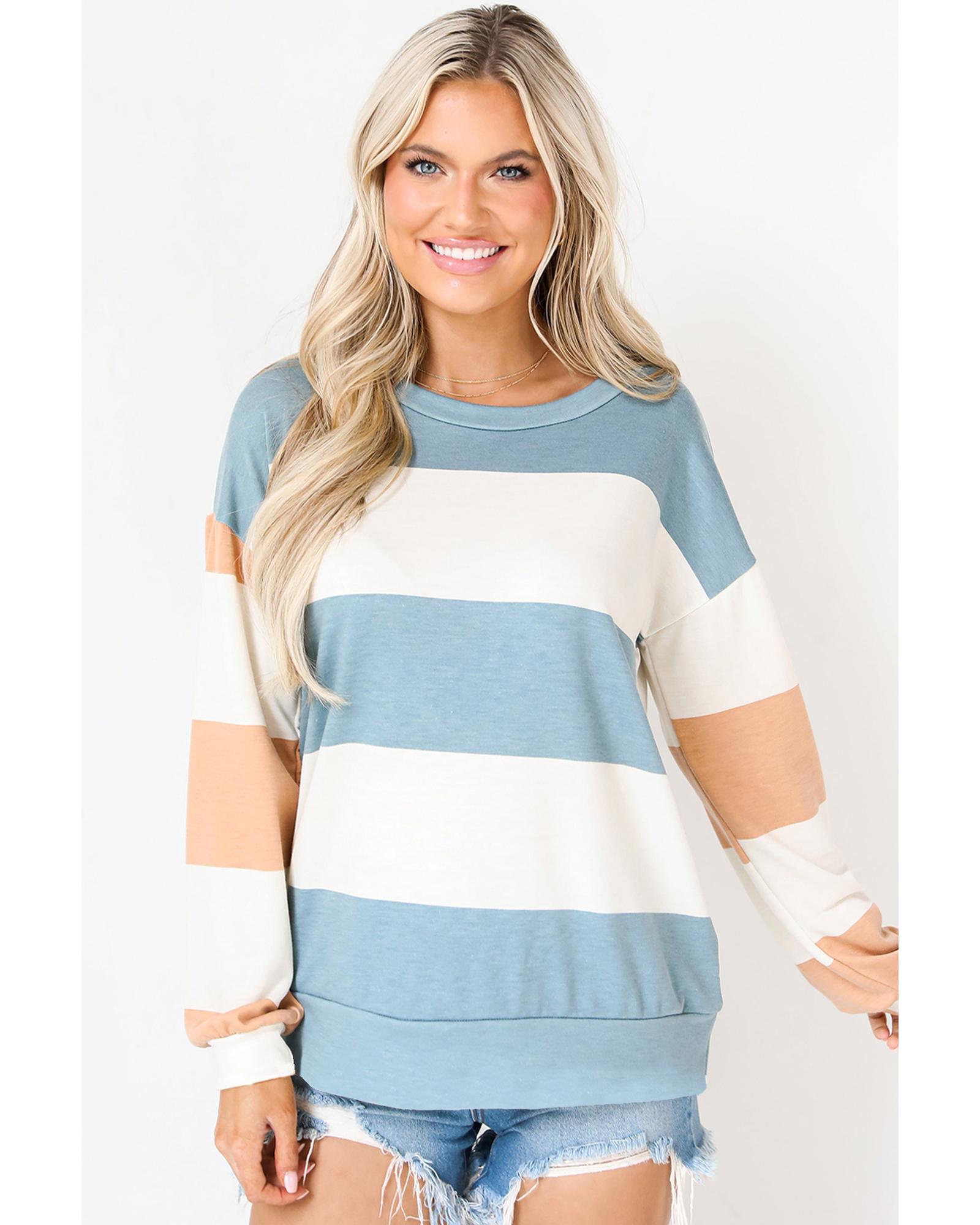 This light blue colorblock striped long sleeve top features a casual yet stylish silhouette with a modern aesthetic. Its trendy drop shoulder design and bold colorblock stripes make it a versatile addition to any wardrobe, suitable for various occasions and seasons.