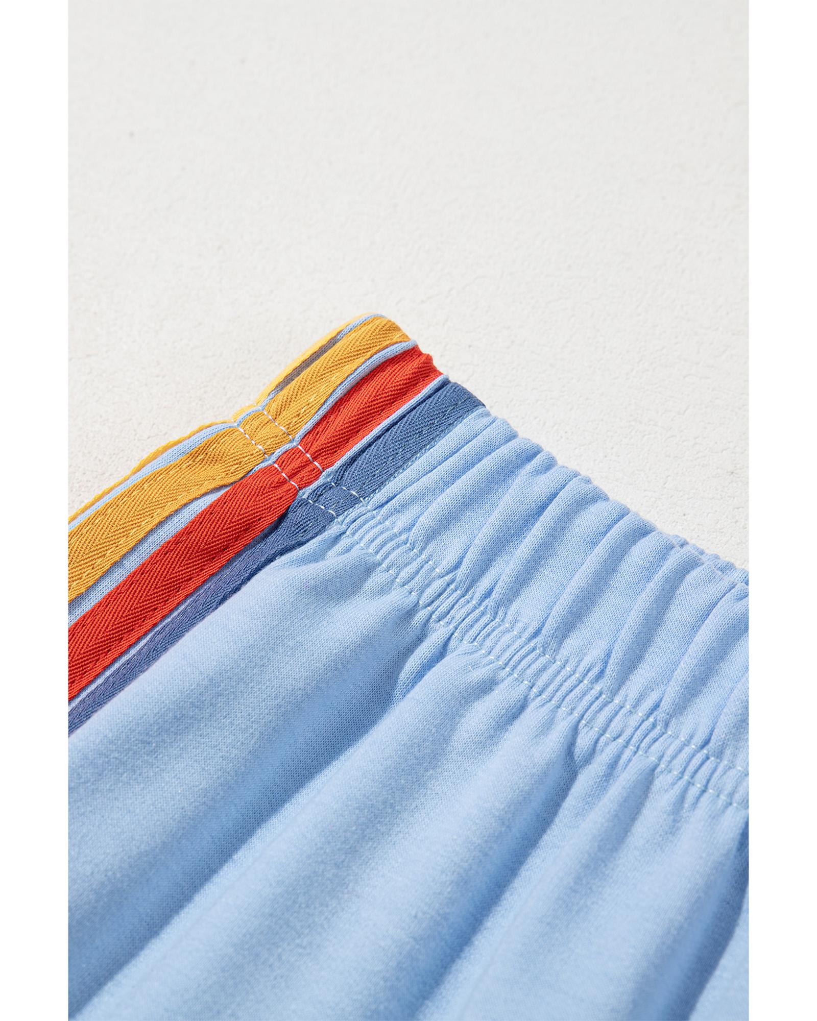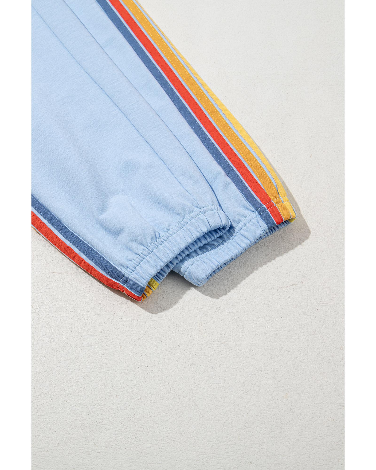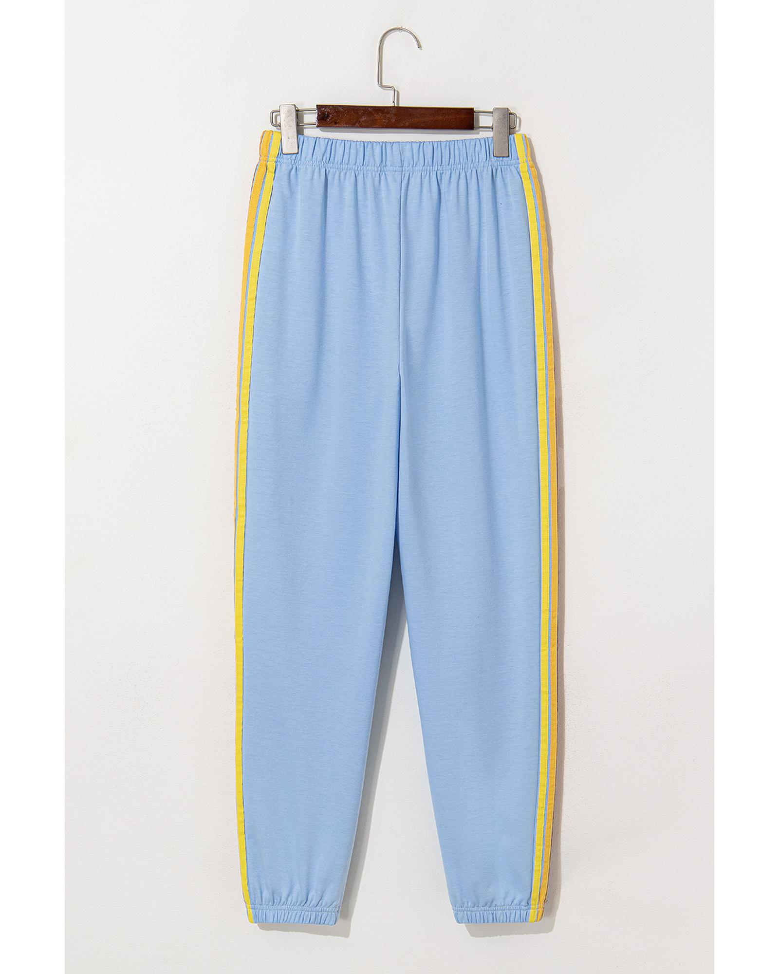 This pair of high waist sweatpants features a playful rainbow stripe design on the sides, offering a trendy and comfortable fit. Designed with an elastic waistband, these pants provide ease of movement and suit various body shapes. They are ideal for pairing with casual tops such as sweatshirts and hoodies for a stylish, relaxed look.
