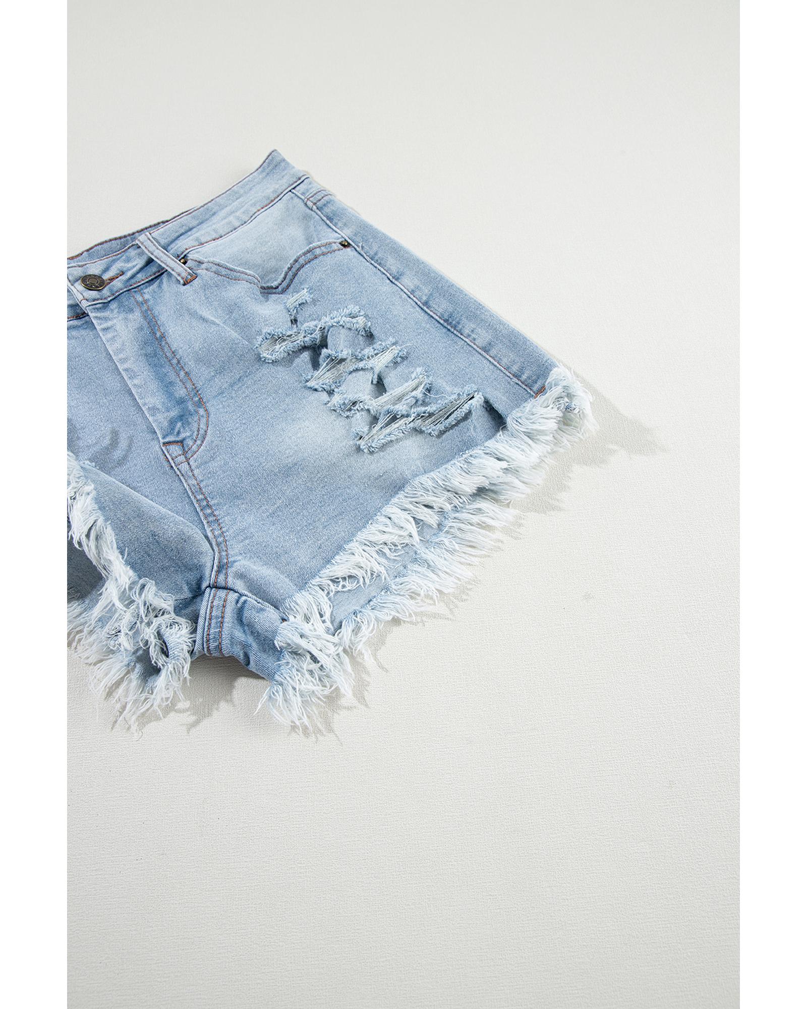 These light blue distressed ripped raw hem high waist denim shorts are designed to offer a trendy and fitted look. They feature a high waist silhouette that accentuates the figure, combined with edgy distressed details and a raw hem for a fashionable appearance. Made from premium denim, these shorts provide both comfort and durability, making them suitable for casual and stylish wear.