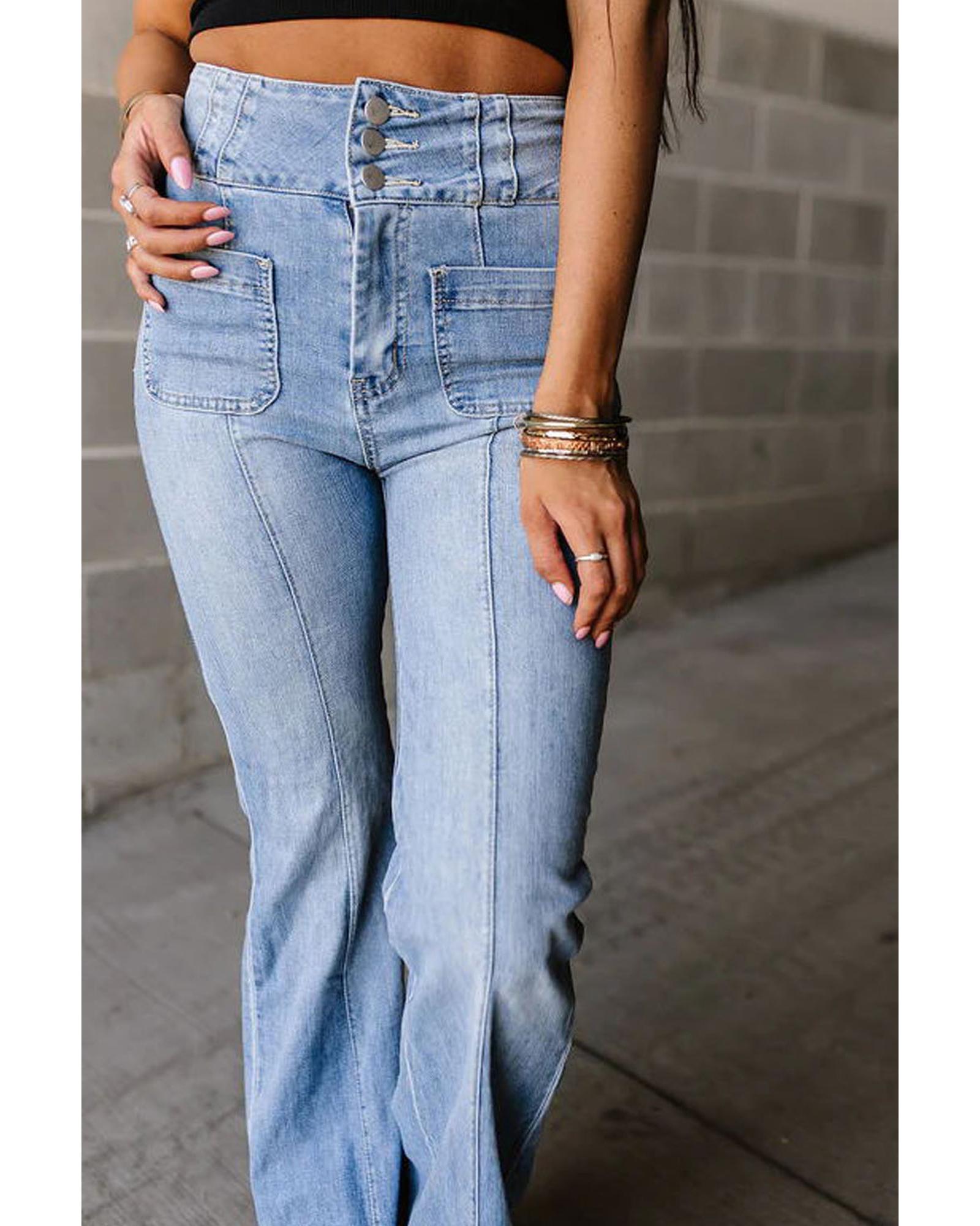 This pair of light blue flare jeans features an exposed seam design and patched pockets, offering a trendy and retro-inspired look. The high waist and fitted style provide a flattering silhouette, making them a versatile addition to your wardrobe.