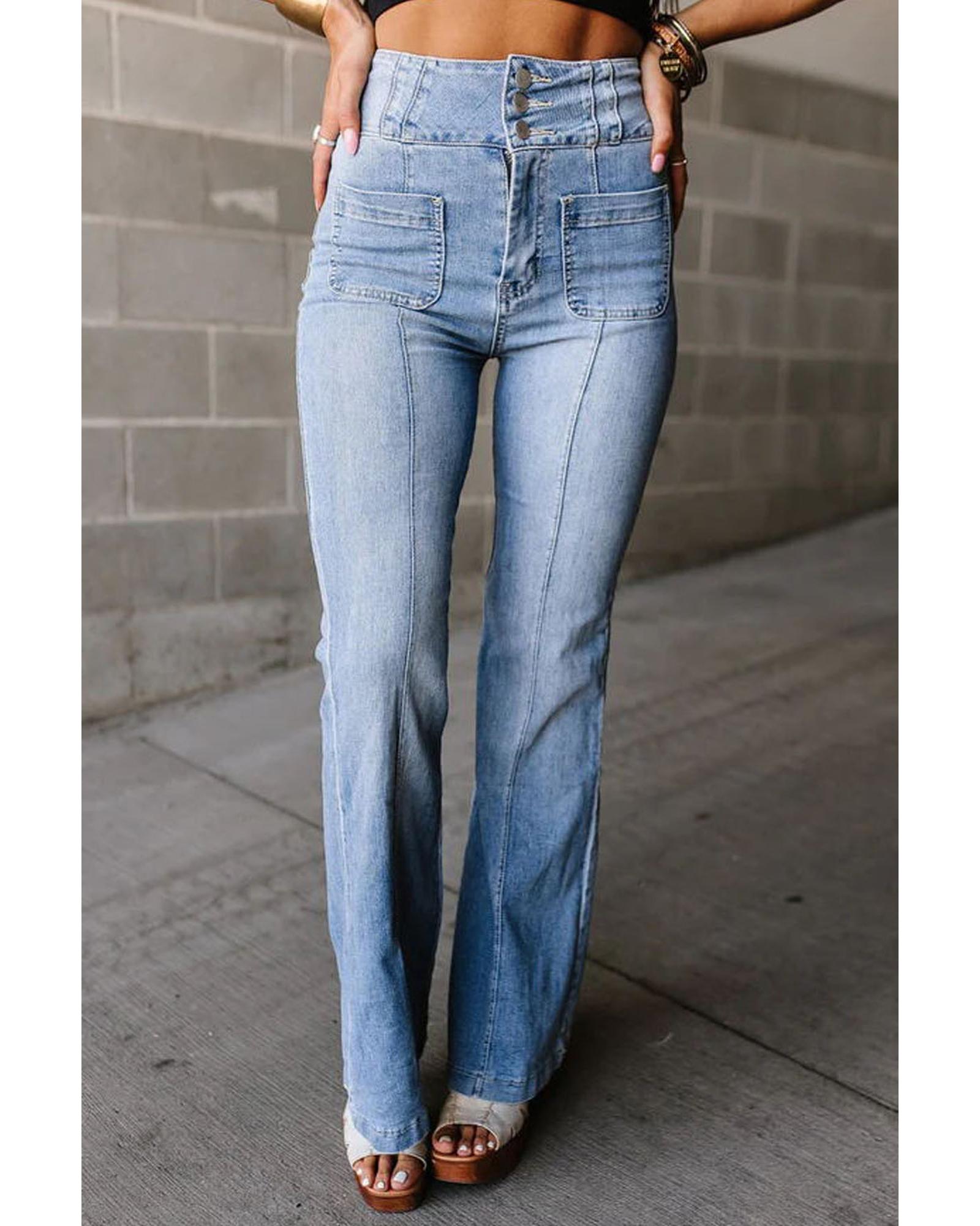 These flare jeans feature a trendy fitted design with a high waist and exposed seam detailing. Made from durable denim fabric, they offer a retro-inspired look with convenient front pockets. Available in various sizes, they are designed to provide a flattering fit with high elasticity for comfort.