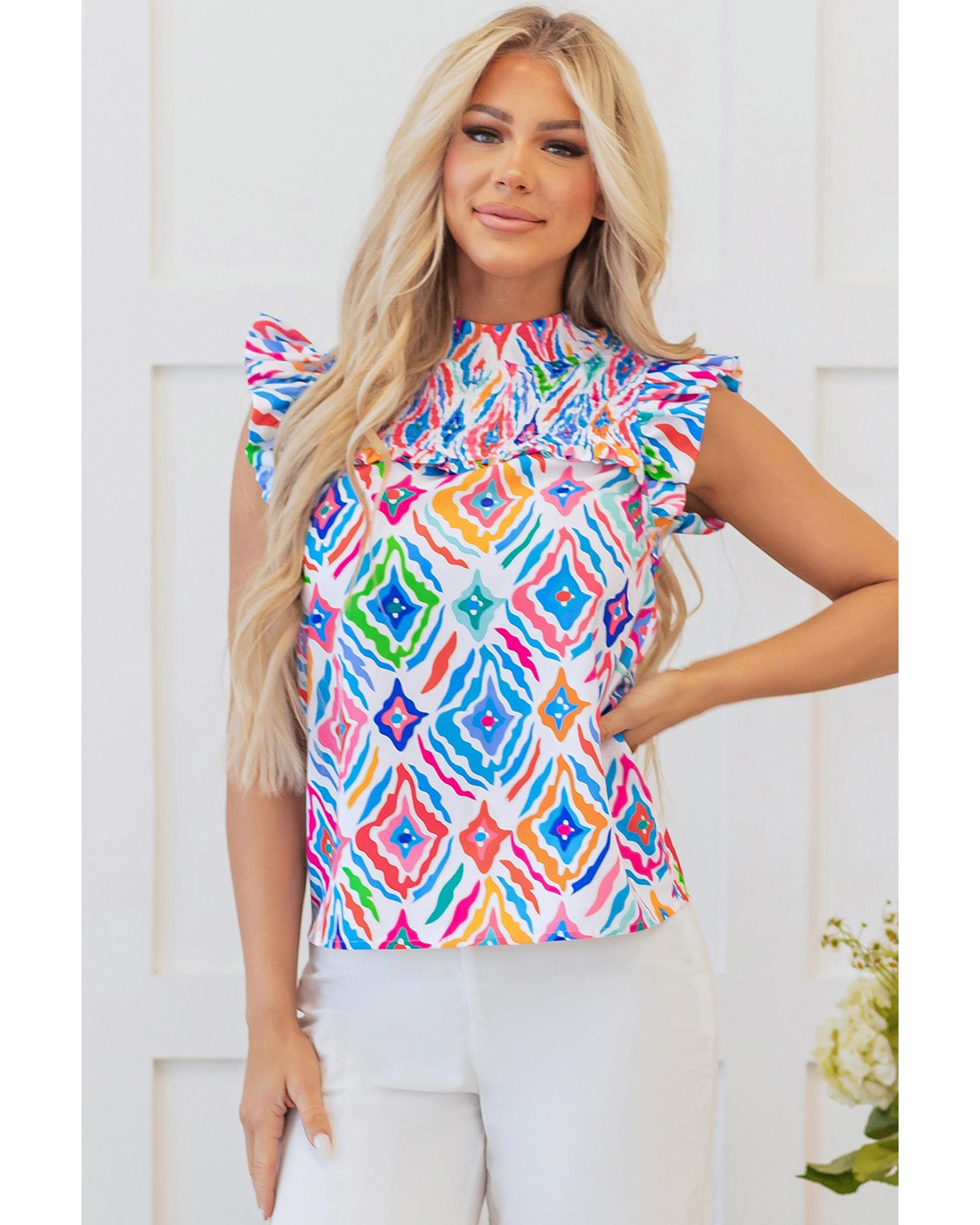 Light Blue Geometric Printed Flutter Sleeve Mock Neck Shirred Blouse – L