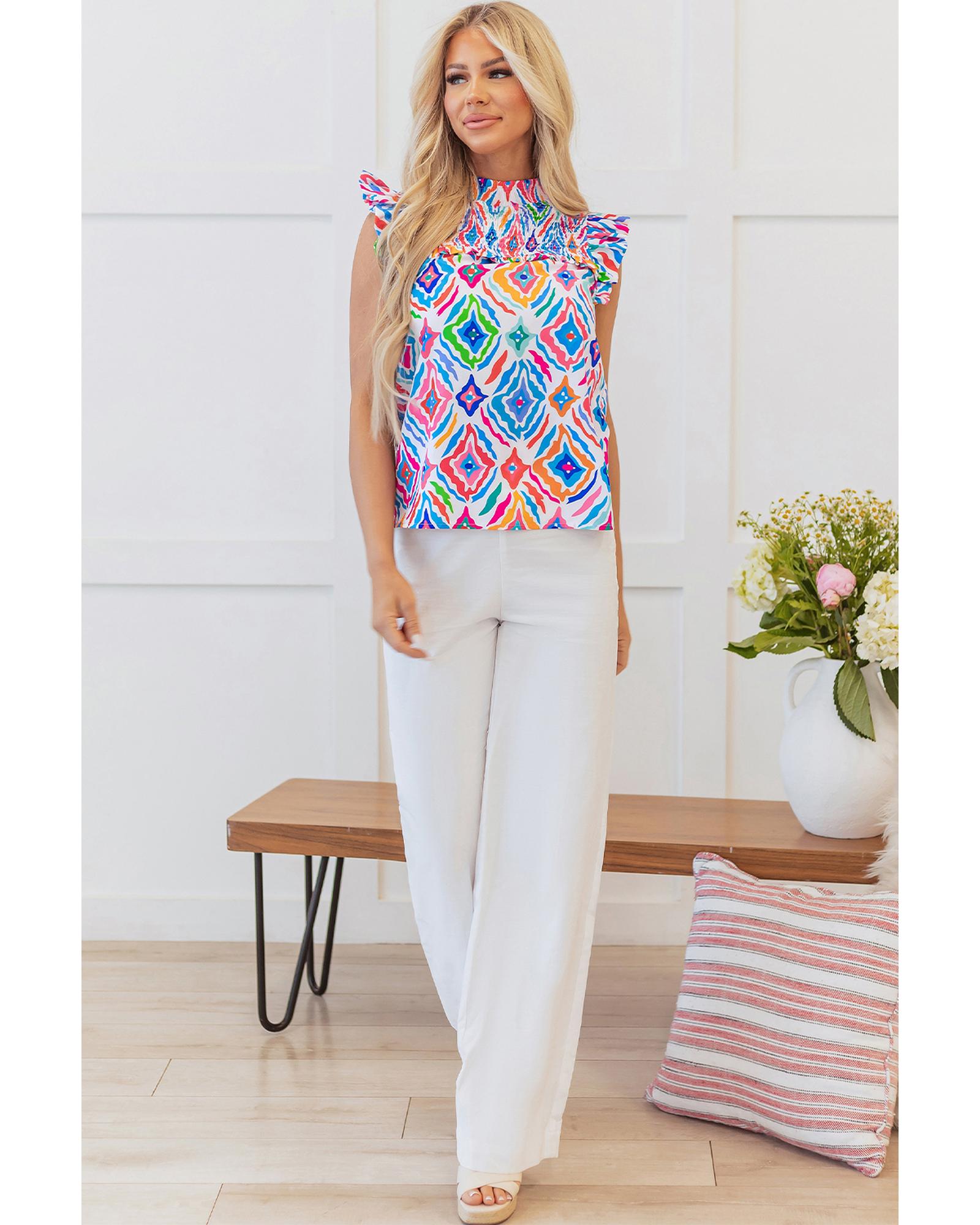 This light blue blouse features a geometric print and a stylish design that combines elegance and comfort. The flutter sleeves add a graceful touch, while the mock neck provides a sophisticated look. Shirred accents create a gathered, textured effect, making this blouse a versatile addition to your wardrobe.