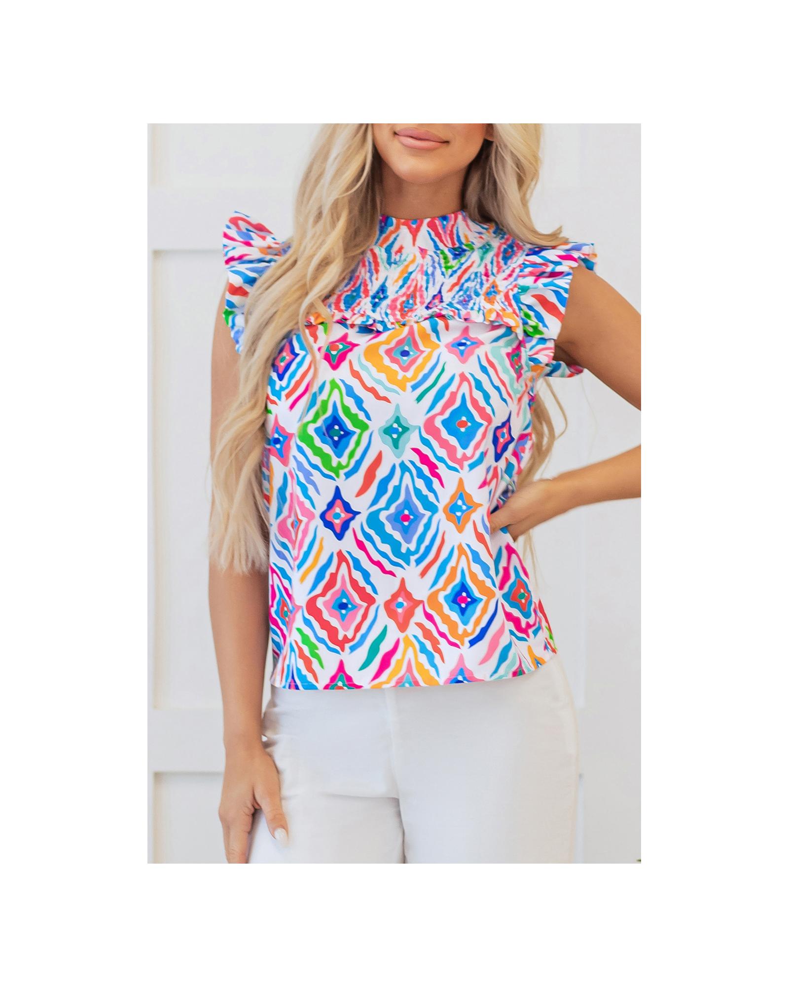 This light blue blouse features a geometric print and a stylish design that combines elegance and comfort. The flutter sleeves add a graceful touch, while the mock neck provides a sophisticated look. Shirred accents create a gathered, textured effect, making this blouse a versatile addition to your wardrobe.
