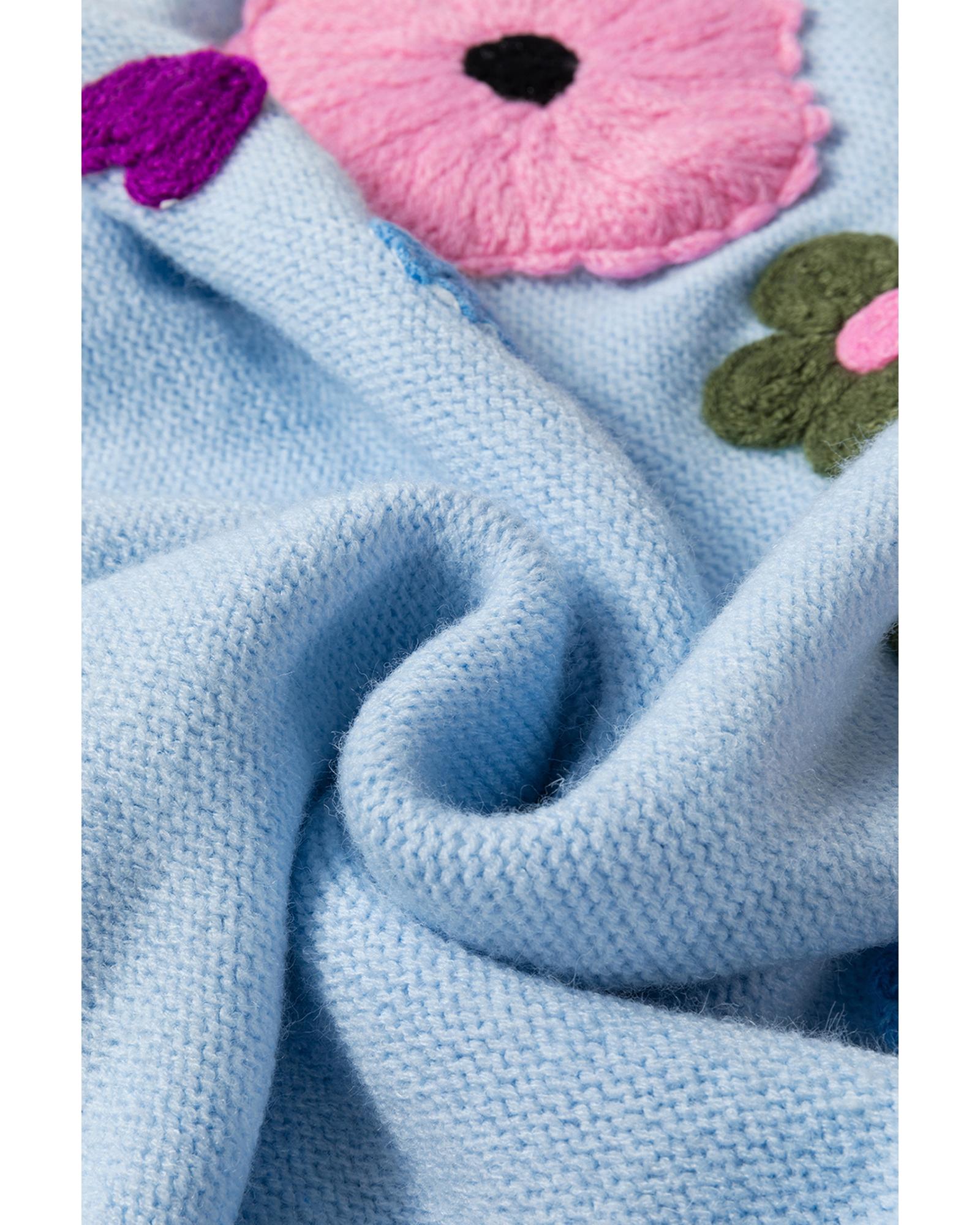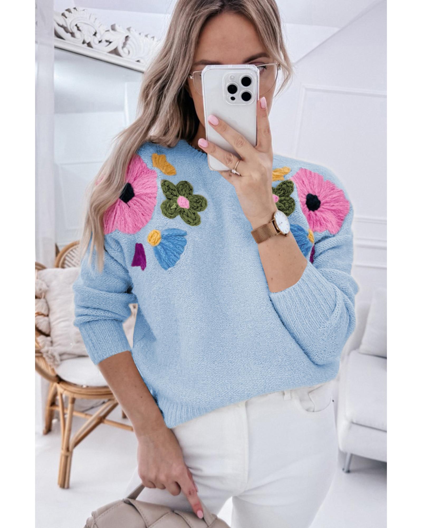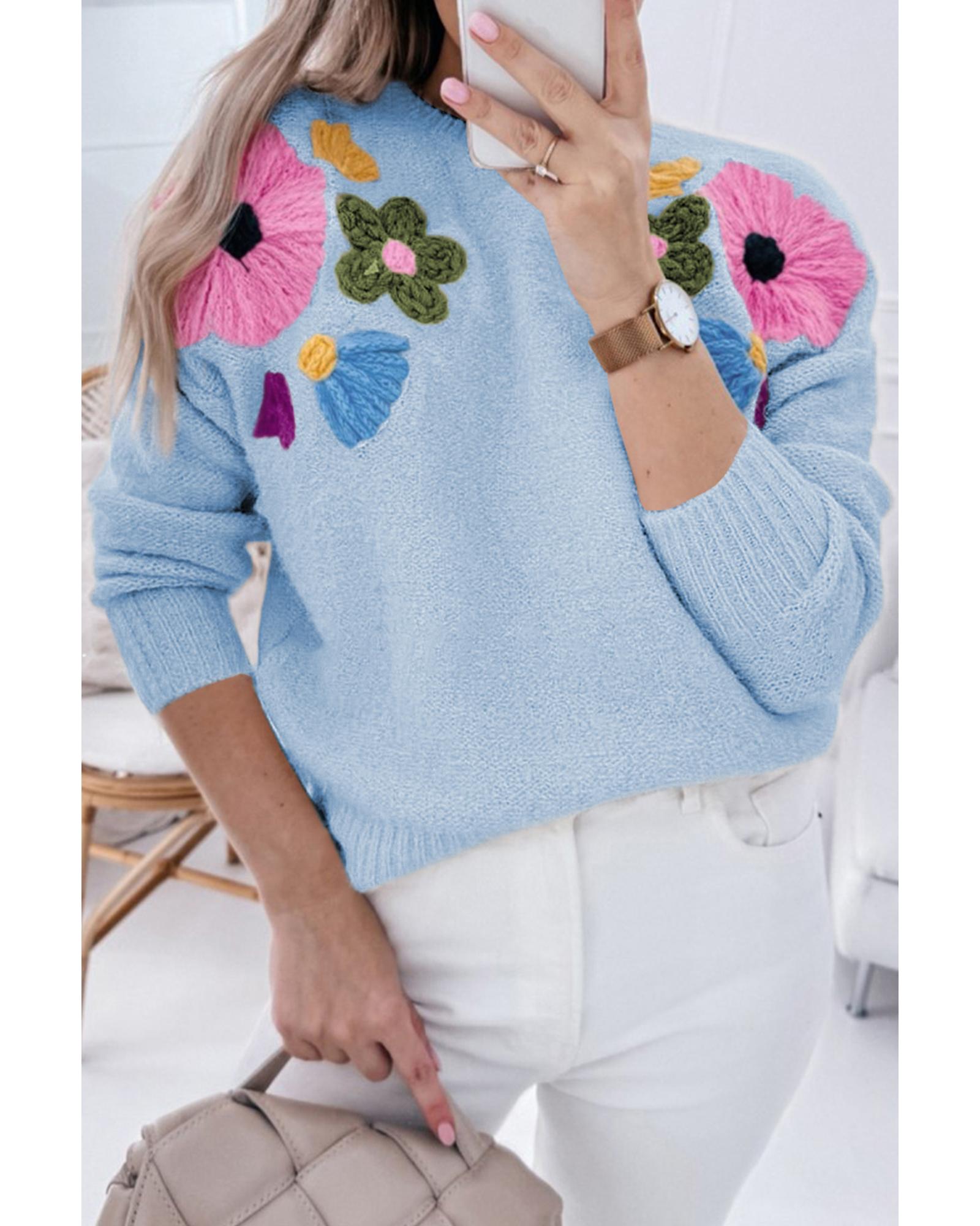This light blue knitted sweater features a charming flower pattern and a ribbed edge design, combining a whimsical and modern aesthetic. The classic crew neck and loose fit provide both style and comfort, making it suitable for various casual occasions.