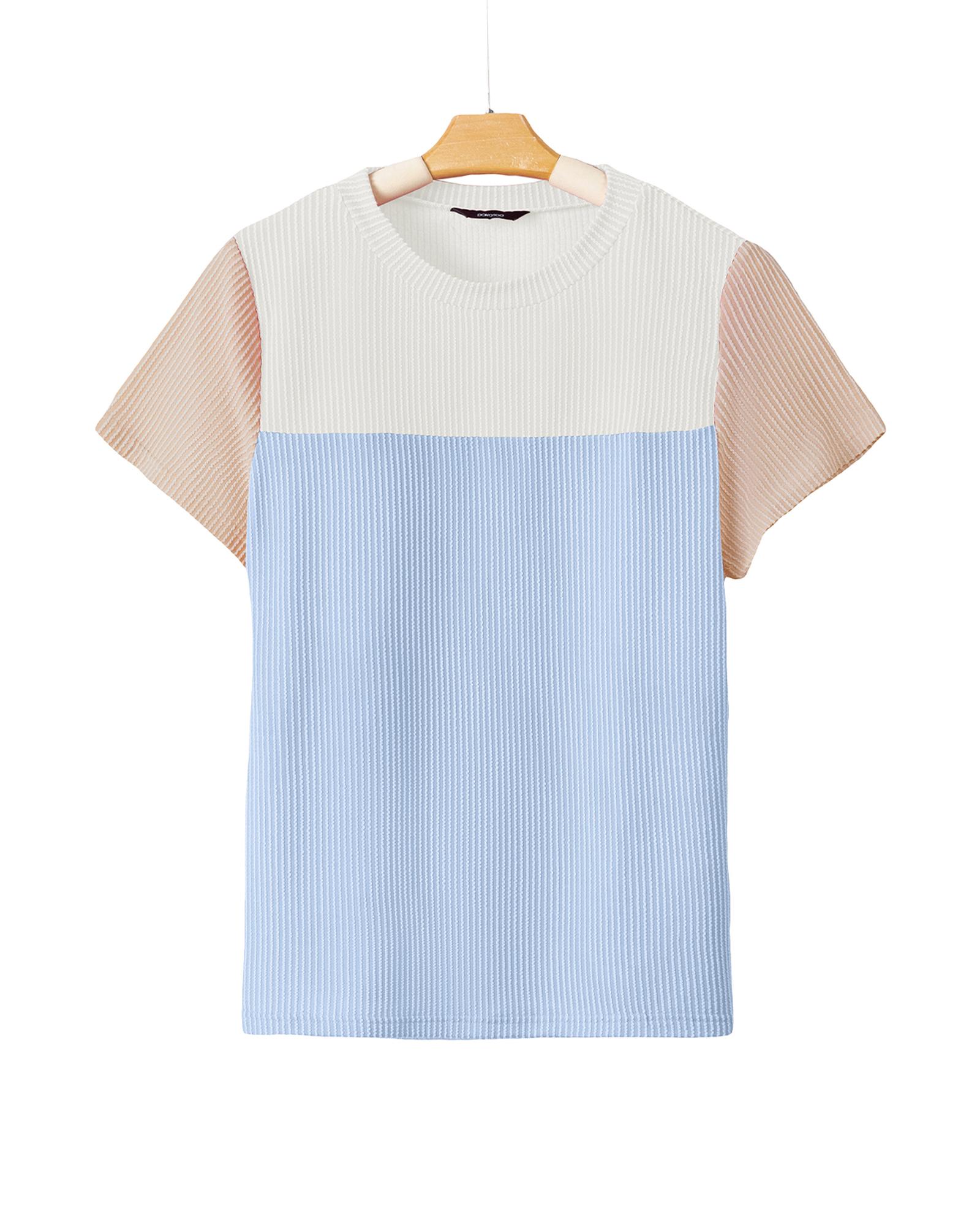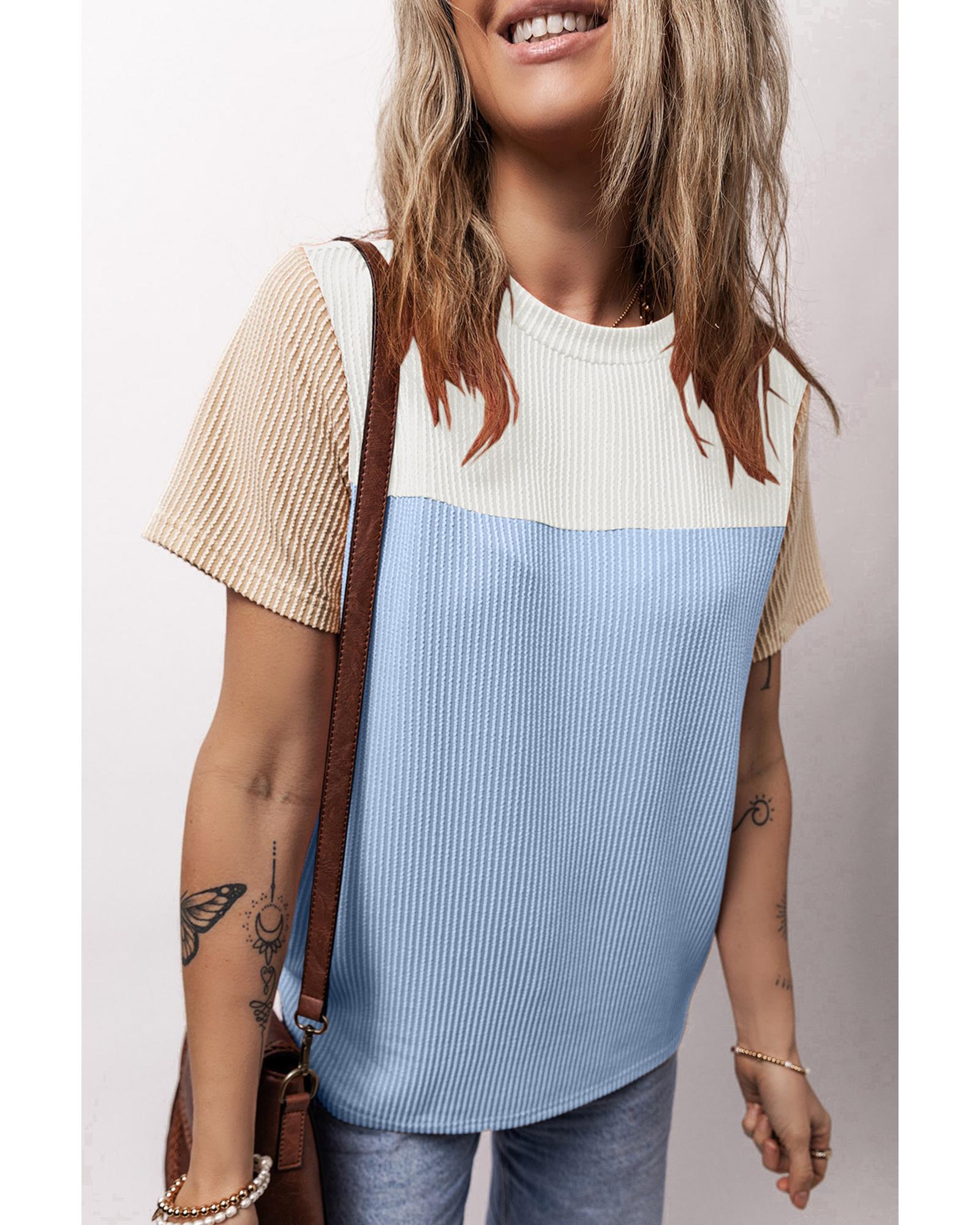 This light blue rib textured colorblock T-shirt features a trendy fitted design suitable for various occasions. Made from a soft, comfortable fabric blend, it offers a stylish and versatile look for everyday wear.