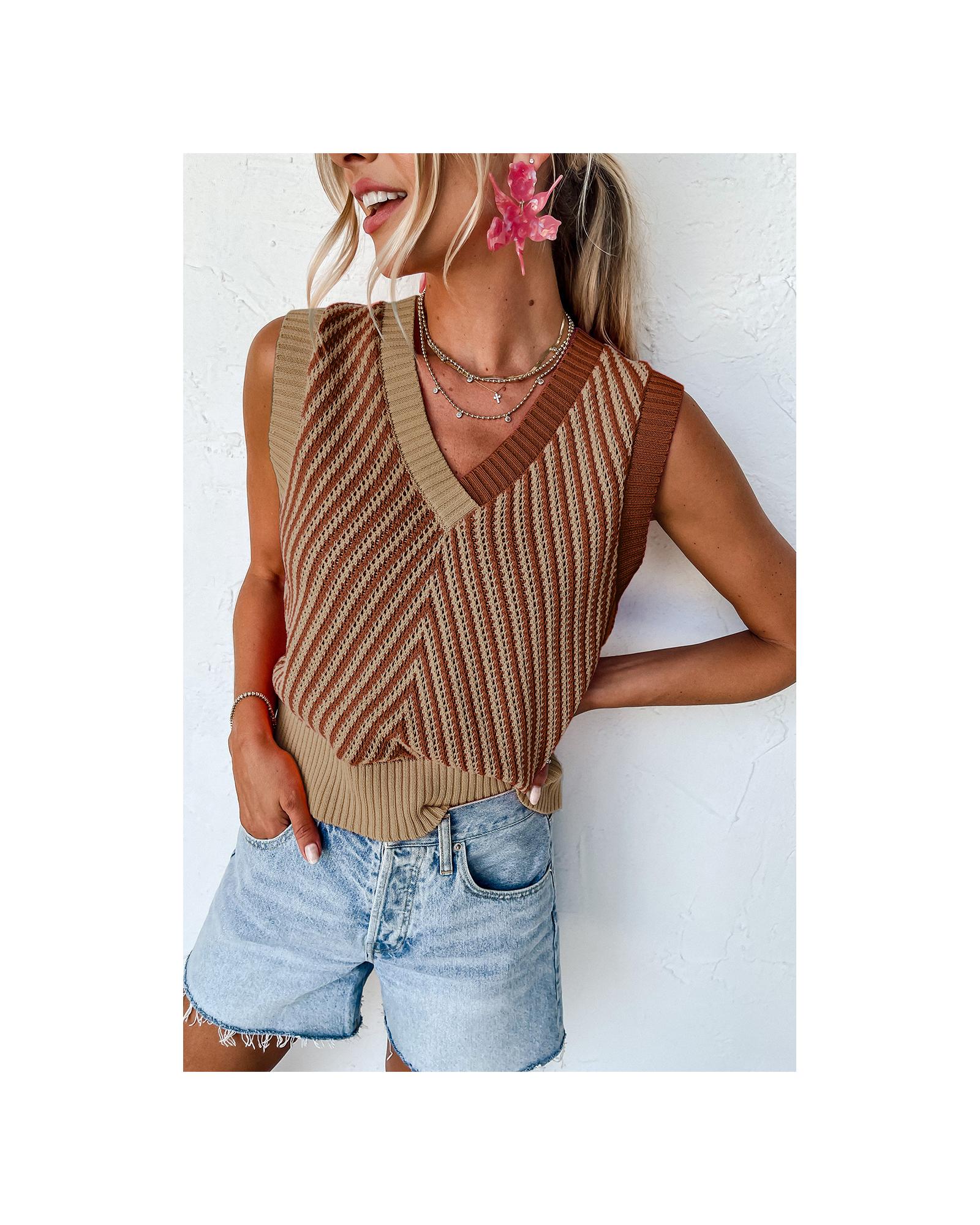 This stylish sweater vest features a trendy fitted silhouette with a contrasting chevron knit pattern. Its textured, fine-quality knitting and V-neck design make it a versatile addition to any wardrobe. The ribbed trim adds structure, while the sleeveless style offers a chic look suitable for various outfits.