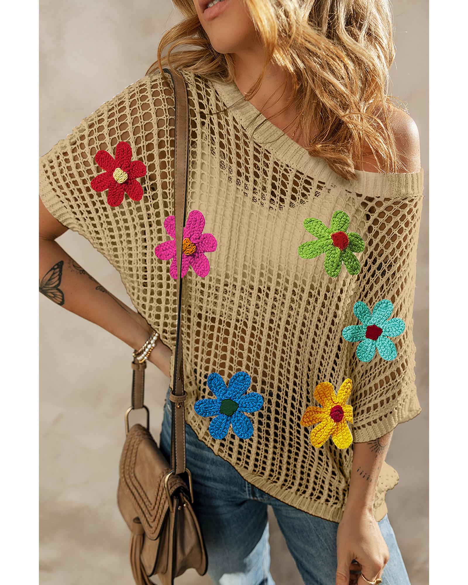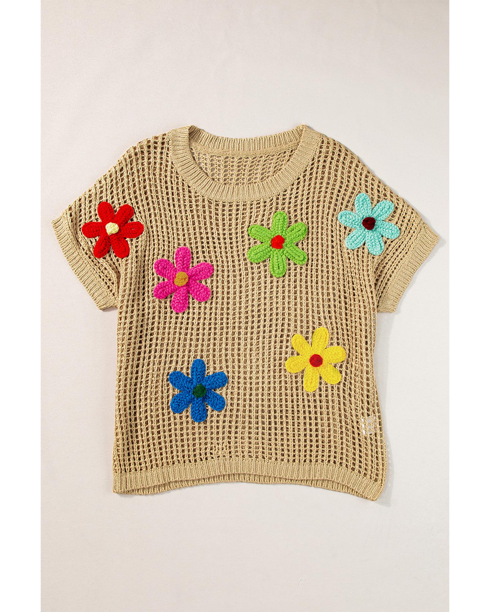 - 1 Light French Beige Crochet Flower Hollow-out Sweater T Shirt