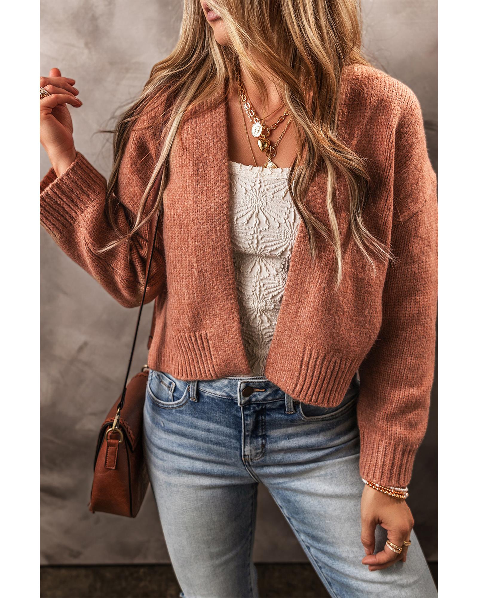 This light French beige cropped cardigan features a trendy open front design with a drop shoulder silhouette, making it a versatile addition to any wardrobe. Its concise silhouette and cropped cut create a fashionable and romantic look, perfect for layering over various outfits. Crafted with high elasticity, it offers a comfortable fit suitable for different body types.