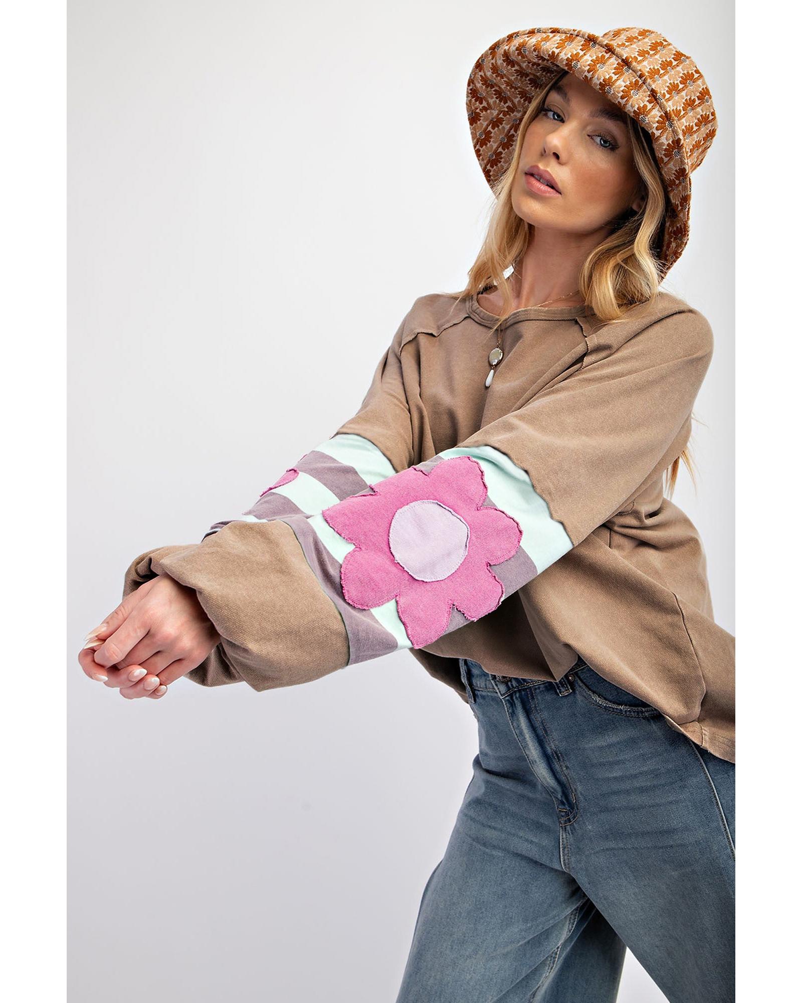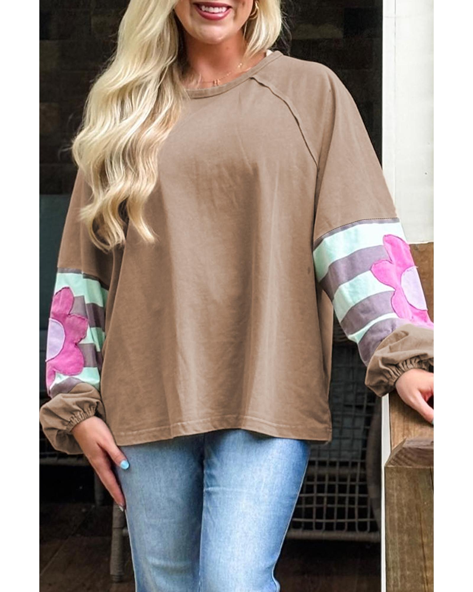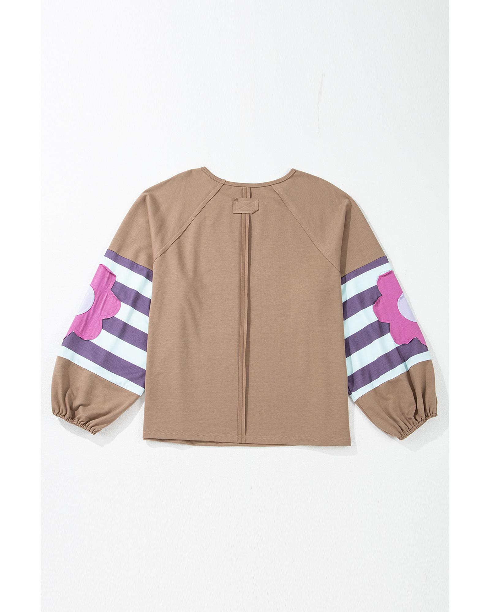 Light French Beige Flower Striped Patchwork Puff Sleeve Loose Sweatshirt – 3X