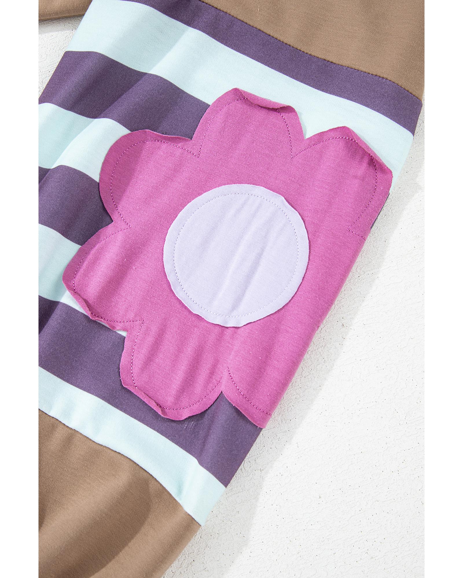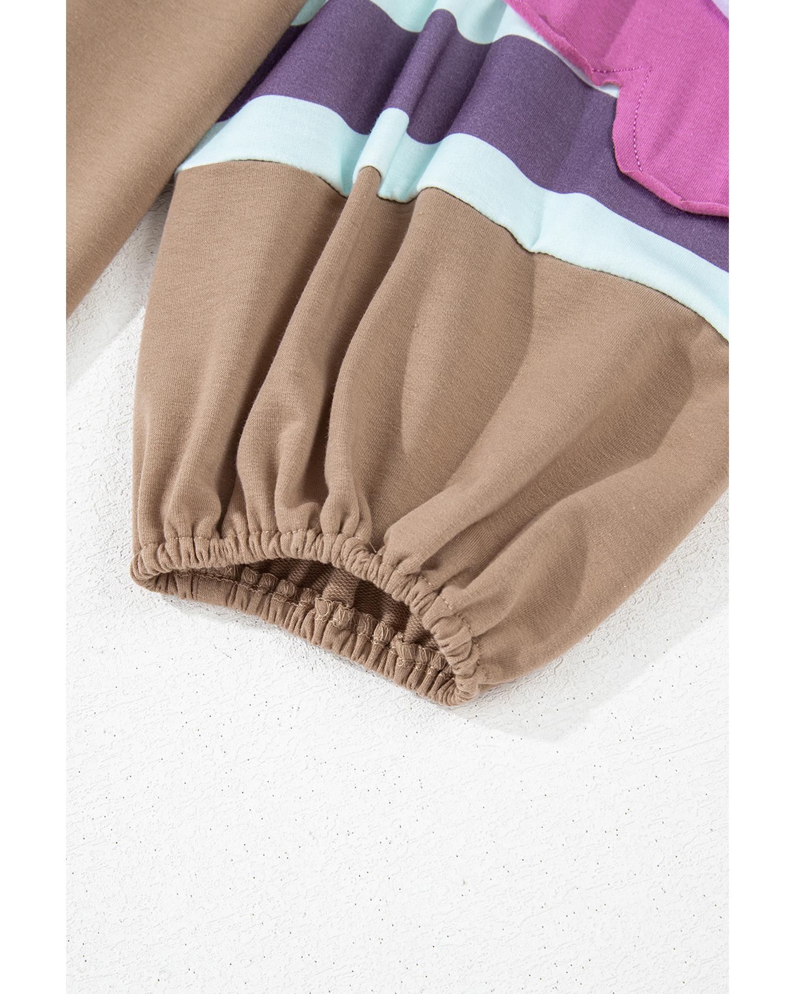 This sweatshirt features a trendy loose fit with a stylish flower striped patchwork design. It is perfect for casual outings or relaxing at home, offering both comfort and fashion. The puff sleeves add a fashionable touch, while the raglan sleeve construction enhances the overall look. Designed with medium elasticity, it provides a comfortable wearing experience.