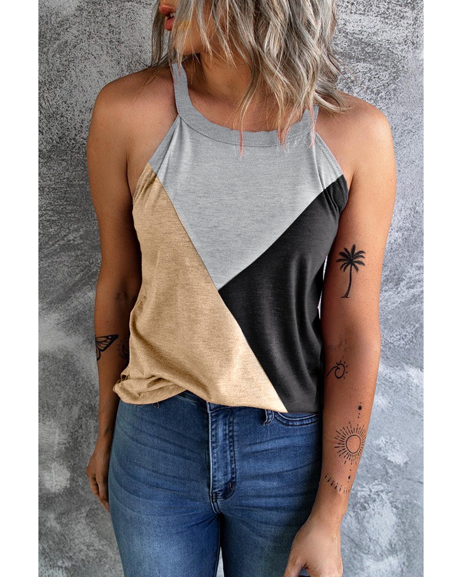 This sleeveless top features a stylish geometric color block design on the front, offering a trendy and modern look. Made from soft and breathable fabric, it provides comfort for everyday wear. Suitable for layering or wearing alone, this top is ideal for various casual and fashionable outfits.