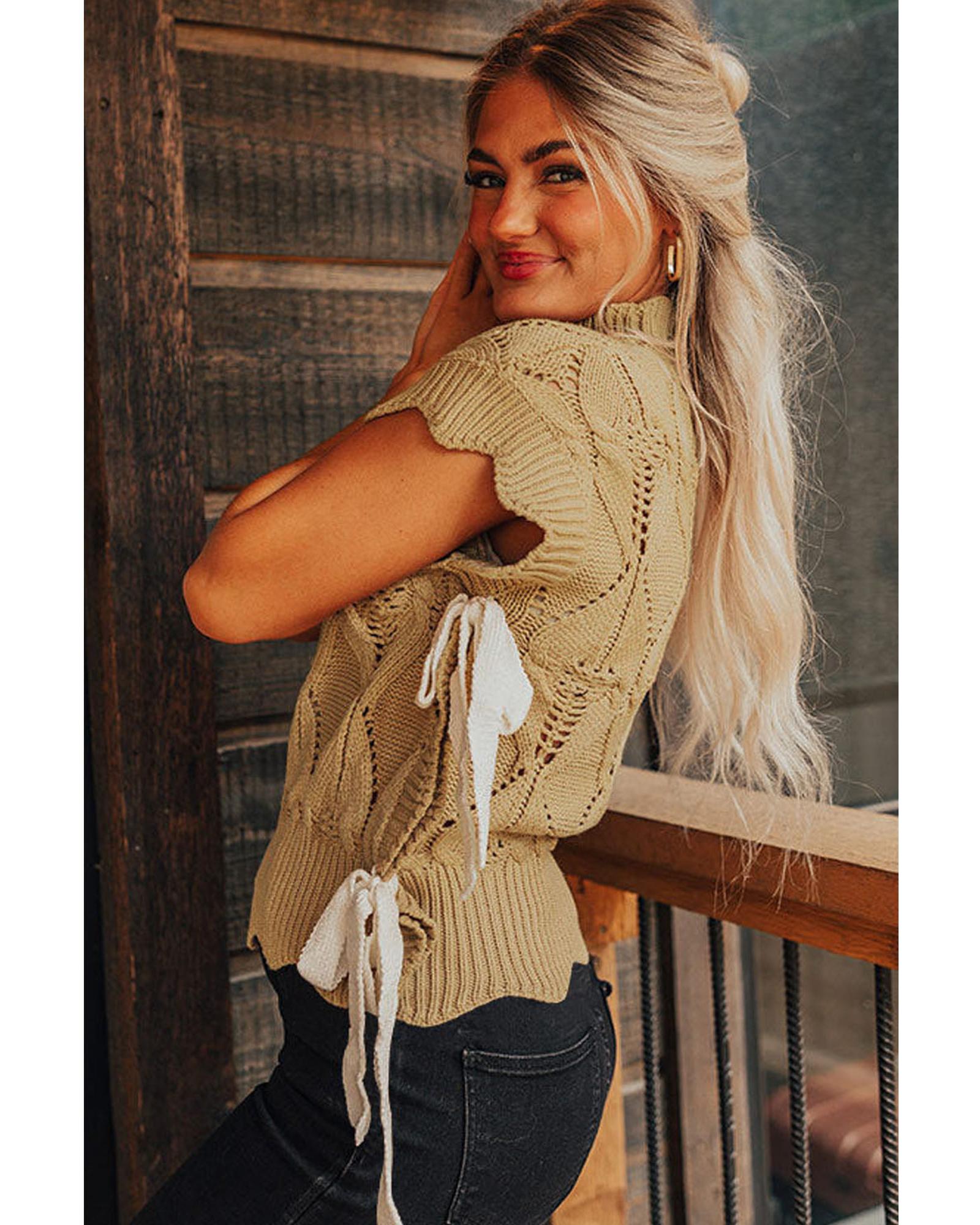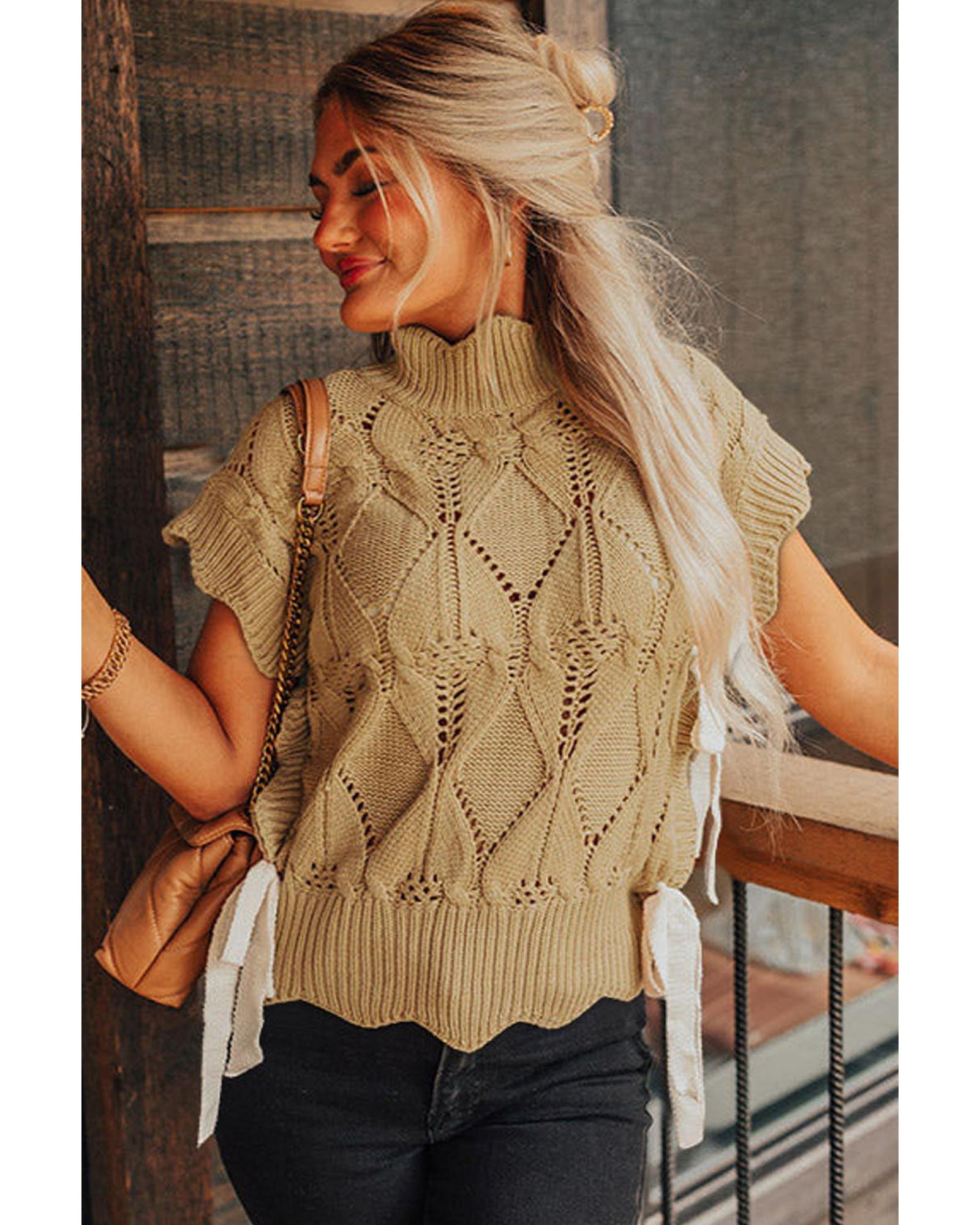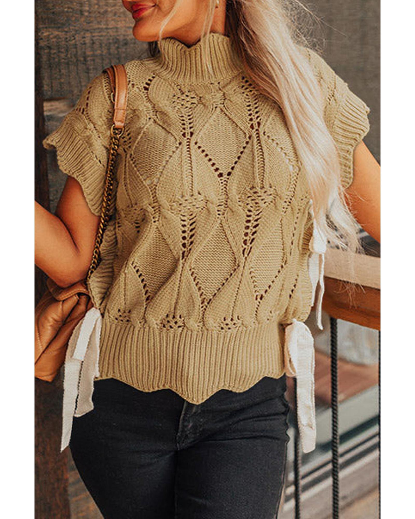 This high-neck sweater features a trendy fitted design with a relaxed yet flattering silhouette. Crafted with a hollowed knit pattern and scalloped trim details, it offers a chic and stylish look suitable for various outfits. The sweater is designed to be versatile and comfortable, making it a great addition to your wardrobe.