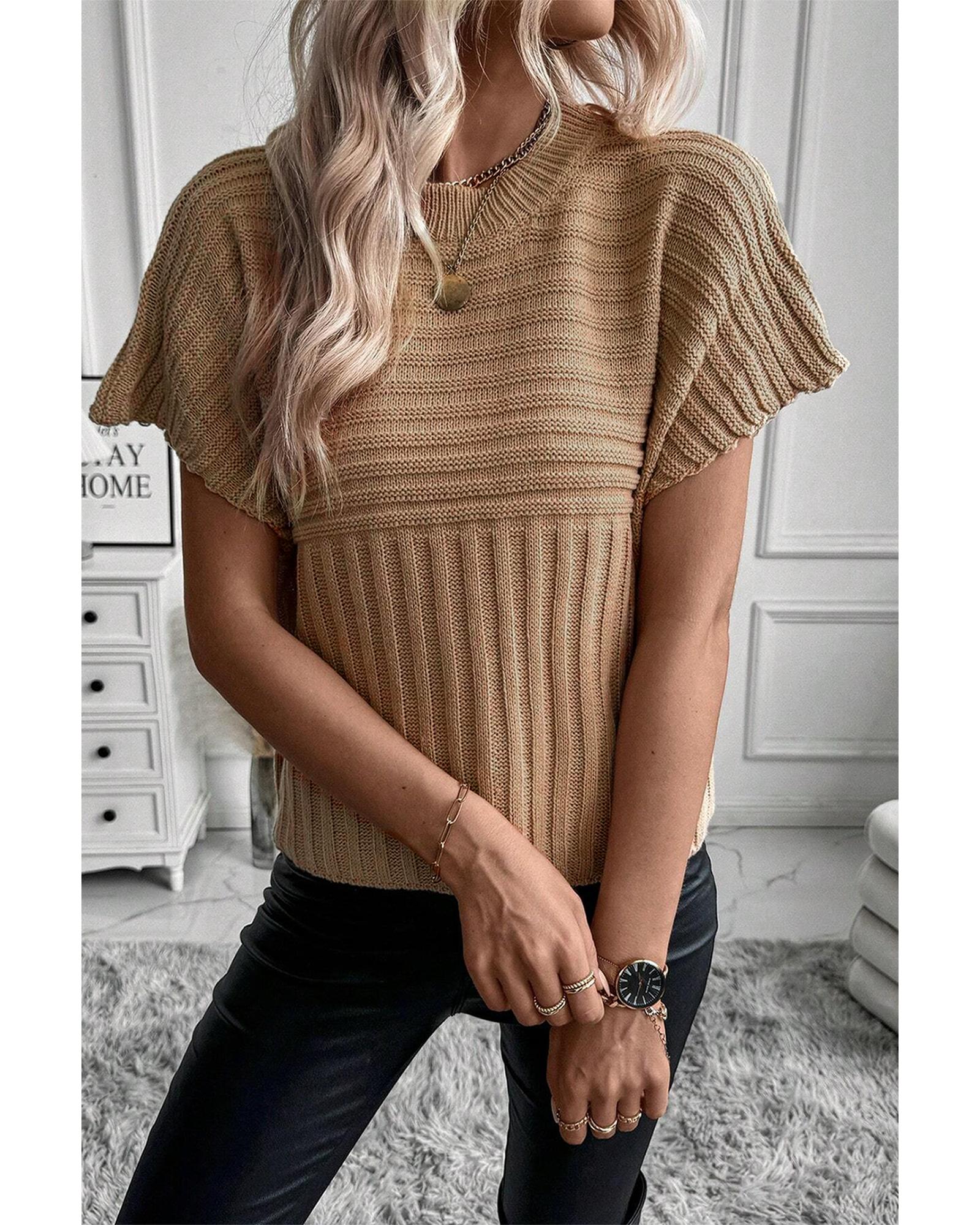 This Light French Beige Rib Knitted Wide Sleeve Sweater T Shirt offers a trendy and versatile casual style with a comfortable fit. Designed with a fashionable fitted look, it features soft rib knitted fabric and wide sleeves, making it suitable for various occasions and easy to pair with different outfits.