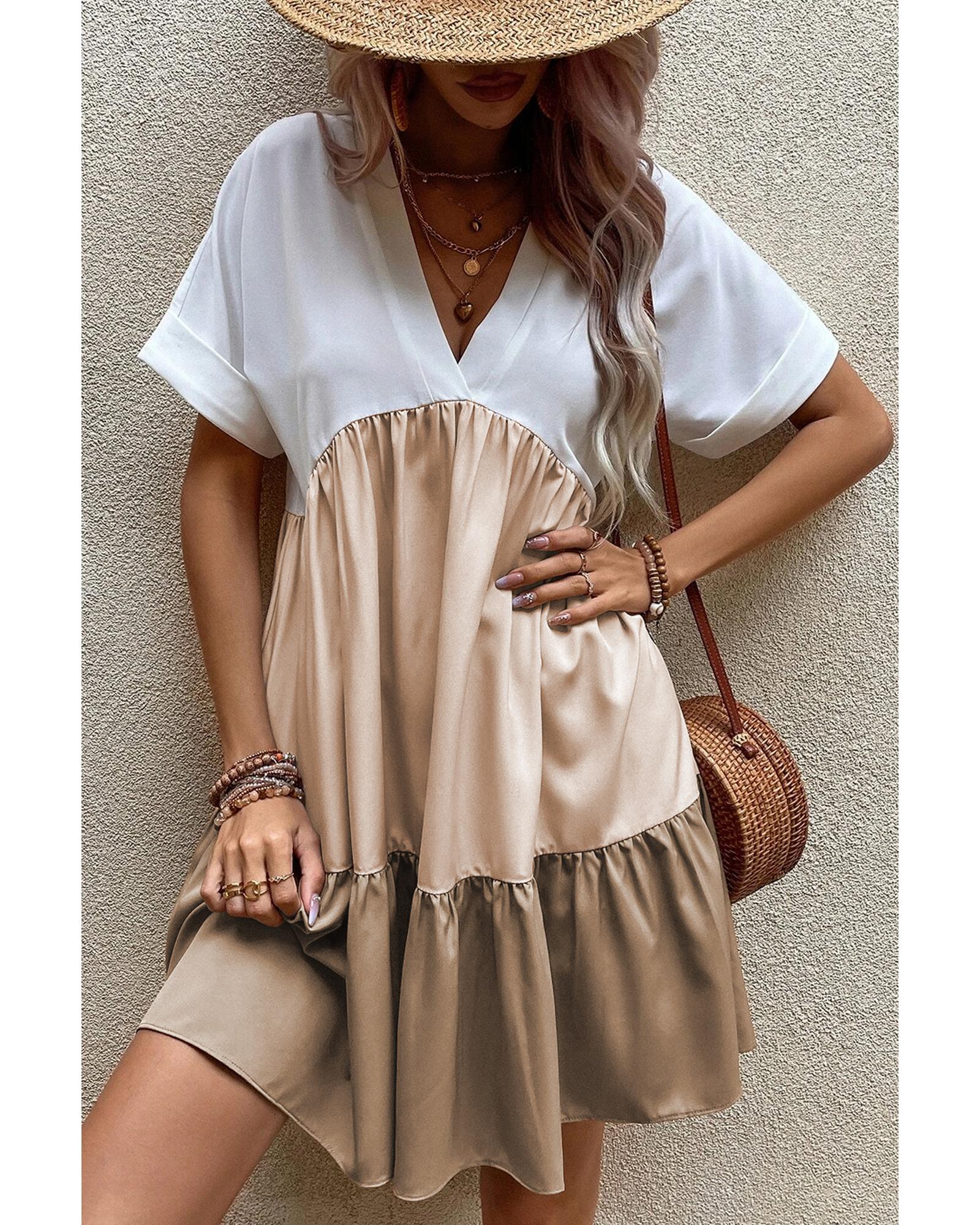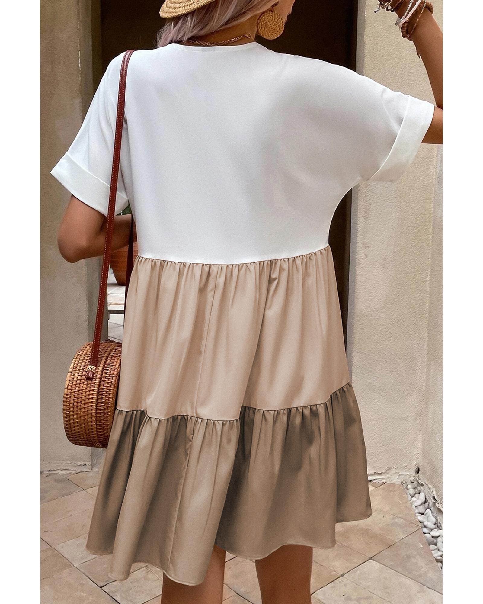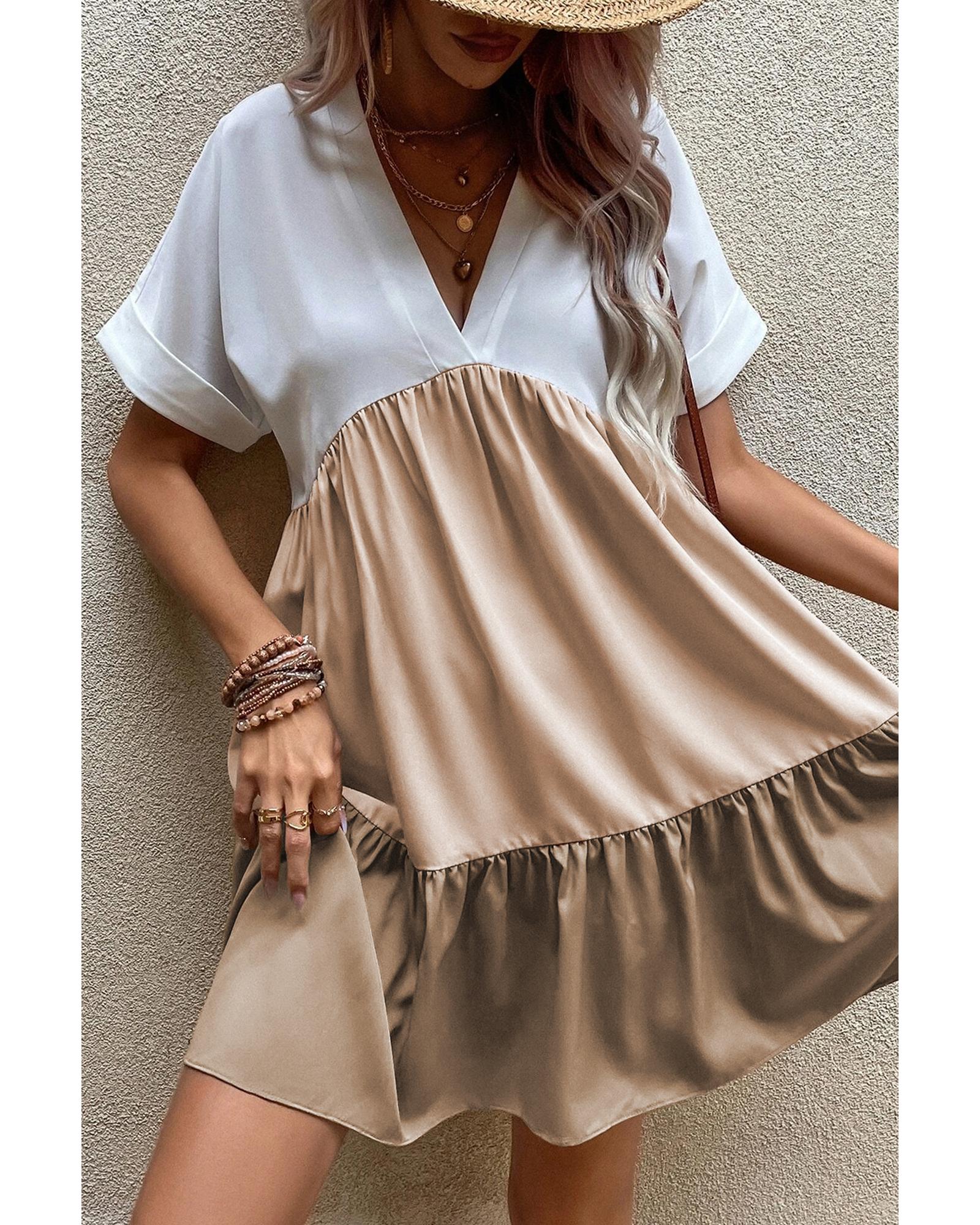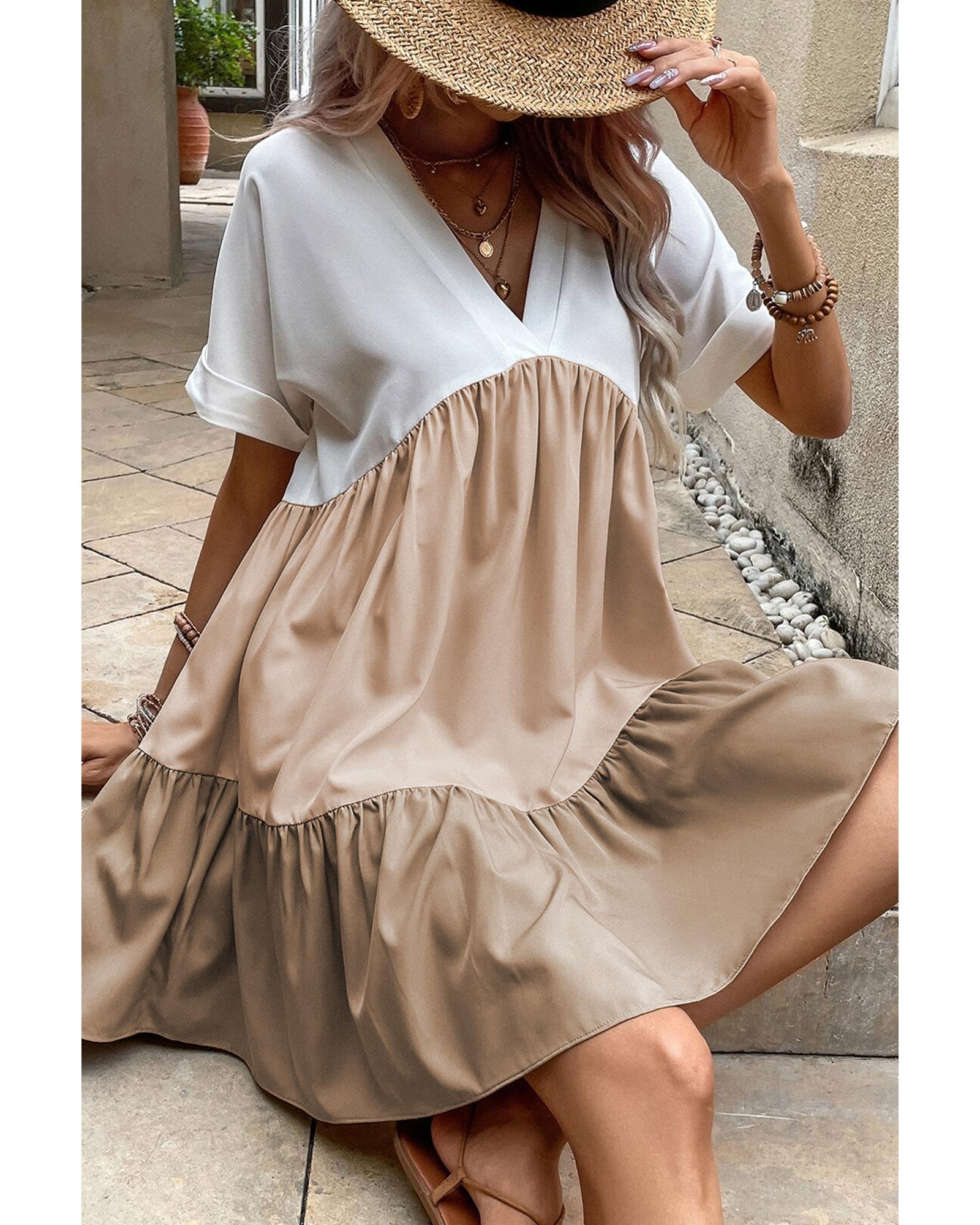 Light French Beige Triple Colors V Neck Folded Cuffs Tiered Loose Dress – M