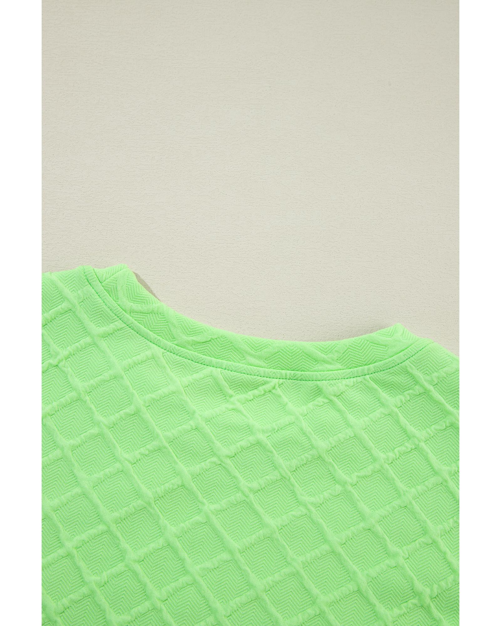 This outfit features a light green checkered textured tee paired with drawstring shorts, offering a stylish and comfortable casual look. The design incorporates modern elements with a textured pattern and adjustable waist for a personalized fit, making it suitable for various casual occasions.