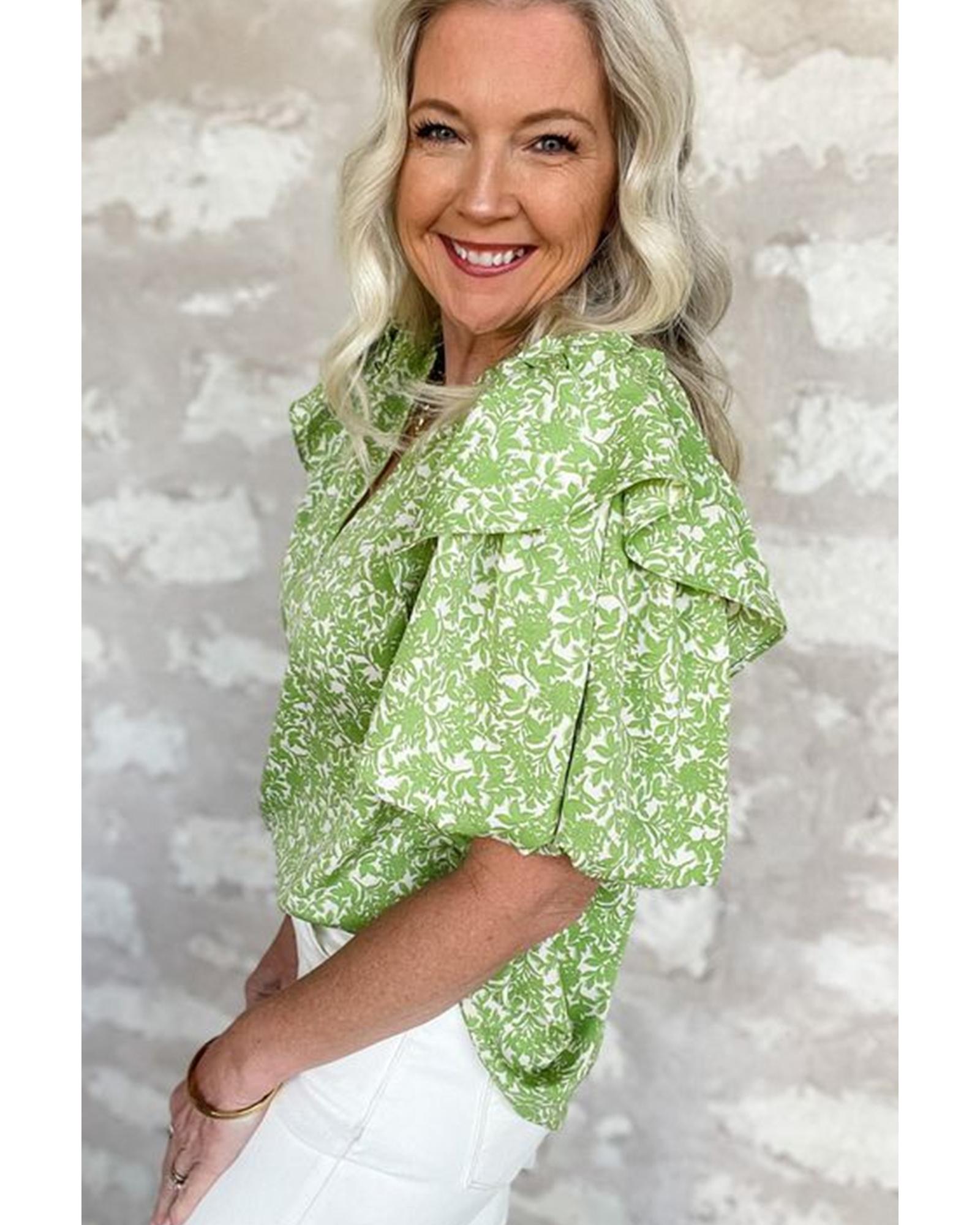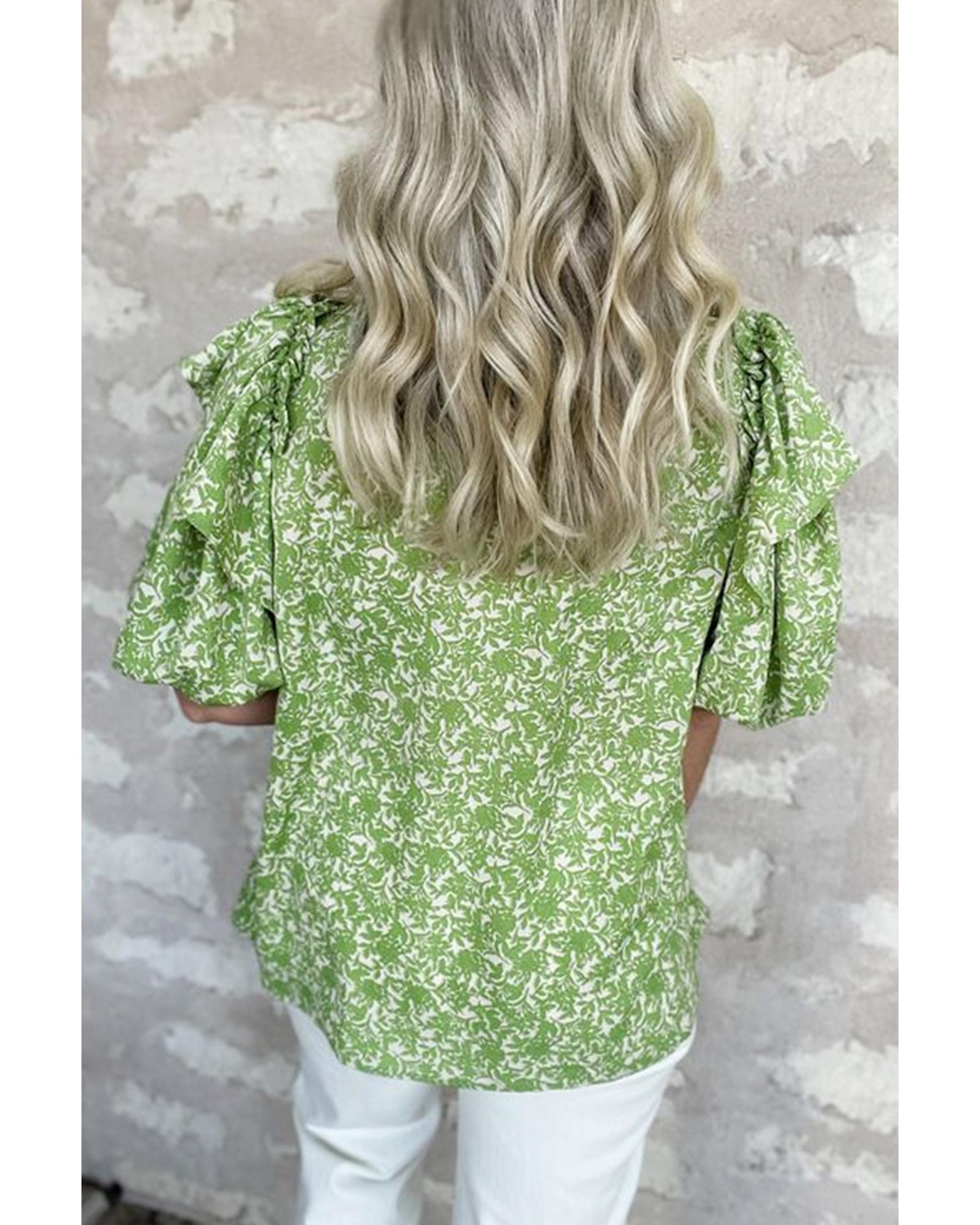 This light green floral blouse features a feminine design with a frilled collar and a flattering V-neckline. The puff short sleeves are accented with ruffle trim, adding a charming touch to the overall look. Made from 100% polyester, it offers a comfortable fit suitable for various occasions.