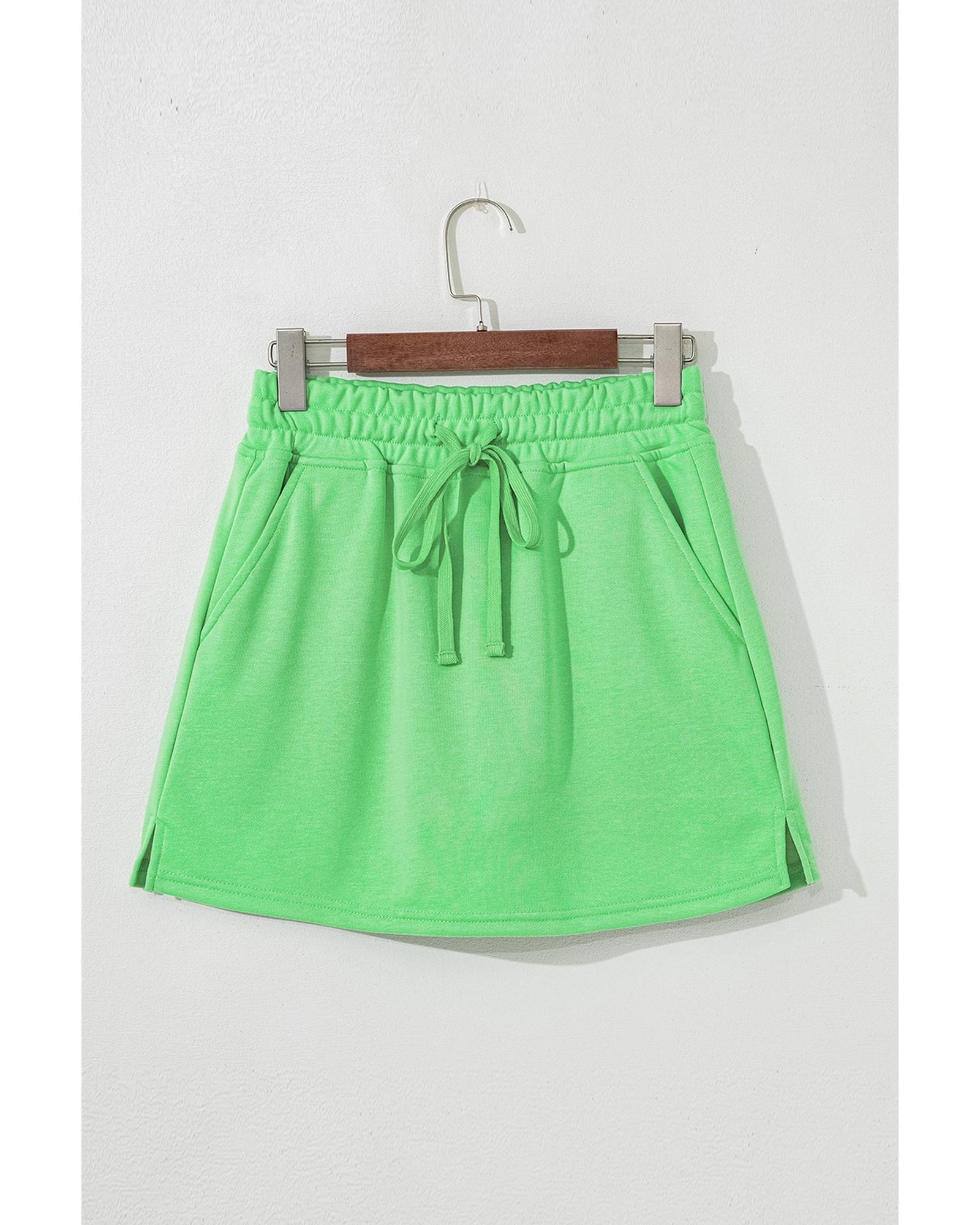 This light green French terry drawstring mini skort offers a comfortable and stylish option for everyday wear. It combines the look of a skirt with the practicality of shorts, making it a versatile addition to your wardrobe.