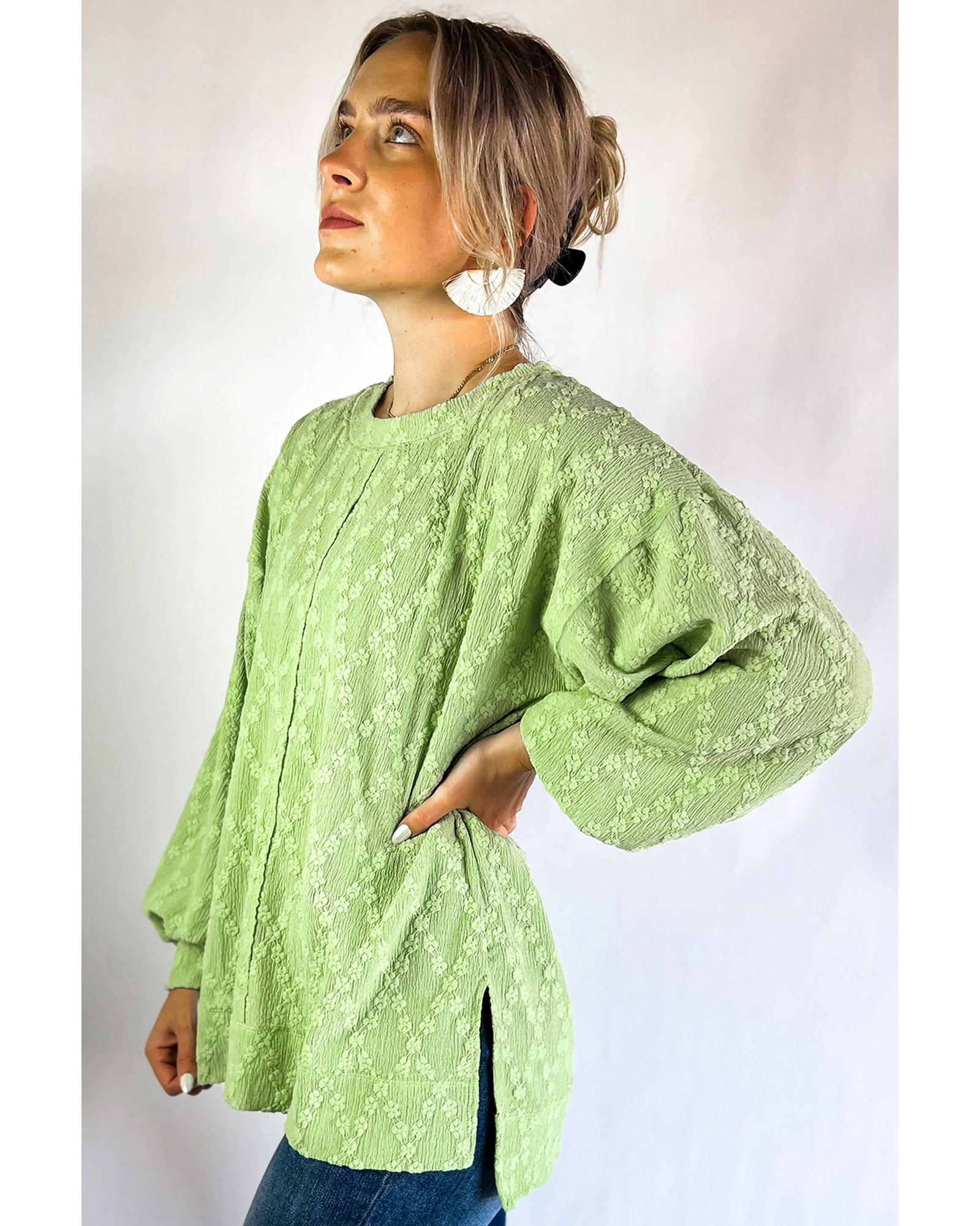 This light green textured blouse features a stylish side split detail and a classic crew neck design. Crafted from soft, comfortable fabric, it offers a relaxed fit with dropped shoulders, making it ideal for everyday wear. Its versatile style pairs well with jeans or leggings for a casual yet fashionable look.