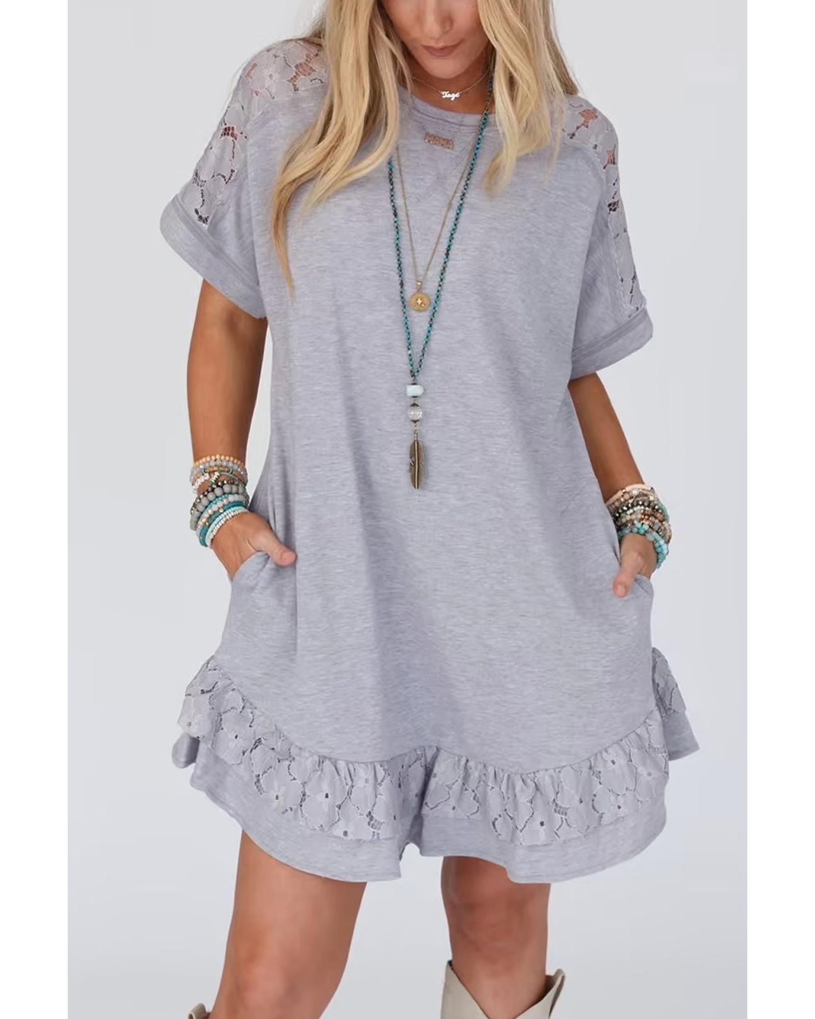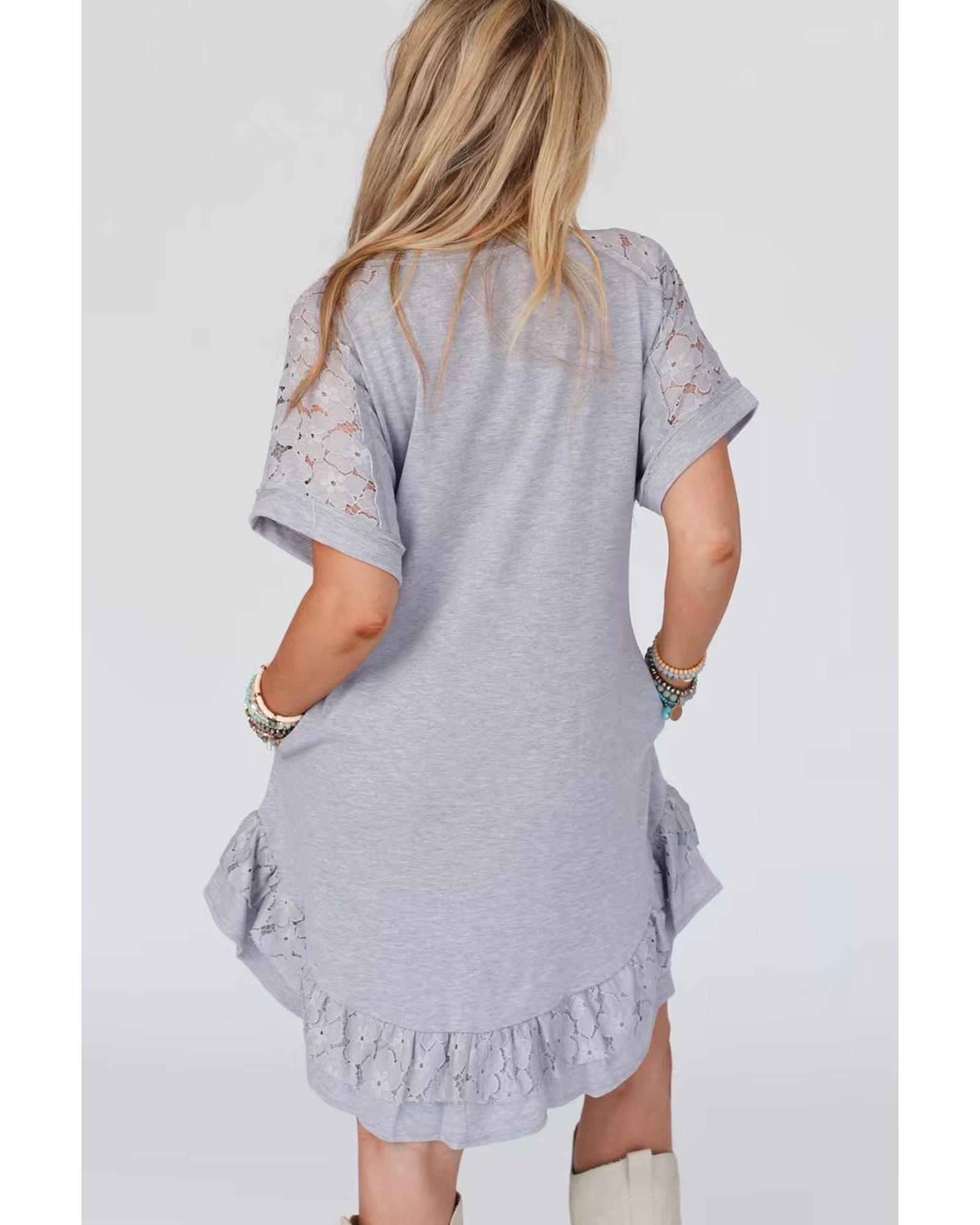 This light grey lace floral patchwork ruffled T-shirt dress offers a stylish and versatile look suitable for various occasions. Its relaxed fit provides comfort while maintaining a trendy appearance, making it ideal for casual outings or more dressed-up events.
