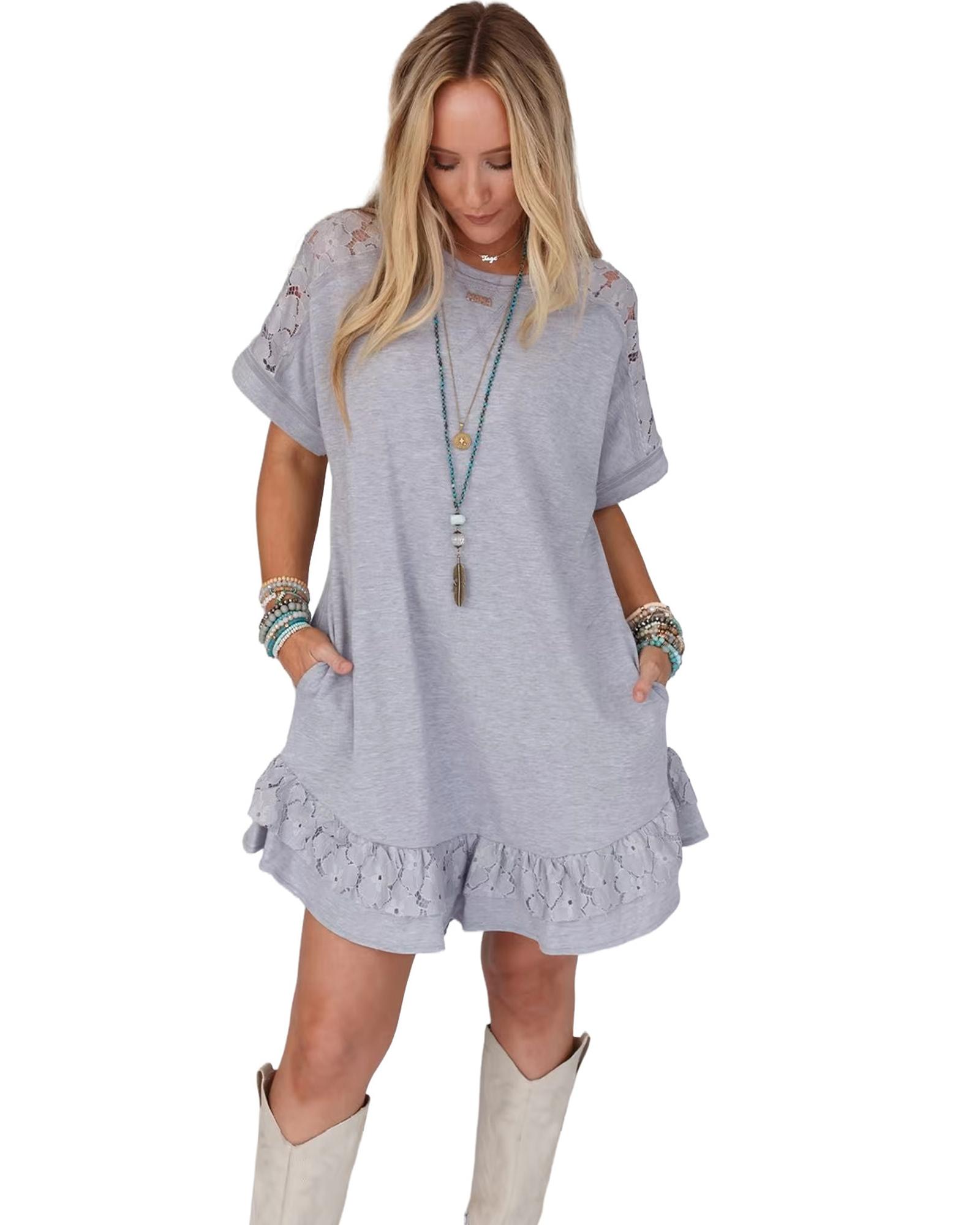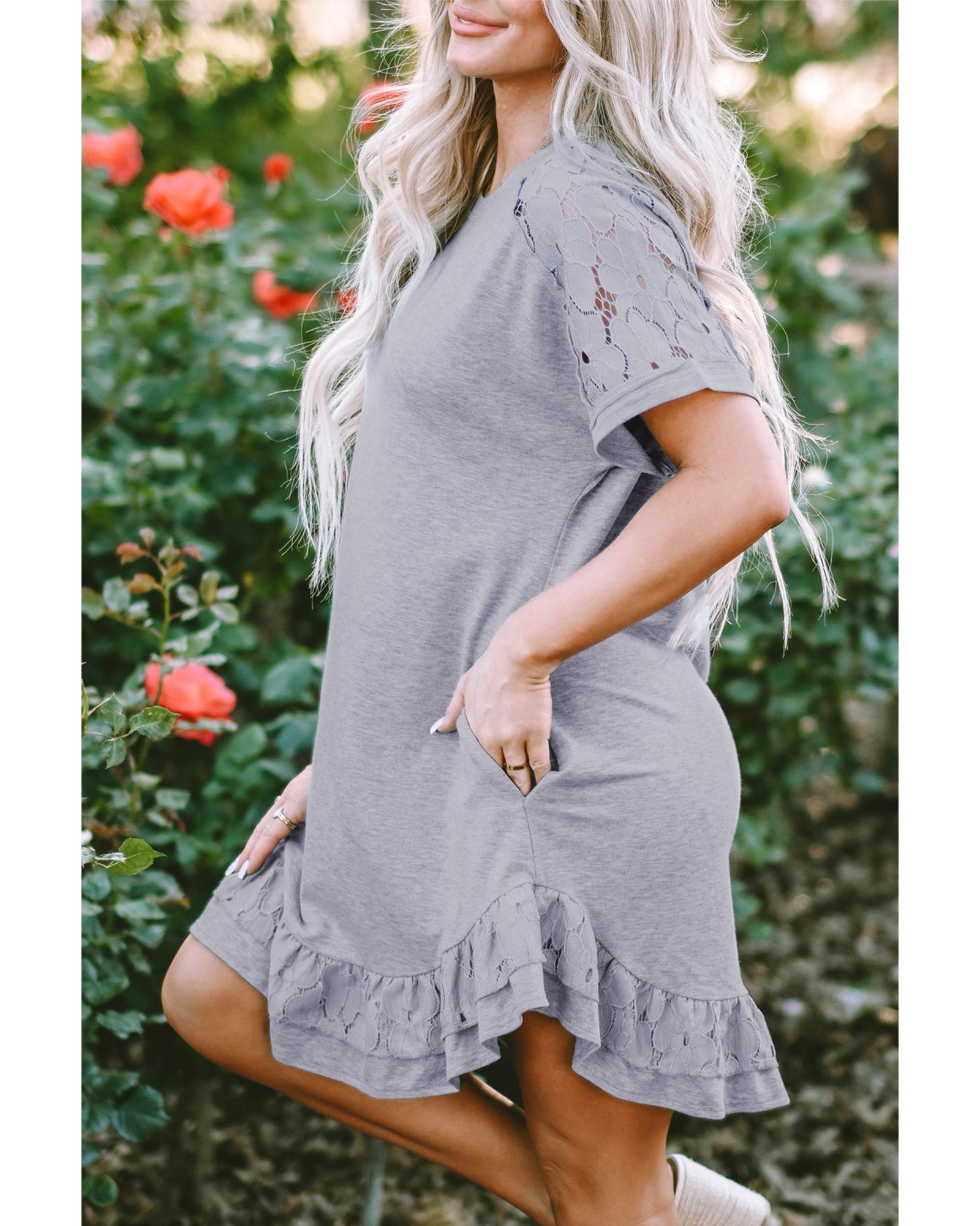 This light grey lace floral patchwork ruffled T-shirt dress offers a trendy and comfortable fit suitable for various occasions. Its relaxed style makes it versatile for casual outings or more dressed-up events, easily styled with different footwear and accessories.