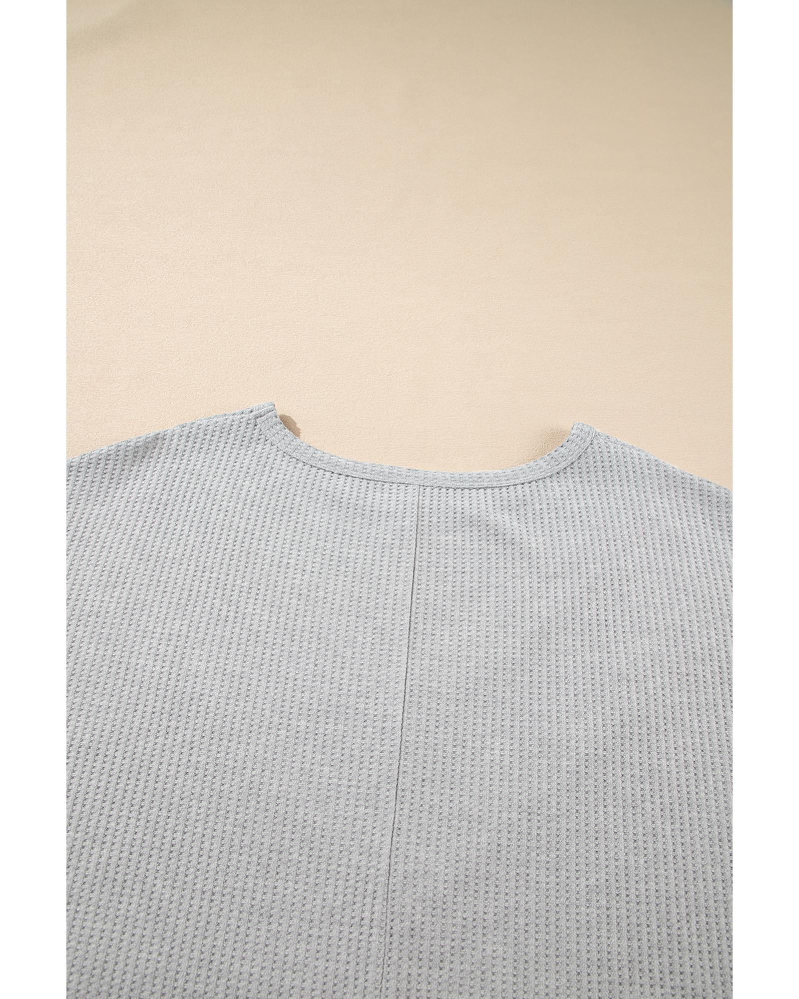 This stylish plus size top features a trendy fitted design with a light grey color and elegant lace insert details. Made from a comfortable waffle knit fabric, it offers a flowy fit that creates a slender silhouette. The short sleeves are ruffled, adding a touch of femininity to the overall look. Perfect for casual or semi-formal occasions, this top combines fashion and comfort effortlessly.