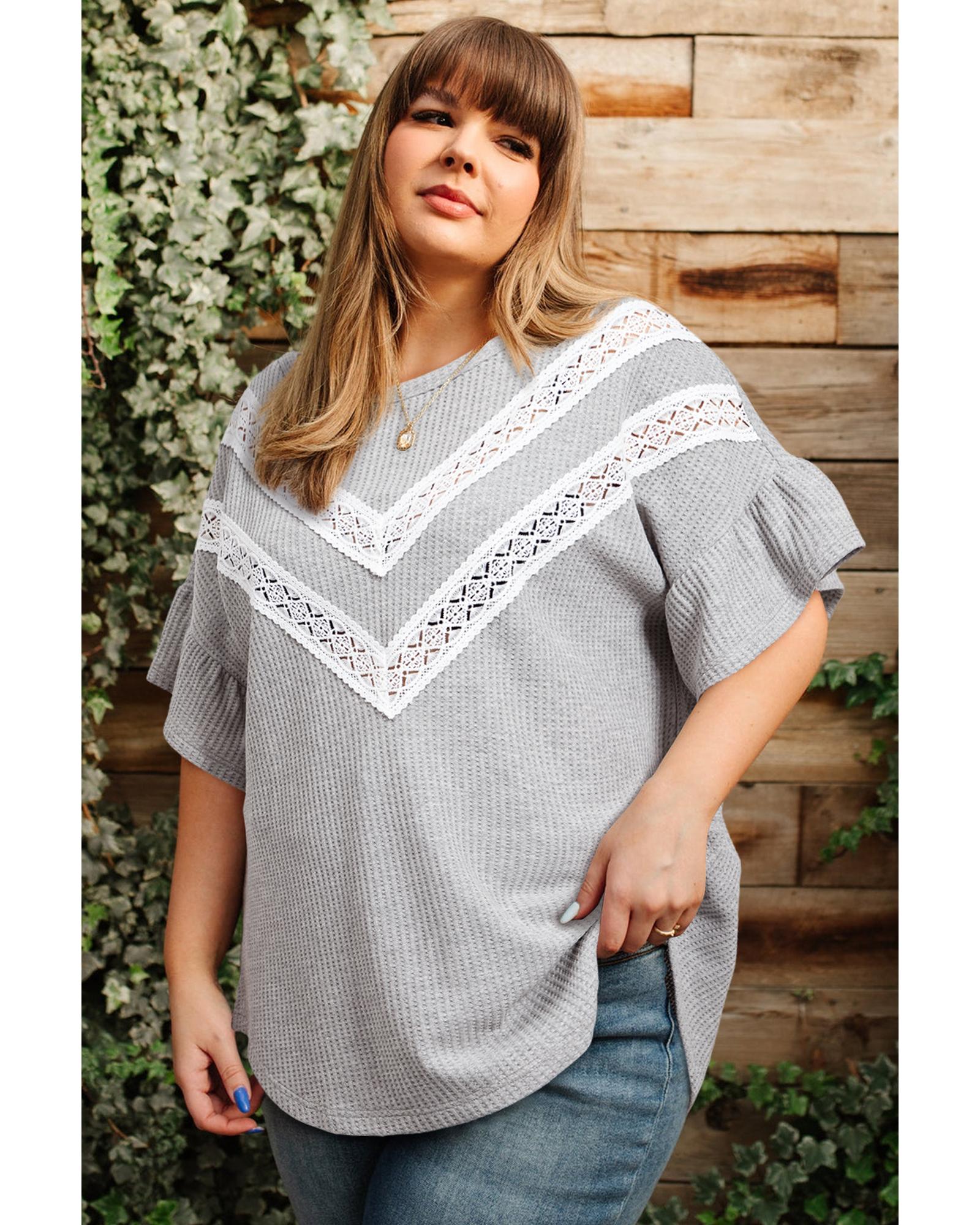 This stylish plus size top features a trendy fitted design with a light grey color and elegant lace insert details. Made from a comfortable waffle knit fabric, it offers a flowy fit that creates a slender silhouette. The ruffled short sleeves add a touch of femininity, making it suitable for various casual and semi-formal occasions.