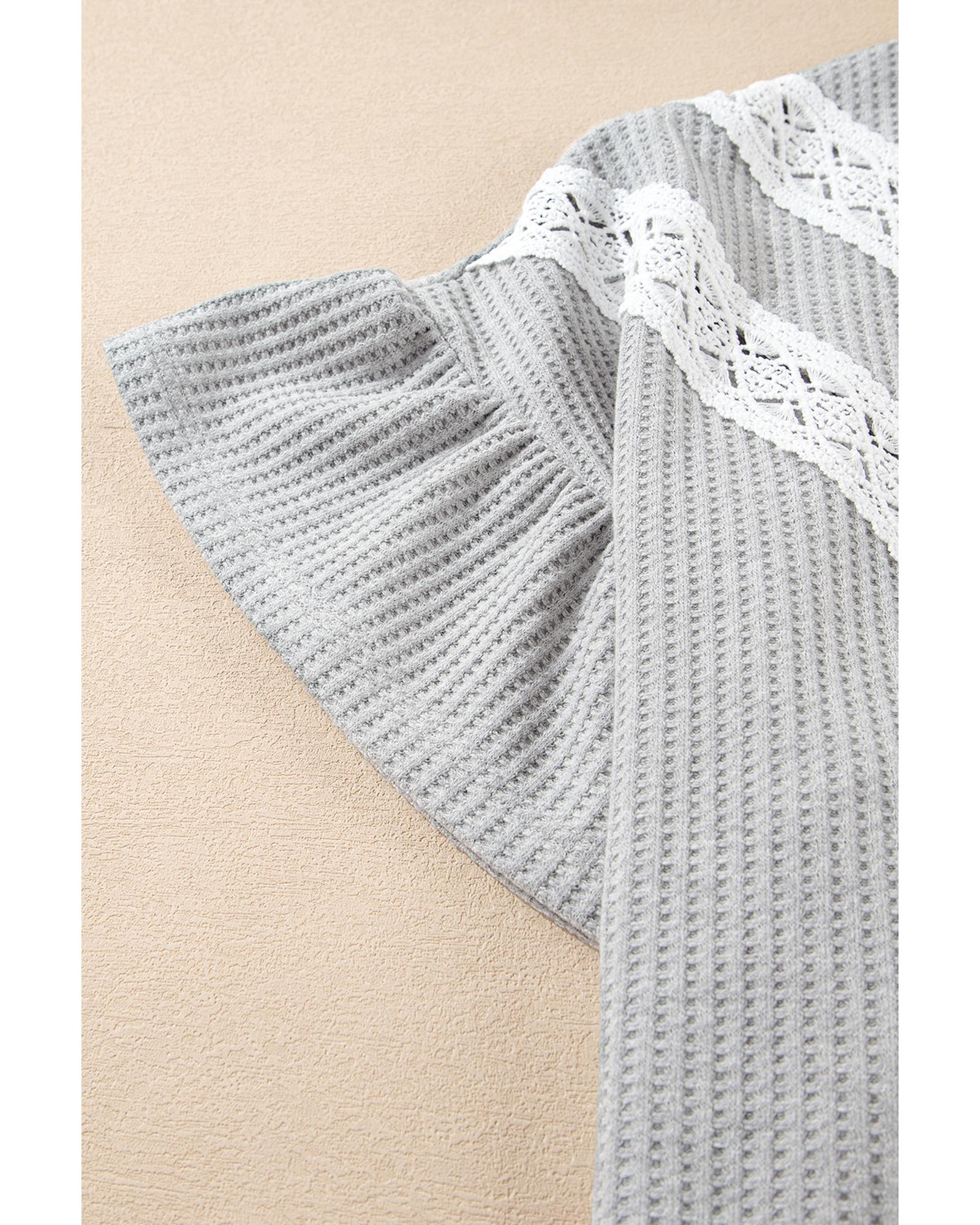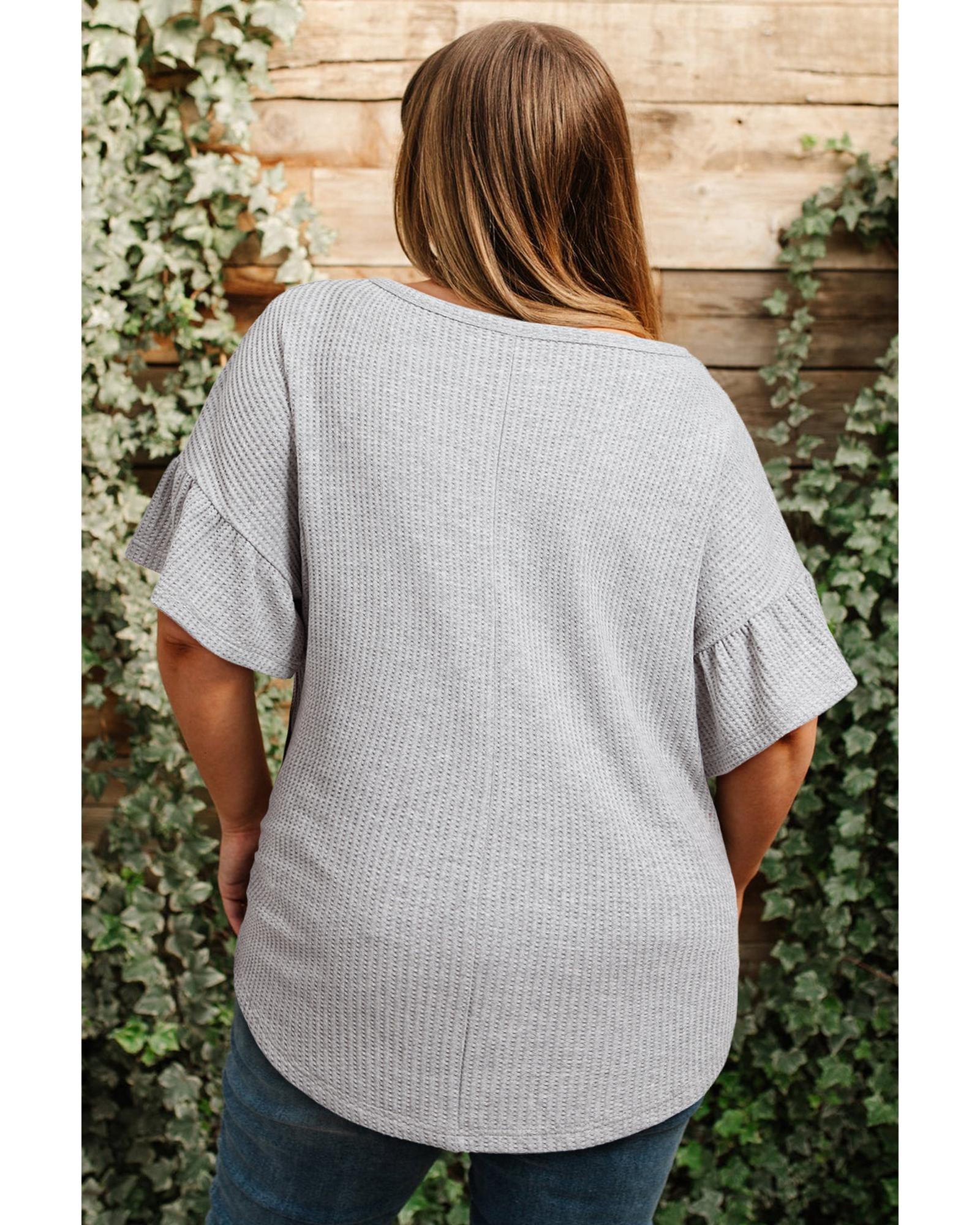This stylish plus size top features a light grey color with delicate lace insert details. Crafted from waffle knit fabric, it offers a comfortable and trendy fit with ruffled short sleeves and a flowy silhouette that creates a slender appearance. Designed to suit a variety of body types, it is available in larger sizes for a versatile wardrobe addition.