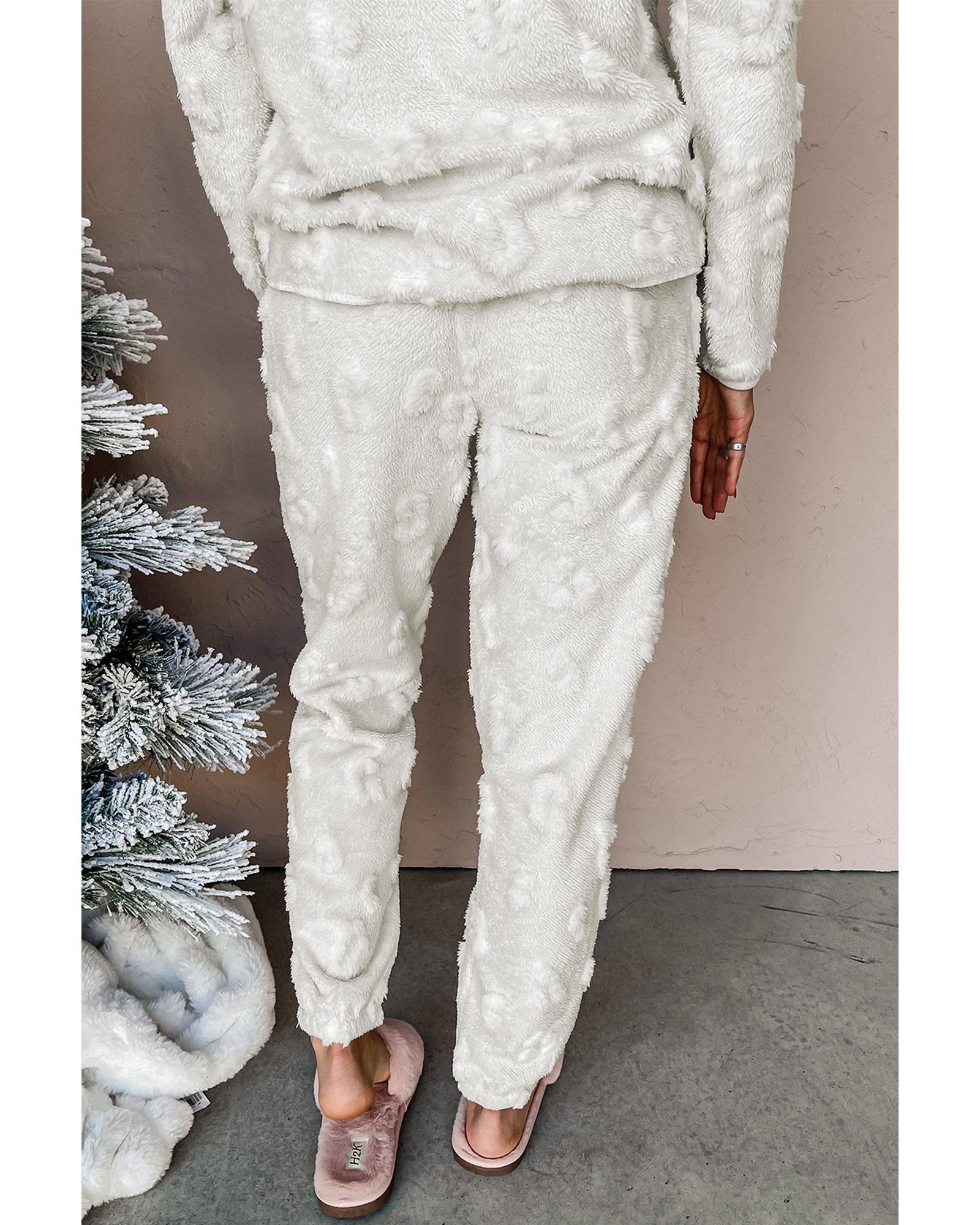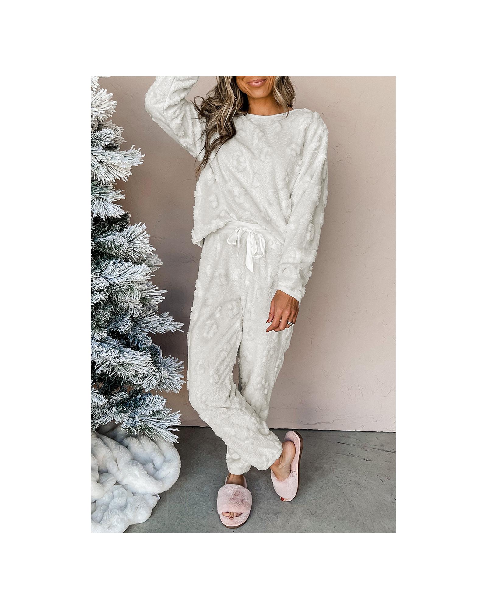 This light grey fleece lounge set features a textured leopard print design, offering a stylish and comfortable option for relaxing at home or running errands. The loose fit and soft material provide all-day comfort, making it a versatile addition to your casual wardrobe.