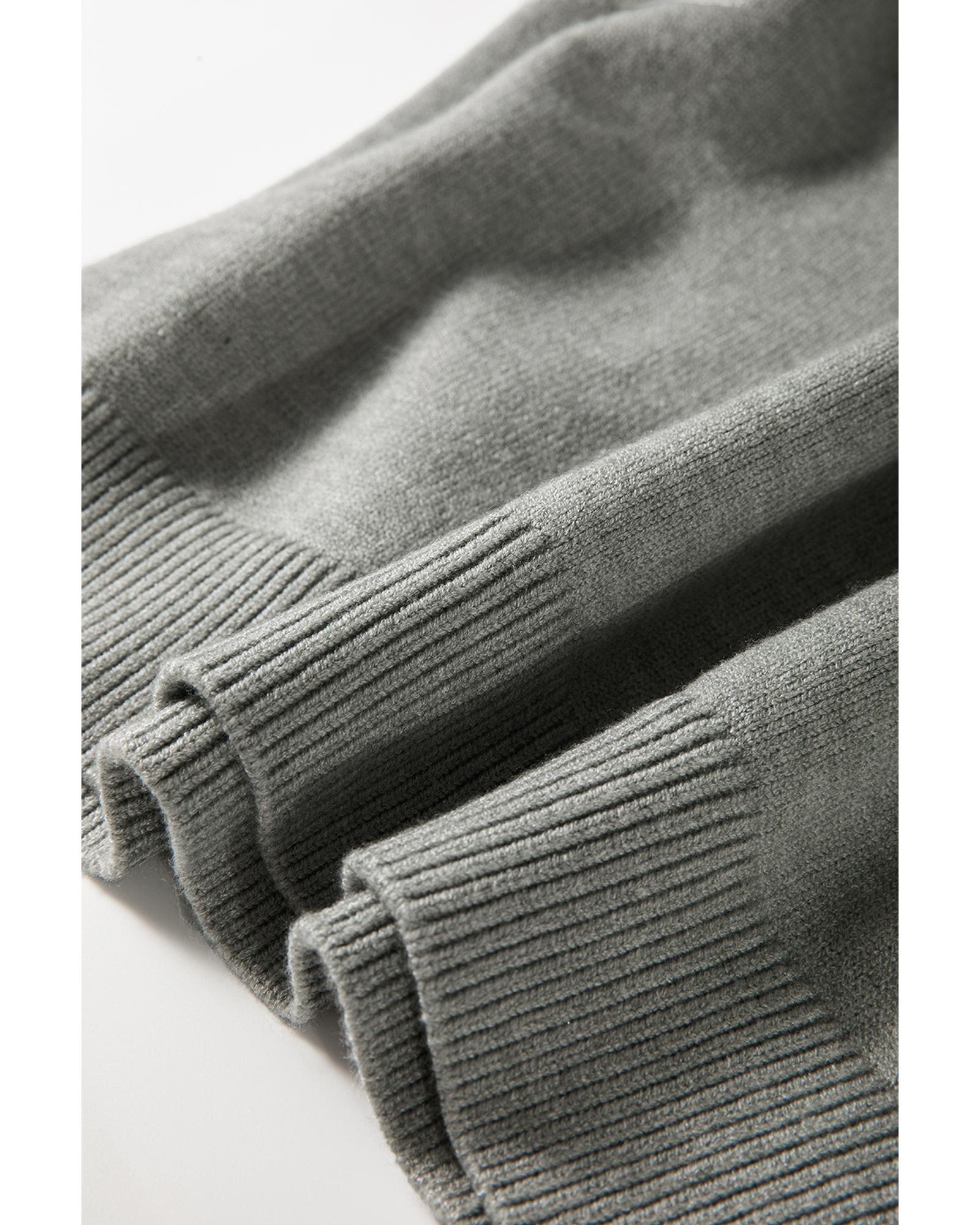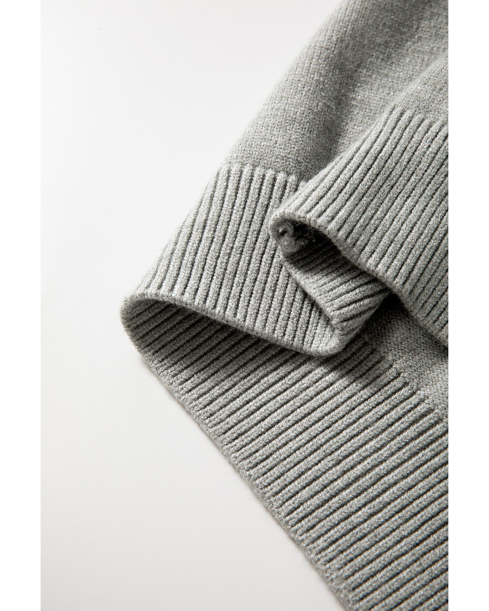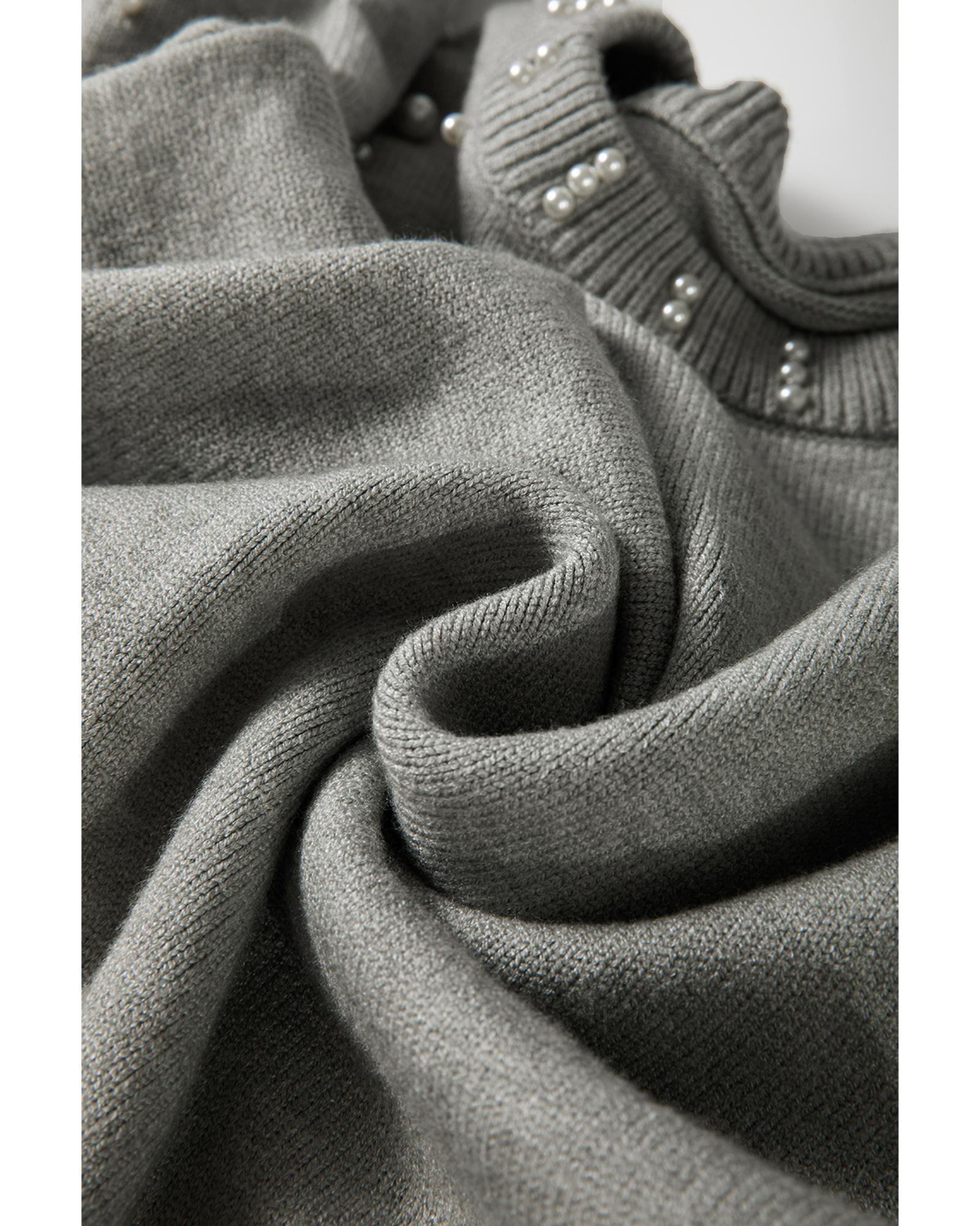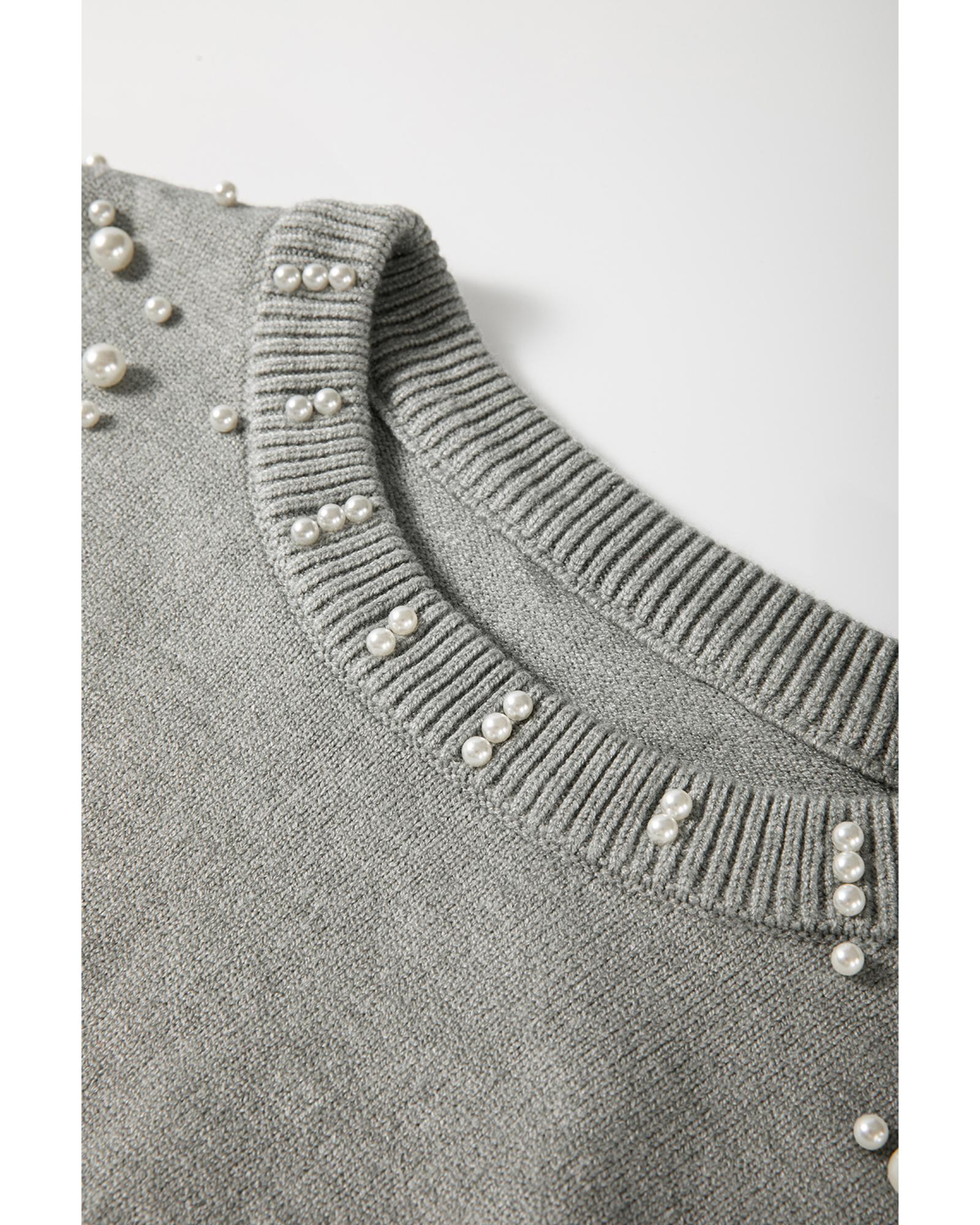 This light grey sweater features a stylish pearled drop shoulder design and a classic round neck, making it a versatile addition to any wardrobe. It offers a trendy fitted look that can be worn alone or layered for different styles. Crafted for comfort and warmth, it is suitable for various occasions.