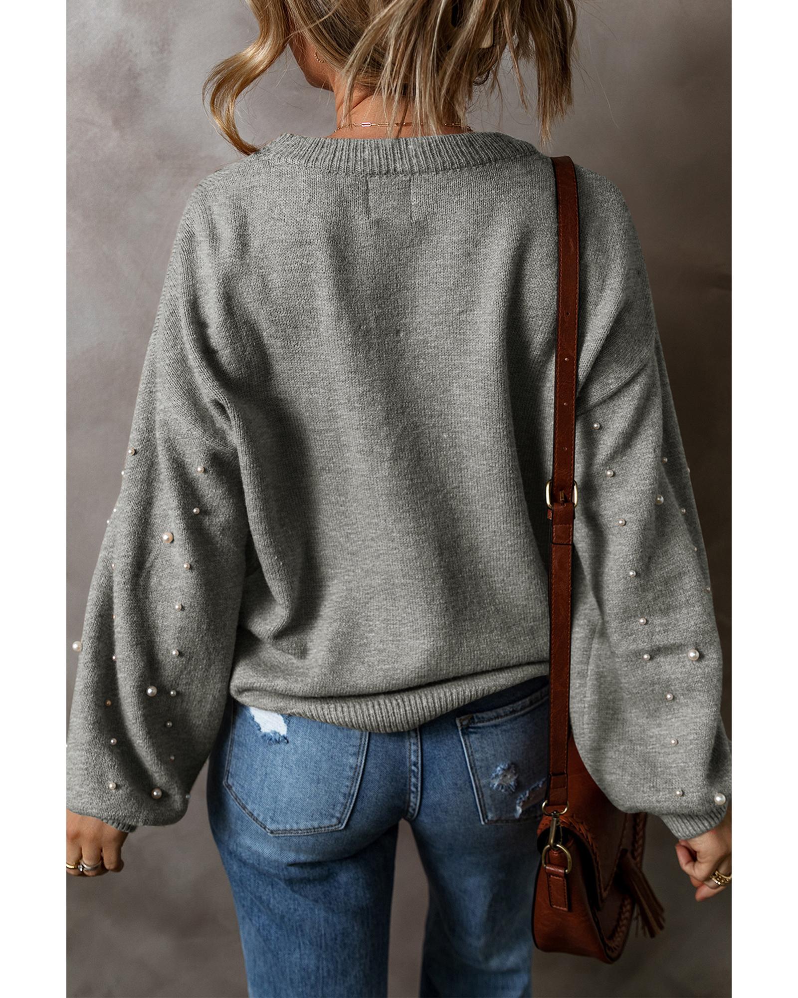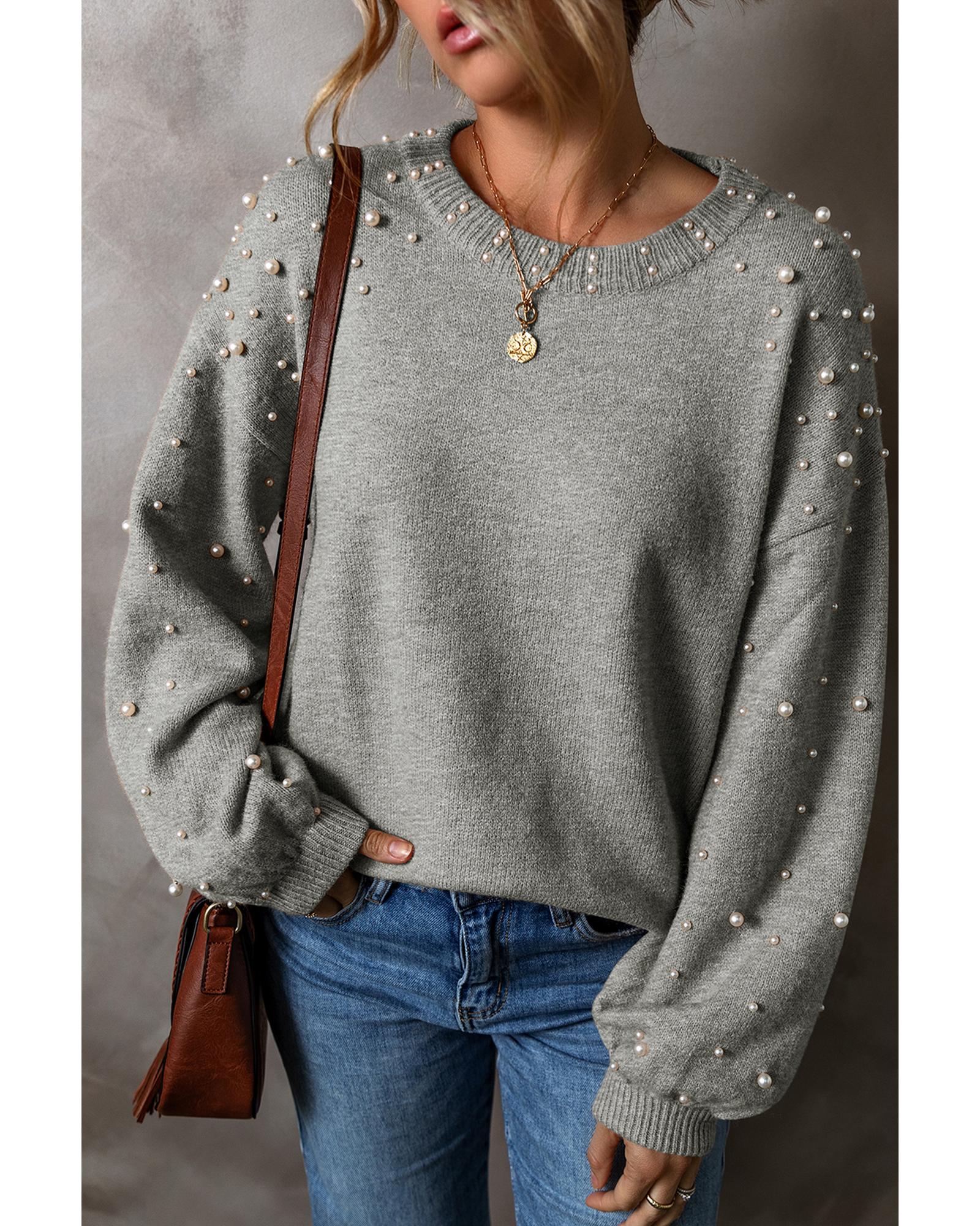 Light Grey Pearled Drop Shoulder Round Neck Sweater – L