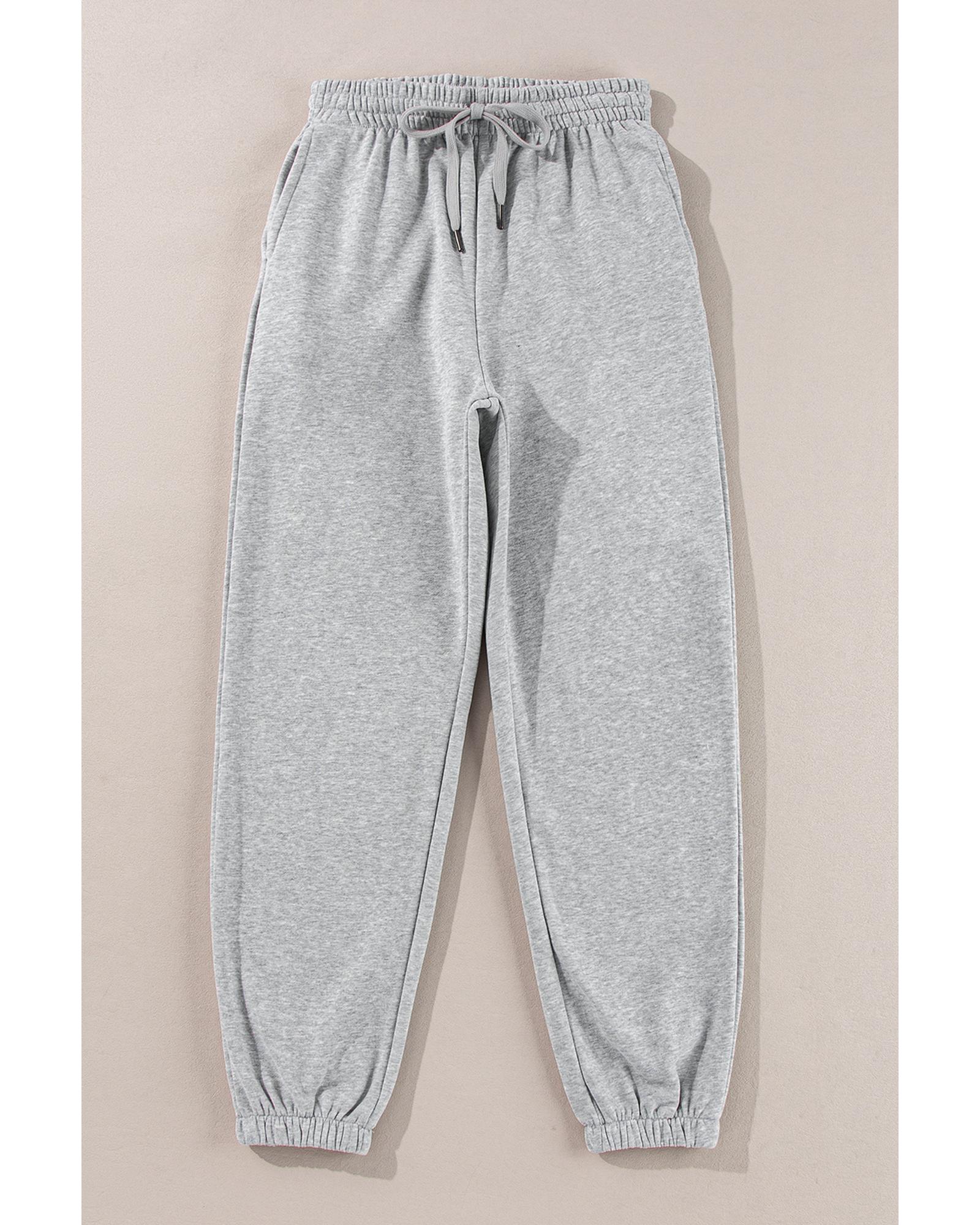 These light grey joggers feature a solid color design with a fleece lining, offering warmth and comfort. They are designed with a trendy fitted look, high waist, and an adjustable drawstring for a customized fit. Suitable for versatile casual wear, these joggers combine style and practicality.