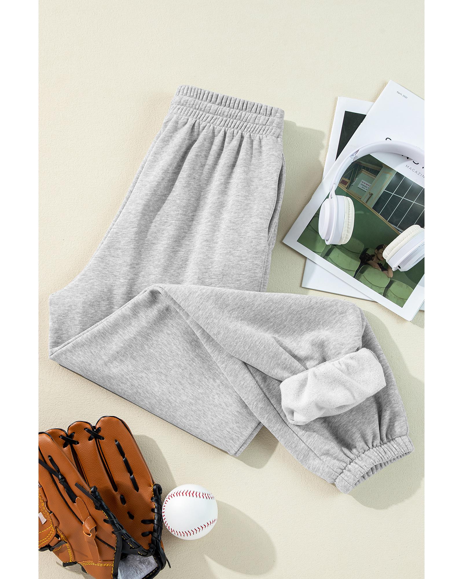 These light grey joggers feature a solid color design with a cozy fleece lining, offering warmth and comfort. The high waist and adjustable drawstring provide a flattering and customizable fit, making them suitable for various casual occasions.