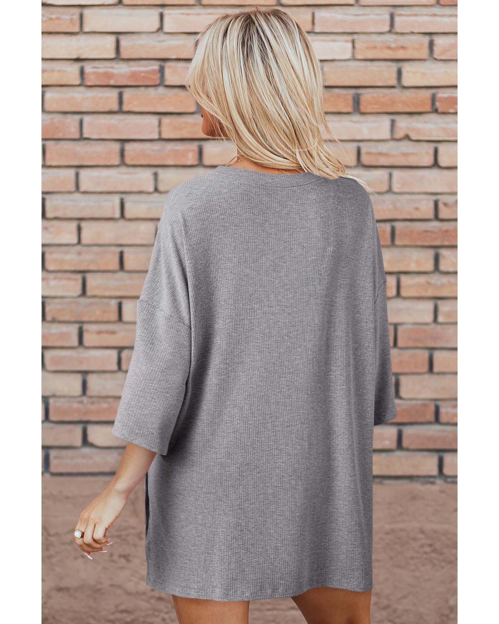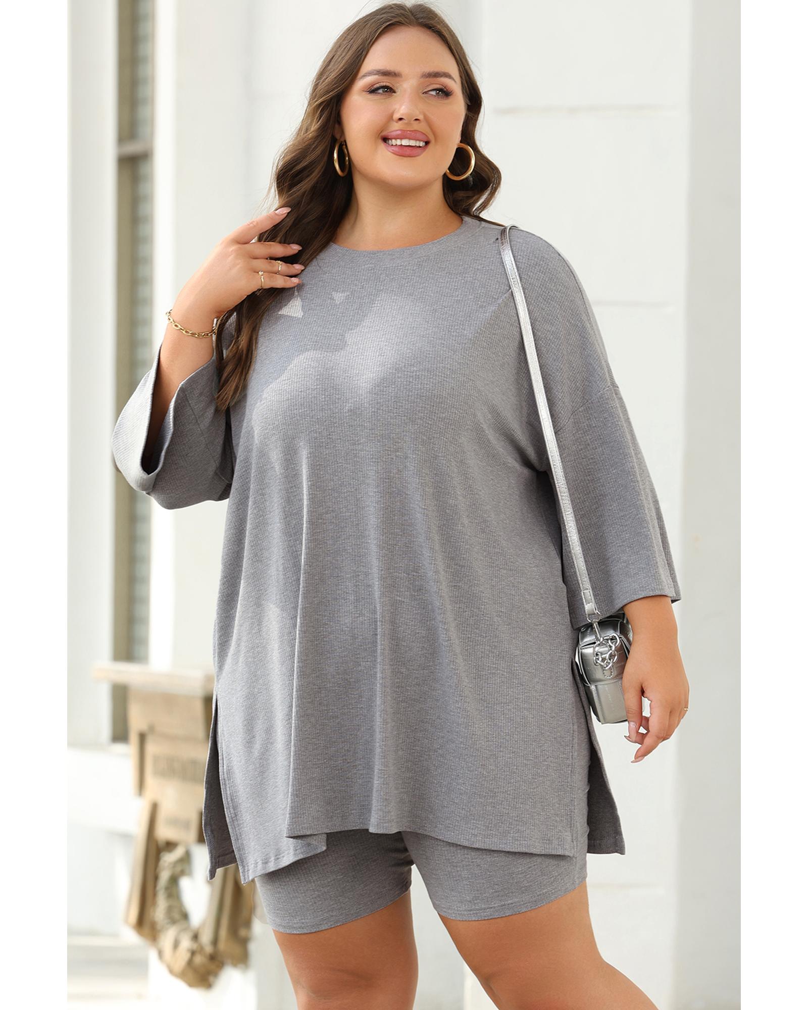 This light grey solid color set features a loose tunic top paired with slim shorts, creating a versatile and stylish ensemble. Designed with a trendy fitted look, it offers comfort and a fashionable appearance suitable for various occasions.