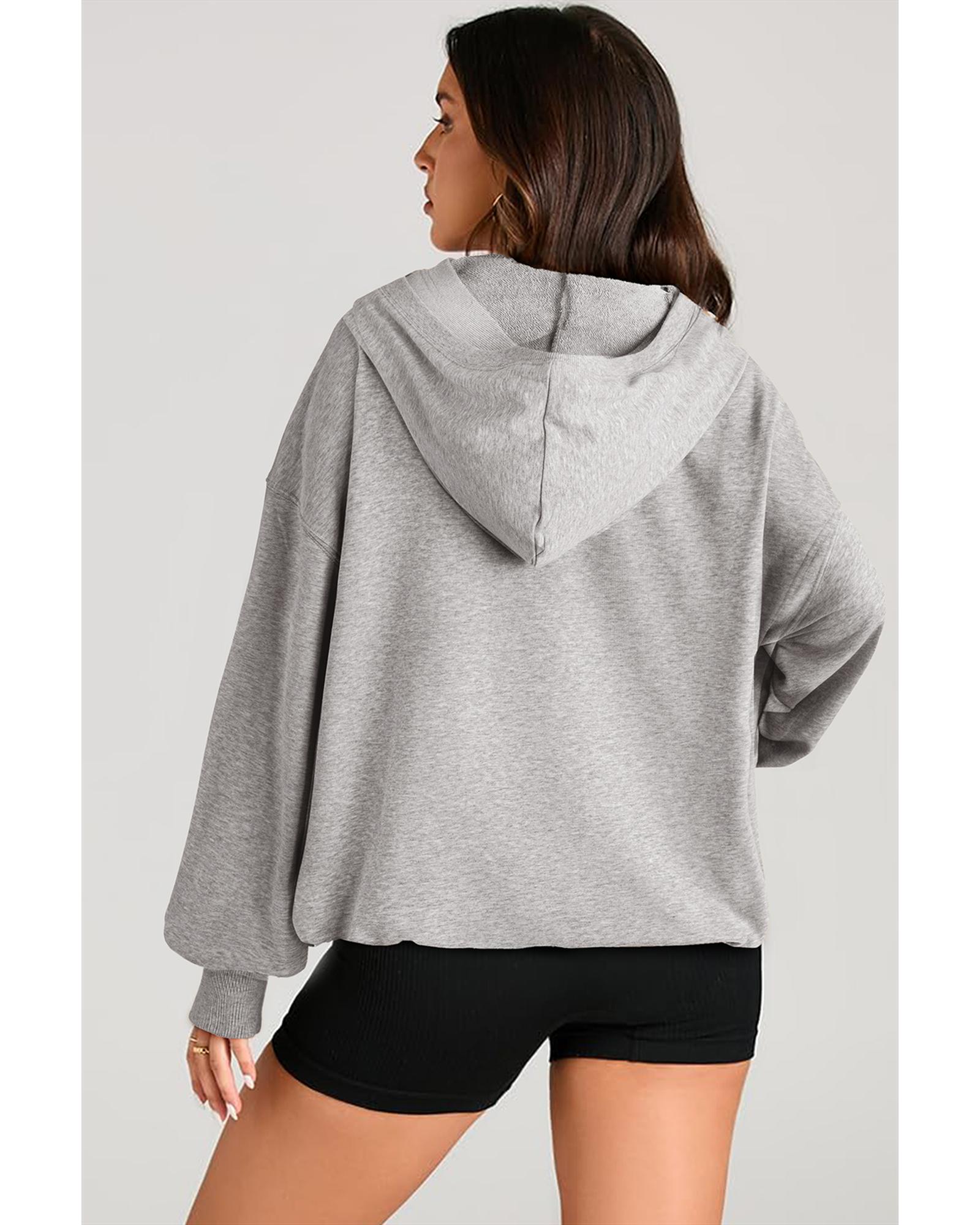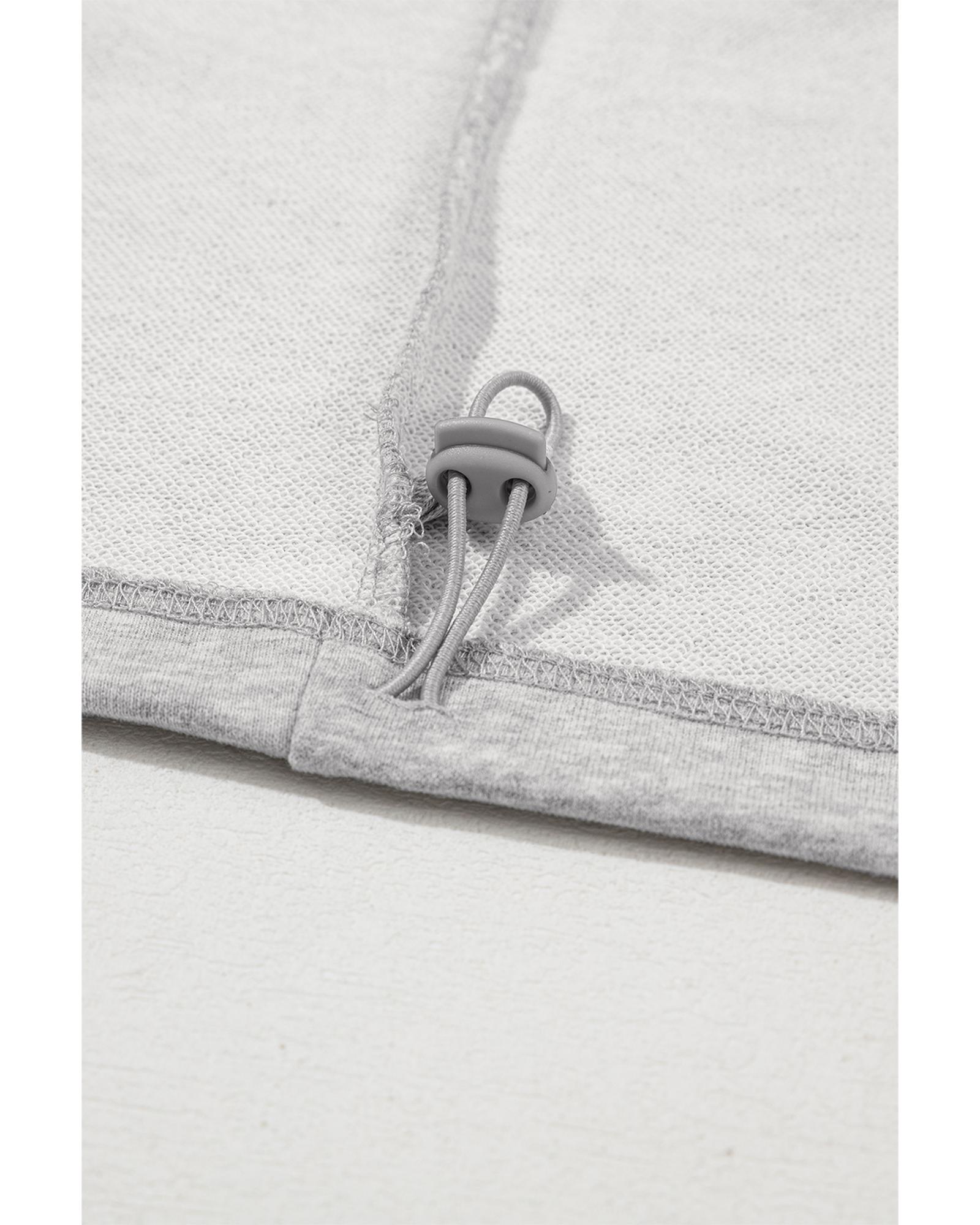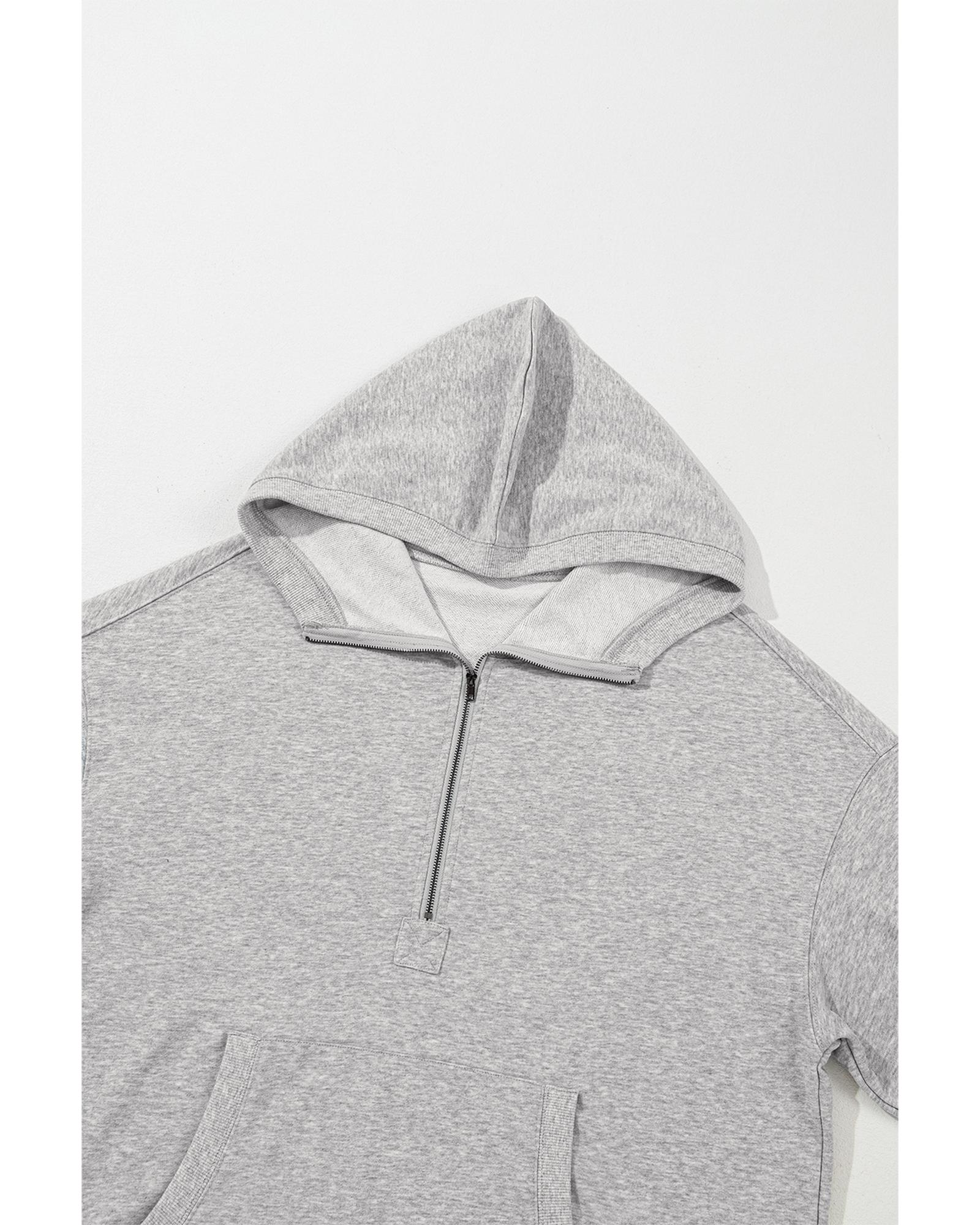 This oversized hoodie features a light grey solid color with a comfortable fit designed for casual wear. It includes a kangaroo pocket and a half zipper, making it both stylish and functional. The hoodie pairs well with leggings or jeans, offering a trendy and relaxed look.