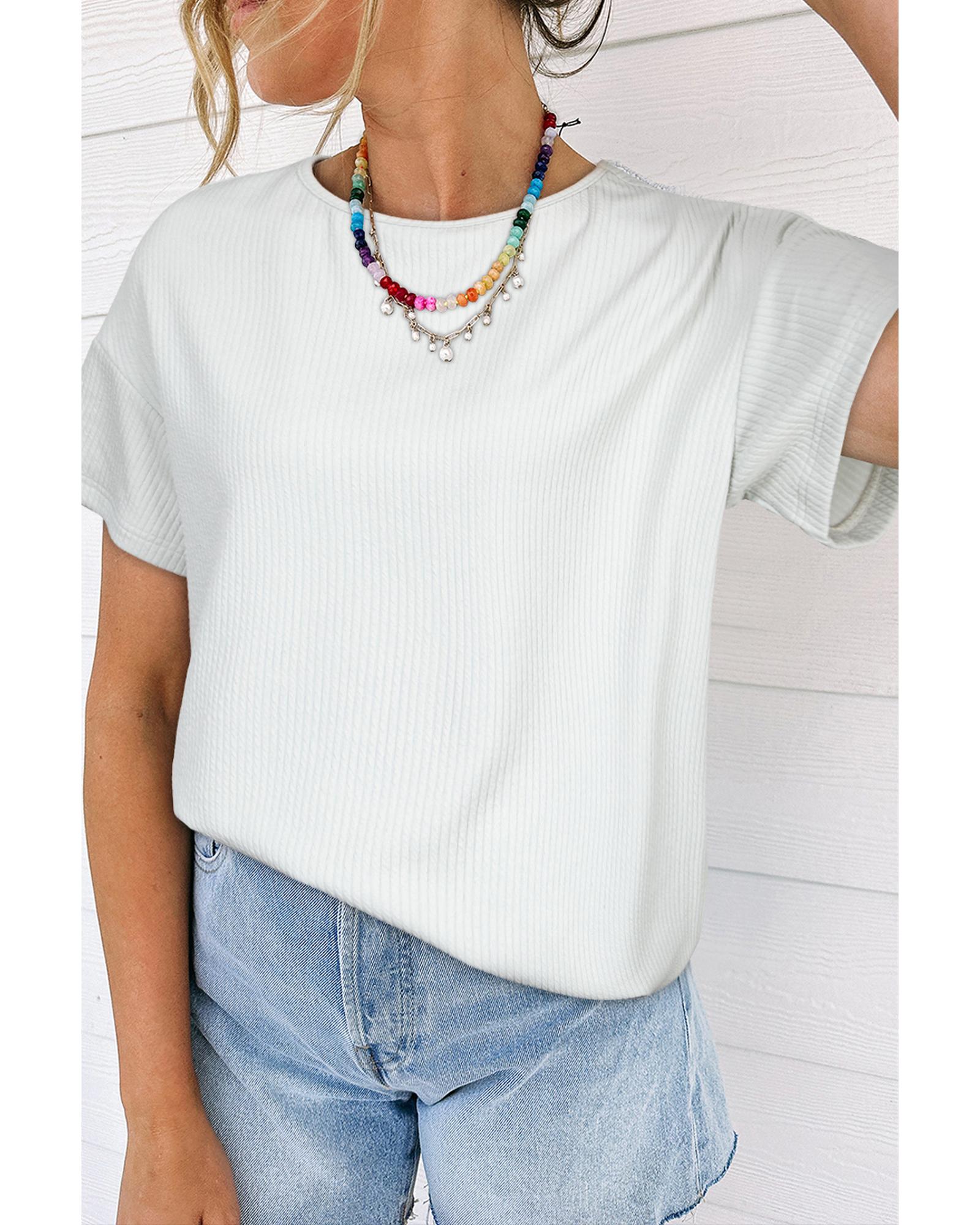 This light grey textured loose T-shirt offers a trendy and comfortable fit, suitable for various casual occasions. Designed with a classic round neck and a versatile style, it pairs well with different bottoms for a stylish look. The fabric provides medium to high elasticity, ensuring ease of movement and comfort throughout the day.