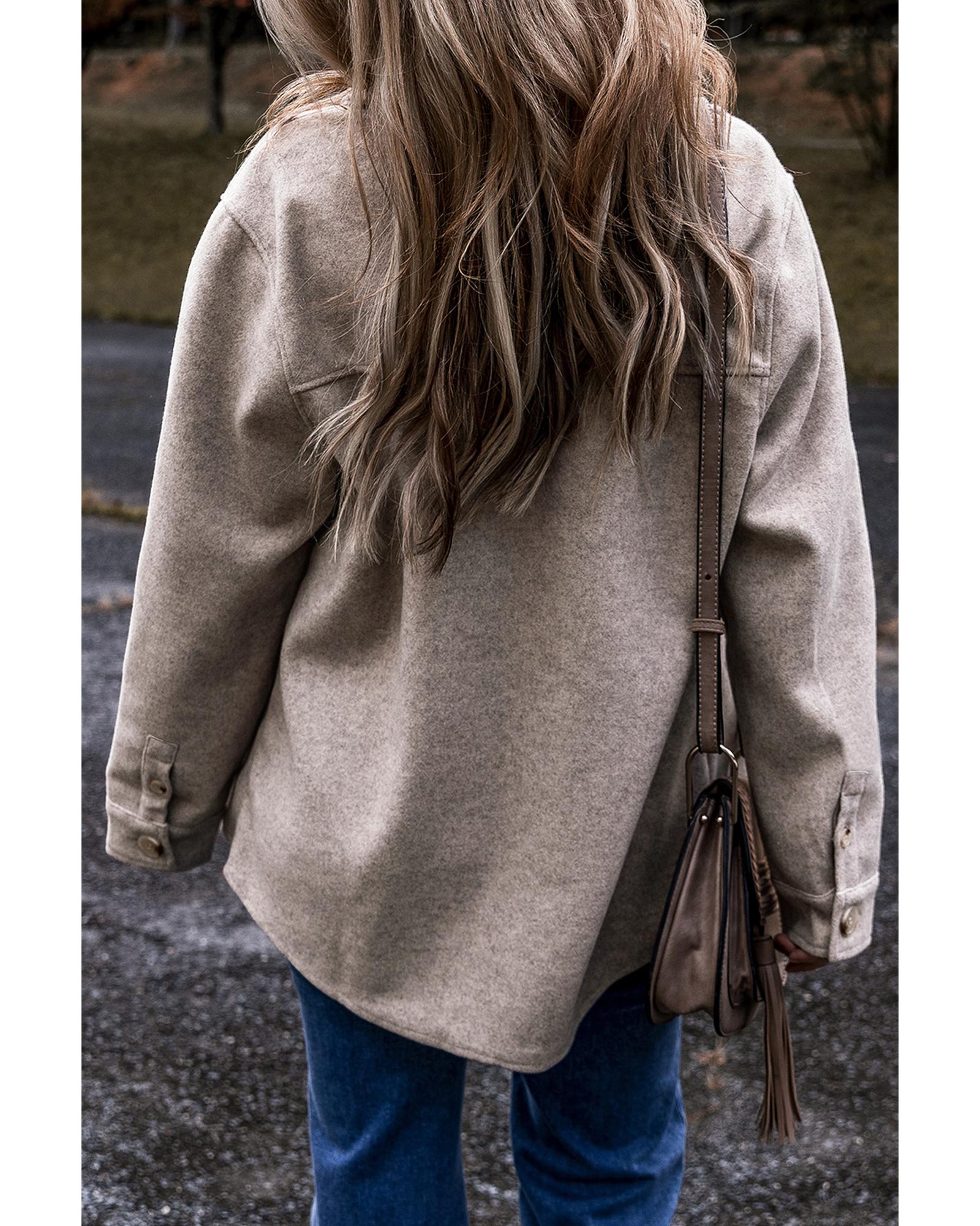 This light grey shacket features a turn-down collar and flap pockets, offering a stylish and practical layering option. Designed with a trendy fitted look, it is suitable for various body types and can be paired easily with shirts and jeans for a versatile casual style.