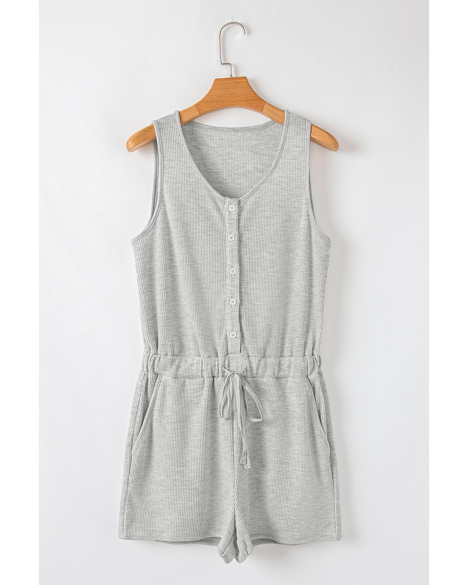 This sleeveless romper features a light grey waffle knit fabric, offering a comfortable and stylish option for casual occasions. Its textured material provides a cozy feel, making it suitable for warmer weather. The design includes a buttoned front for easy wearing and a drawstring waist to allow for an adjustable fit.