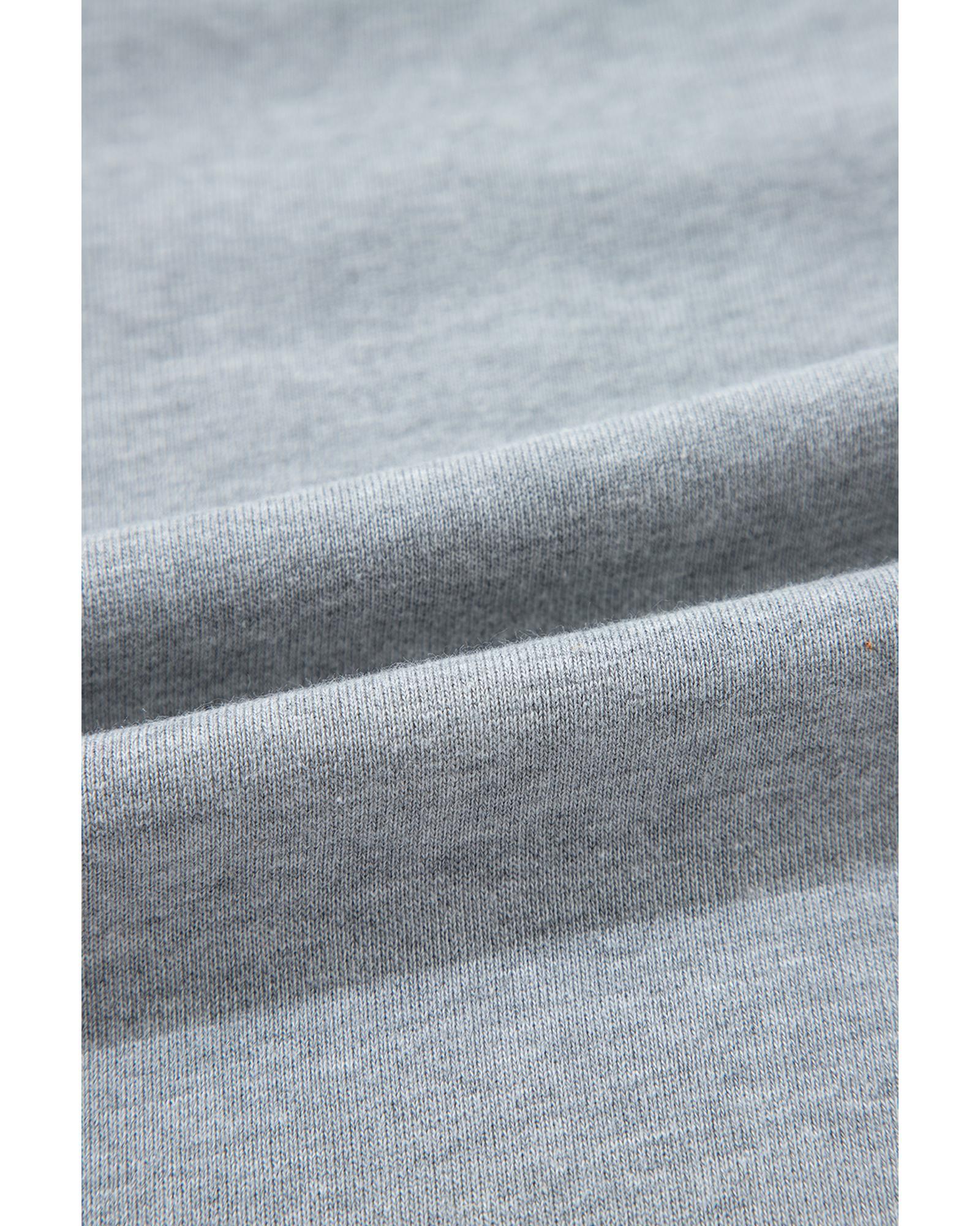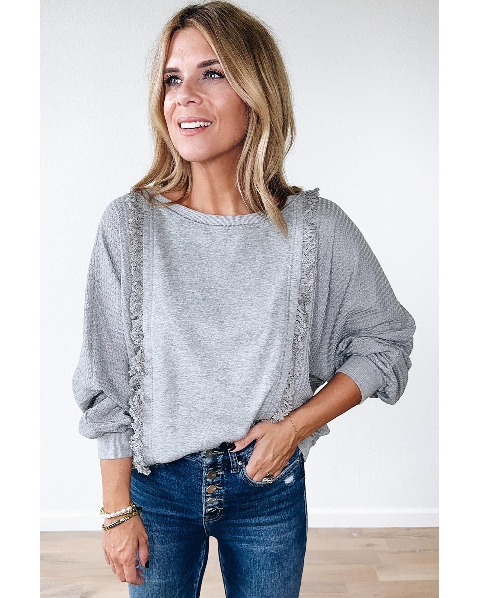 This light grey waffle patchwork long sleeve pullover top features a cozy knit design with a trendy, loose fit. The raw hem details add an edgy touch, making it a versatile and stylish piece suitable for various casual outfits.