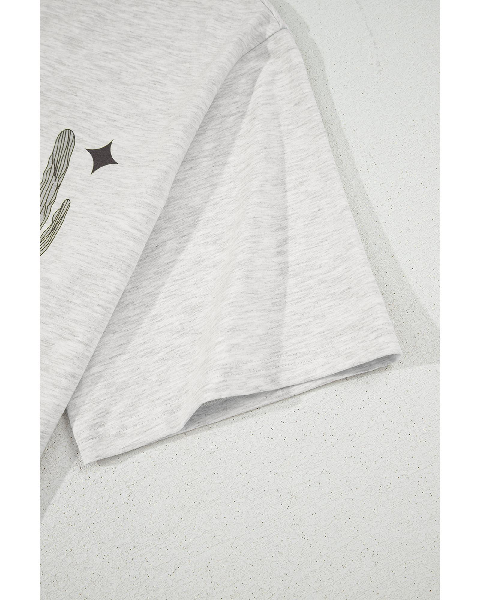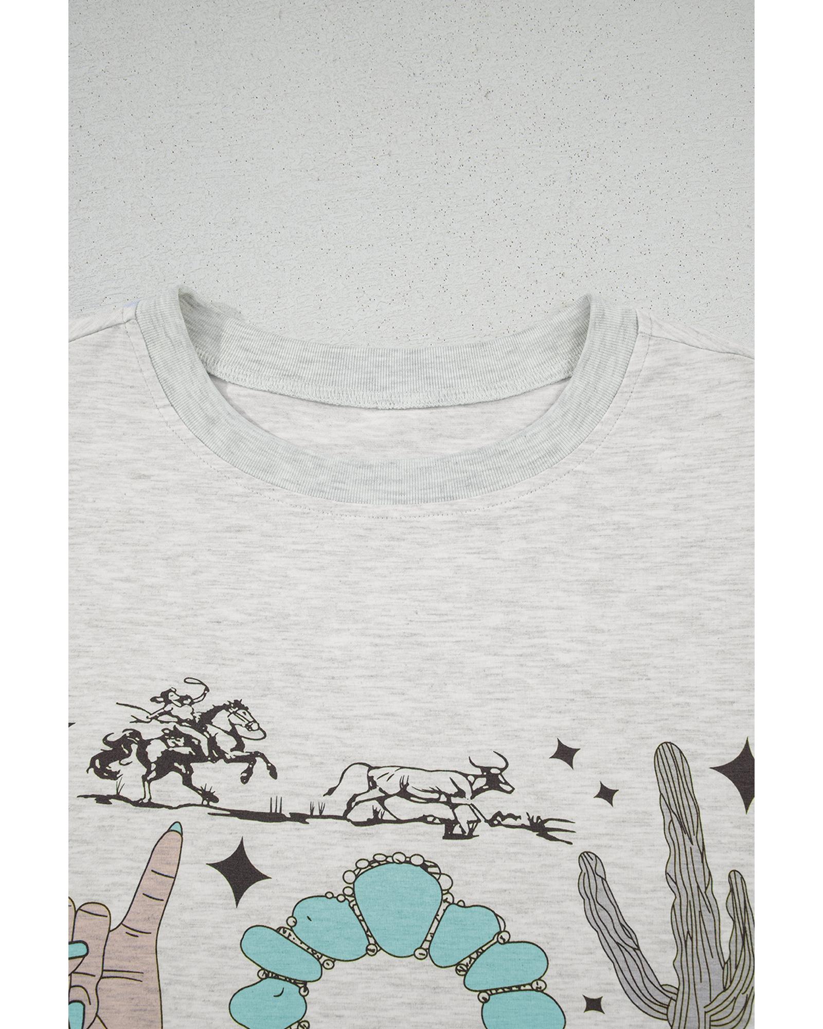 This light grey western fashion print plus size tee offers a comfortable and stylish option for casual wear. Designed with a crewneck and featuring western-inspired prints, it combines fashion and comfort effortlessly.