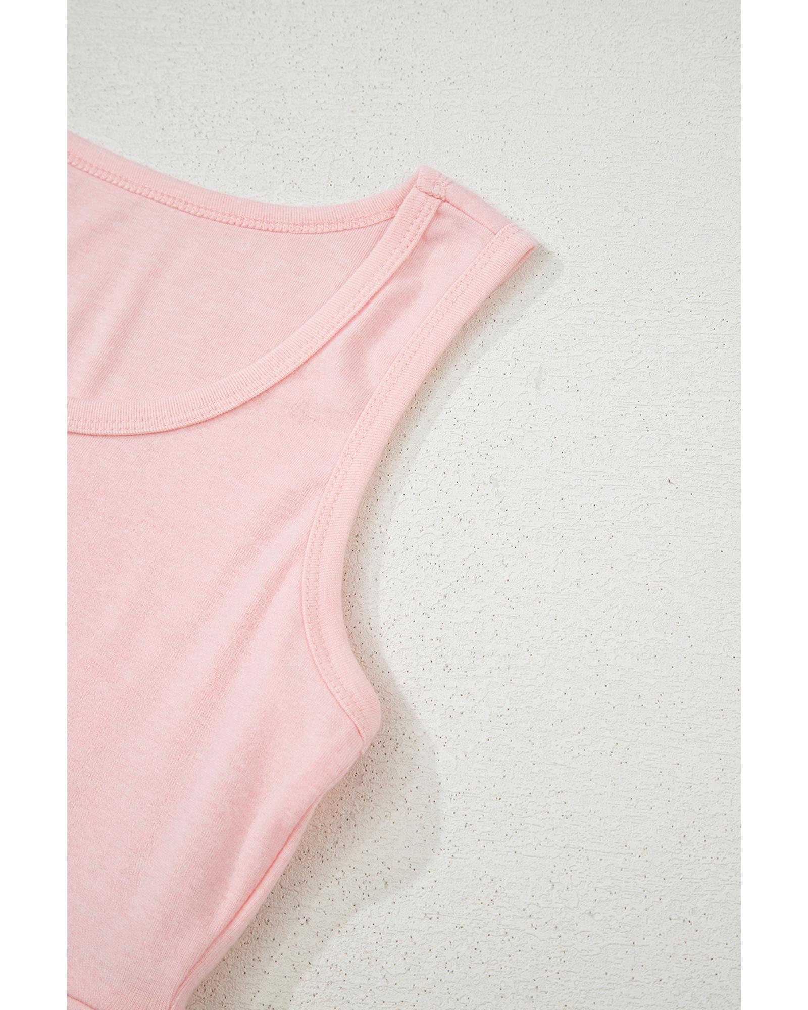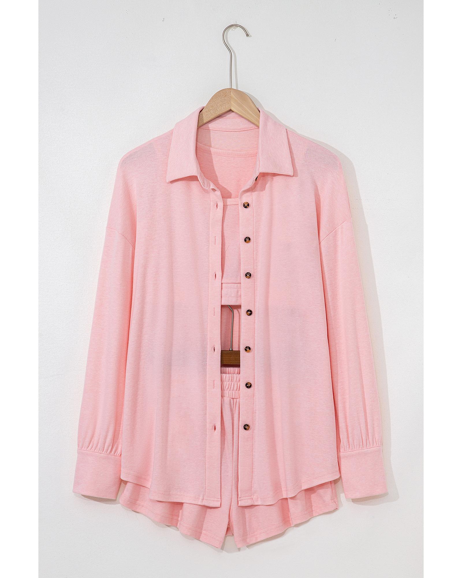 This light pink lounge set offers a comfortable and stylish option for casual outings or relaxing at home. It includes a crop tank top, shorts, and a matching cardigan, making it a versatile addition to your wardrobe.