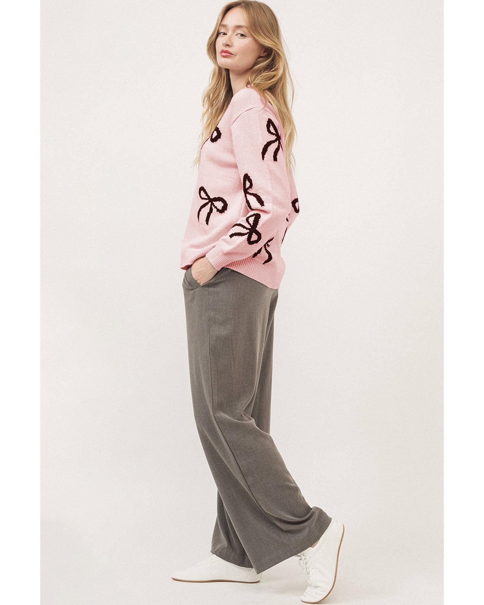 This light pink bow pattern knitted sweater offers a relaxed and casual style with a loose fit design. Made from soft and lightweight materials, it provides comfortable wear suitable for various occasions. The ribbed crewneck adds a classic touch, while the versatile style pairs well with jeans, leggings, or skirts.