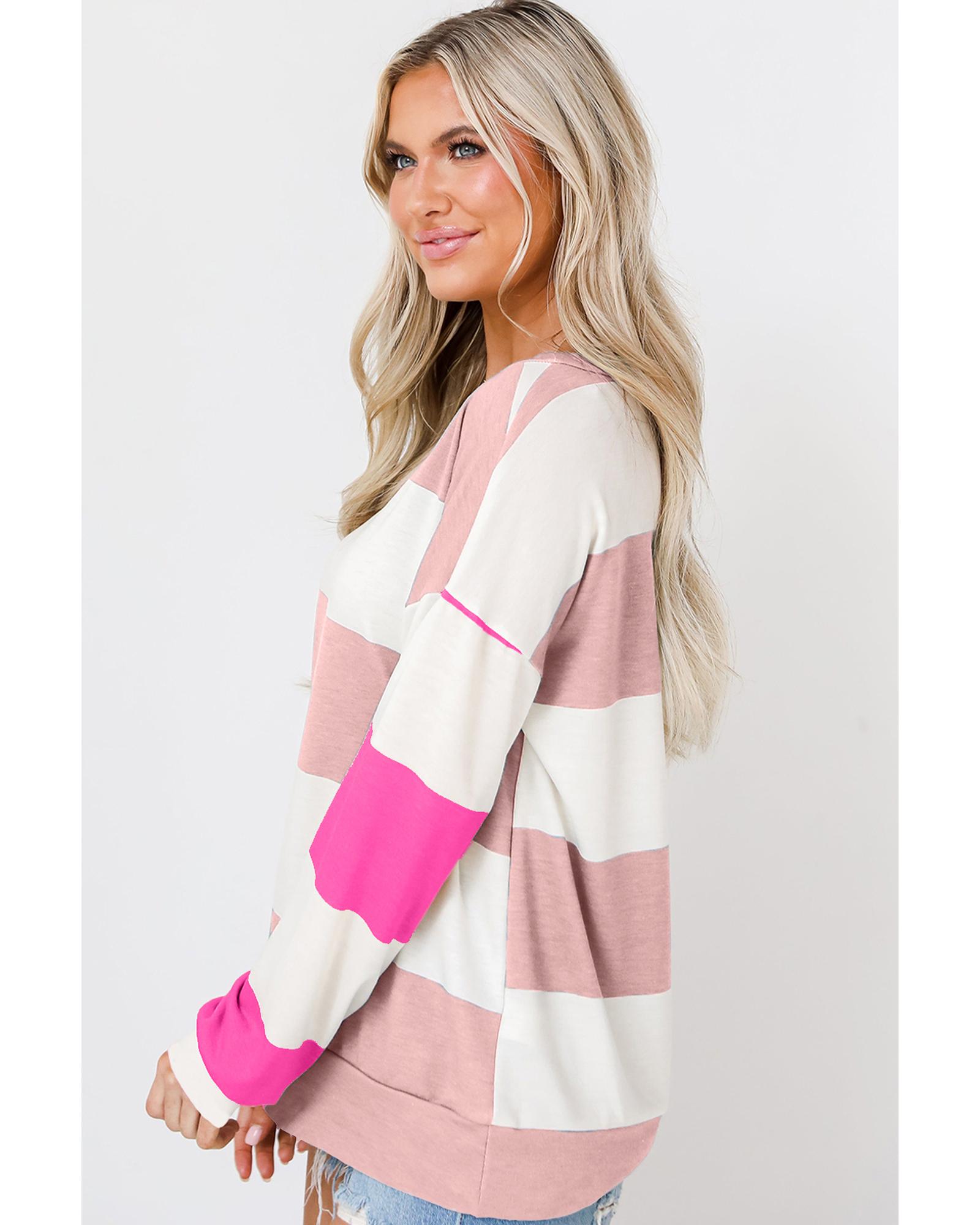 This light pink colorblock striped long sleeve top features a trendy drop shoulder design and bold colorblock stripes, making it a stylish addition to any wardrobe. Crafted from a comfortable blend of polyester and elastane, it offers a fitted look that aligns with current fashion trends. Available in various sizes, it is suitable for different body types and occasions.