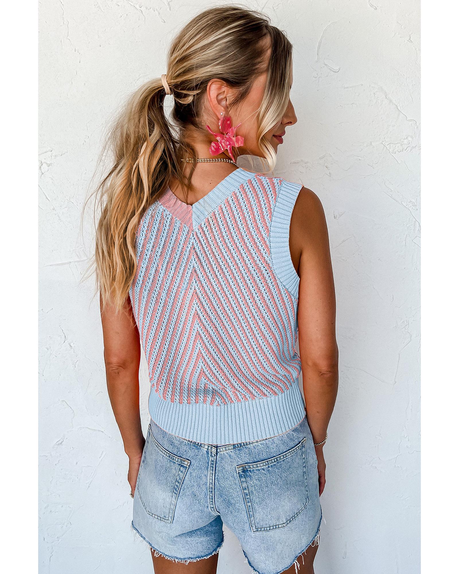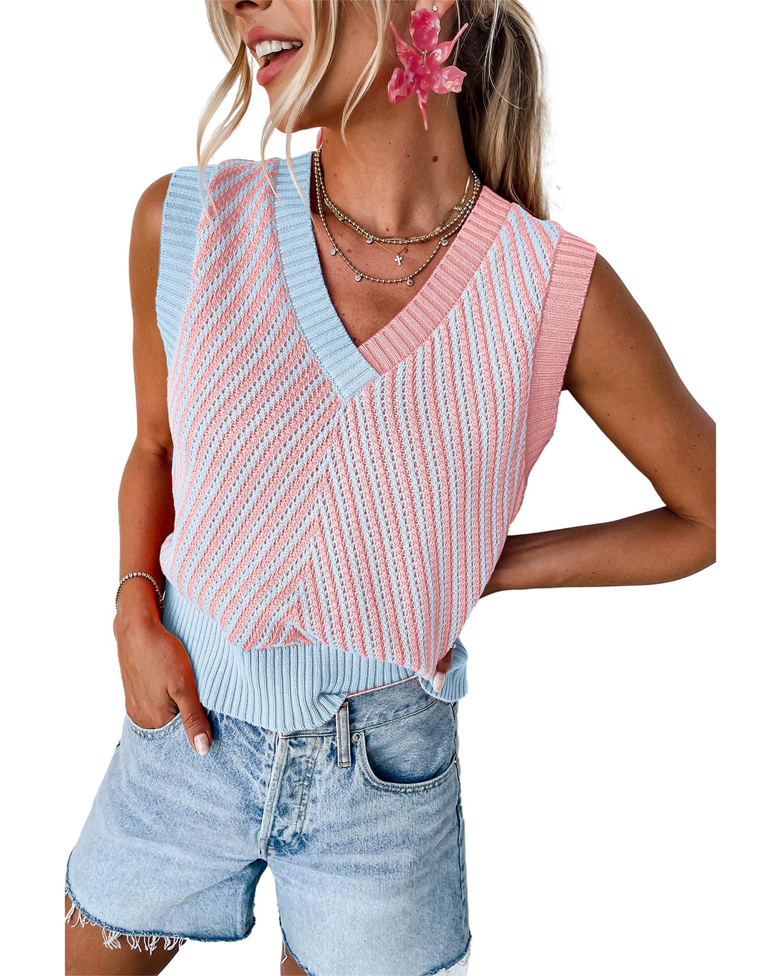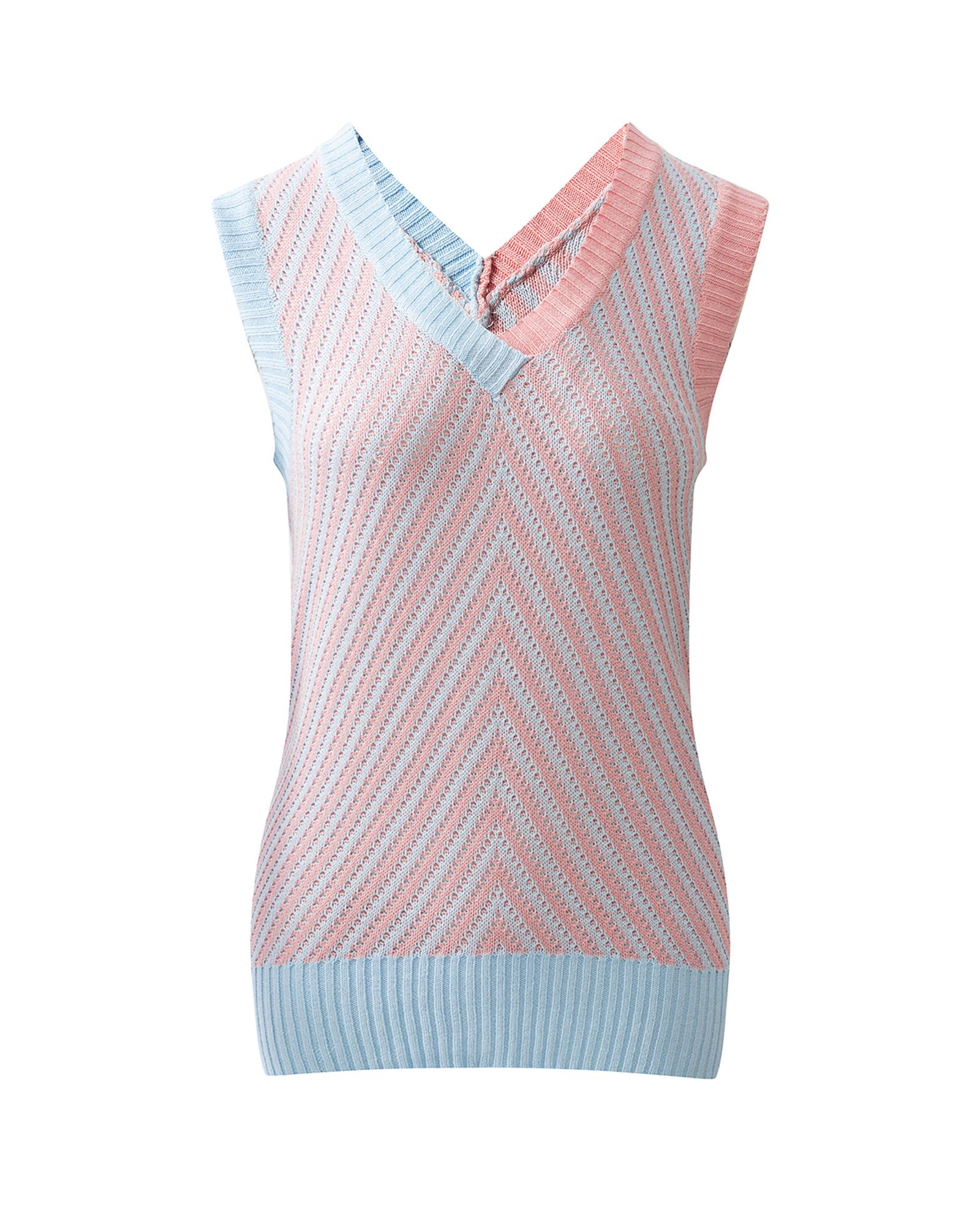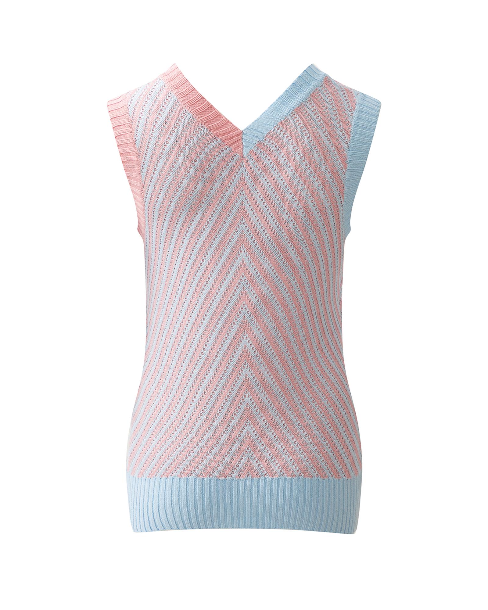 This light pink contrast chevron knit V-neck sweater vest combines stylish design with comfortable textured material. Its classic silhouette and ribbed trim make it a versatile addition to any wardrobe, suitable for layering or wearing alone.