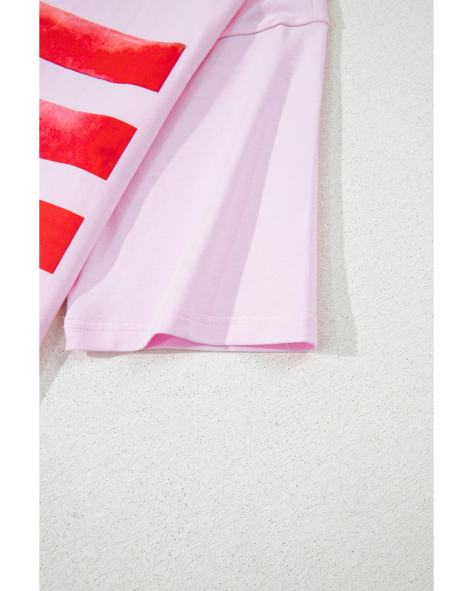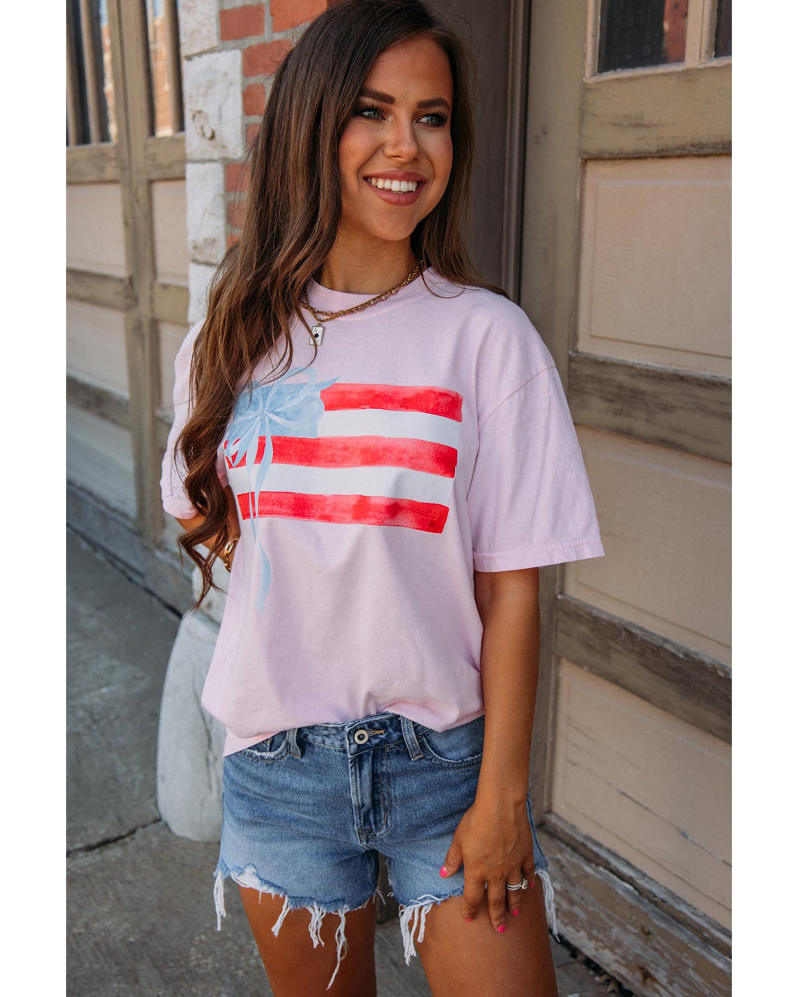 This light pink crewneck tee features a playful flag bow graphic design, making it a stylish choice for casual wear. Its versatile style pairs well with pants, jeans, denim shorts, and skirts, suitable for various casual occasions.