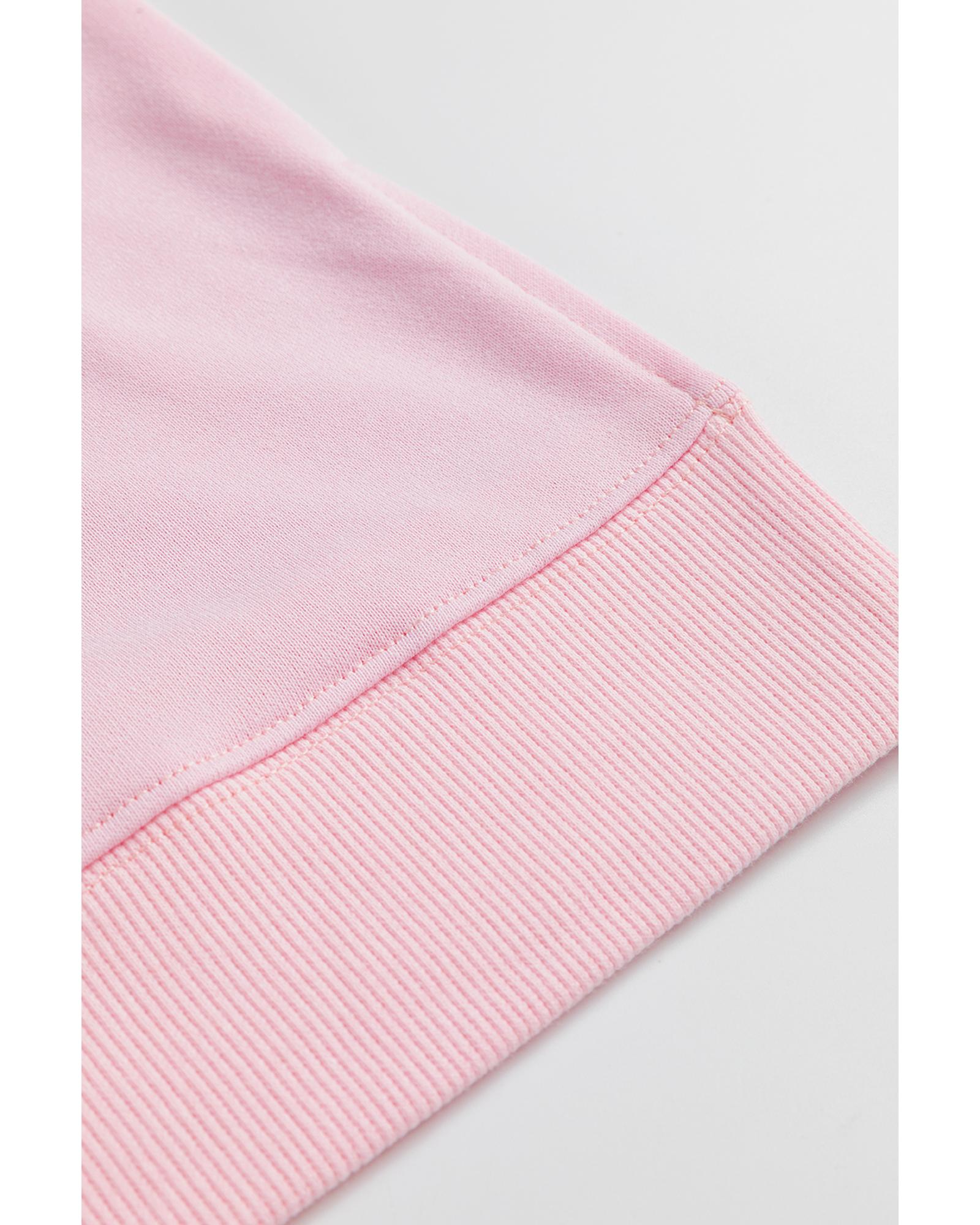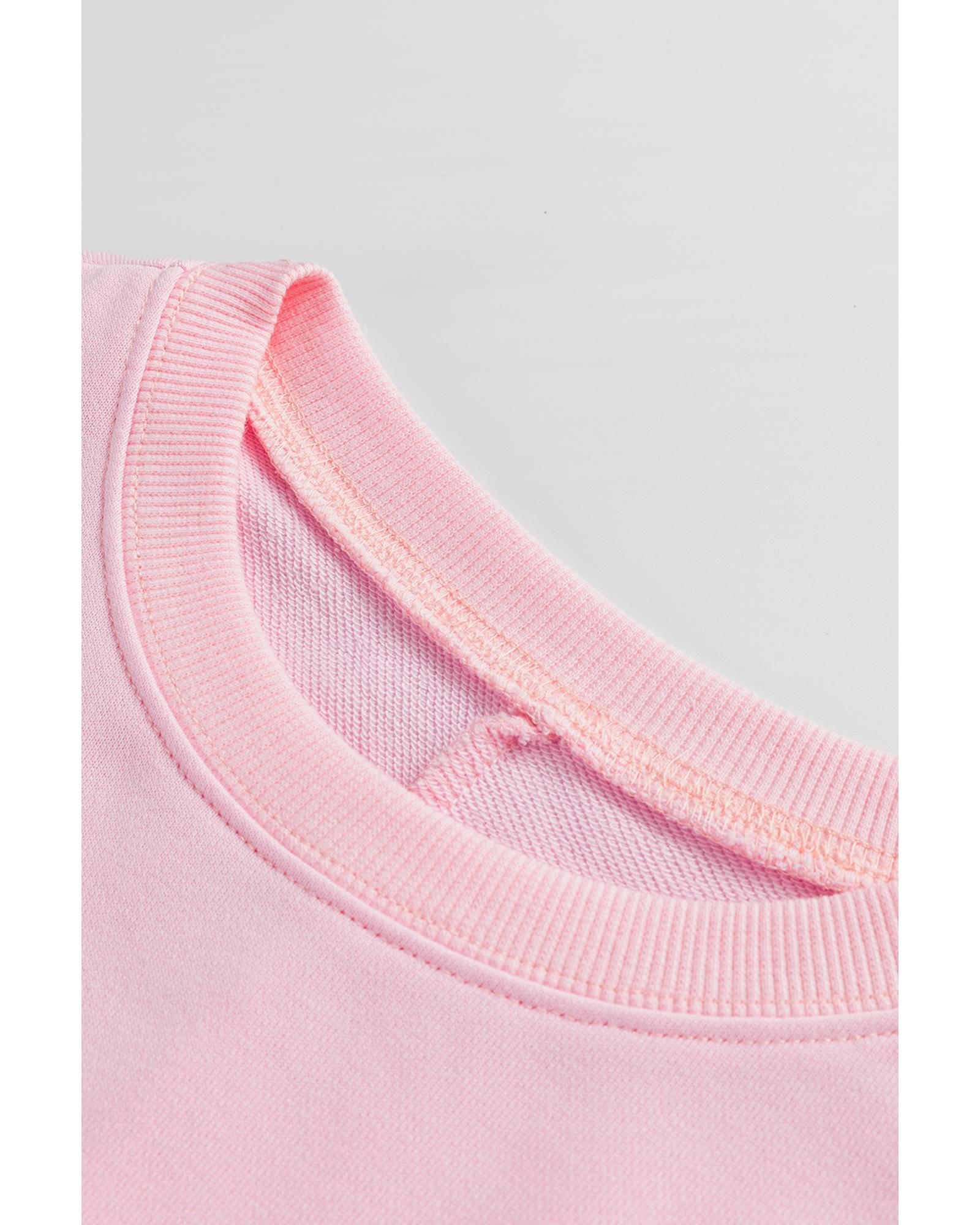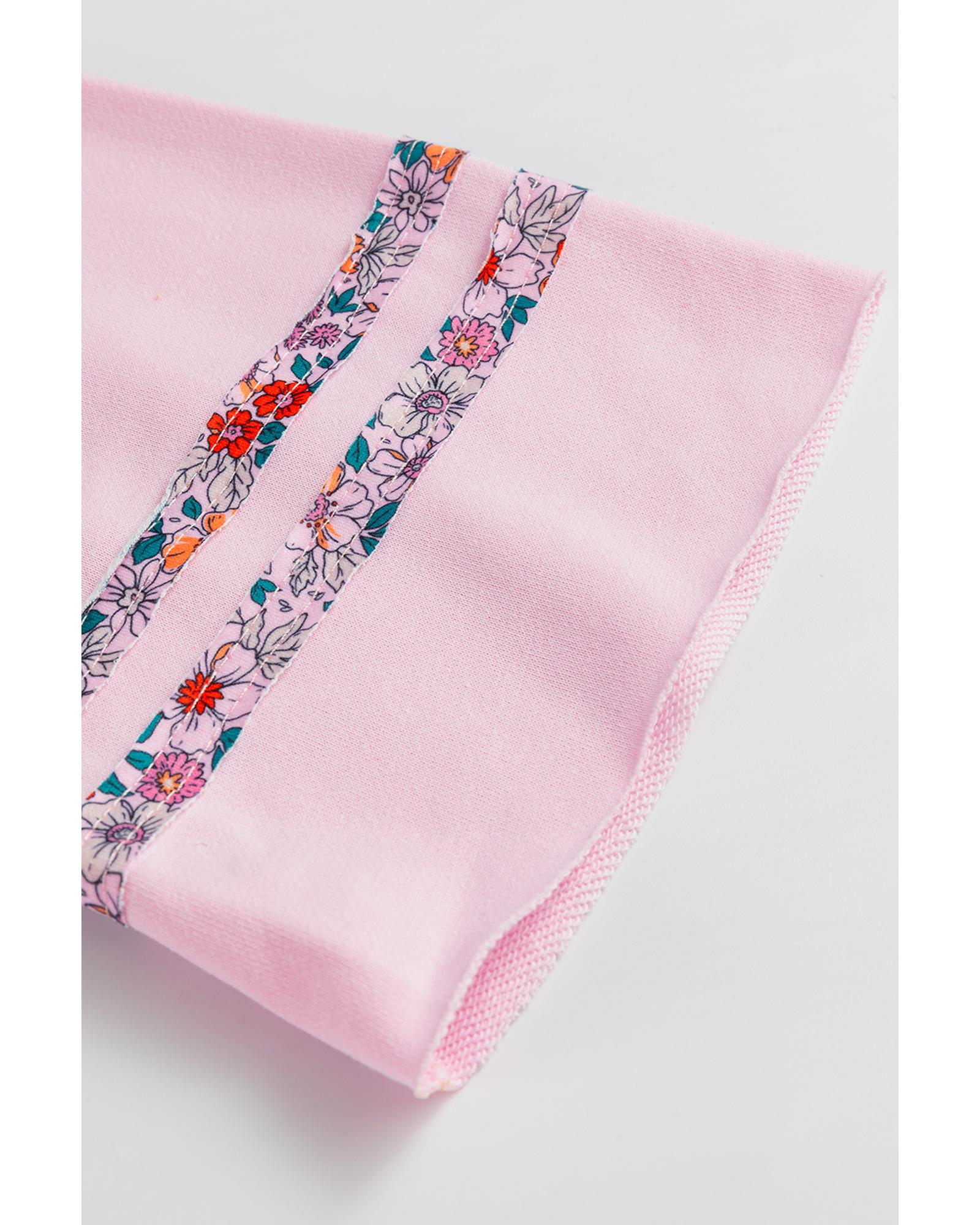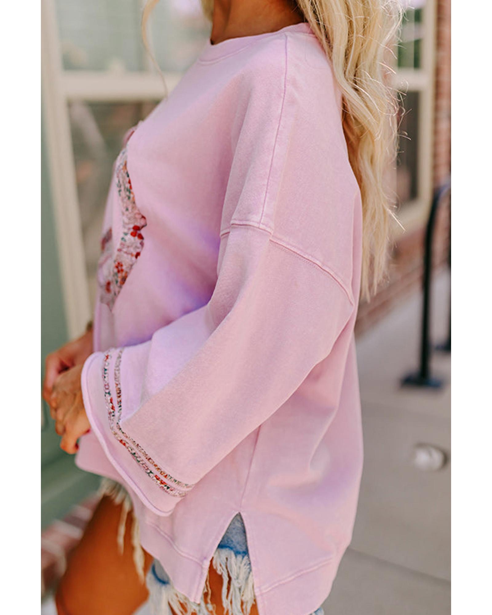 This casual top features a light pink color with a floral peace sign graphic, designed for a relaxed and comfortable fit. The drop shoulder and wide sleeves enhance its laid-back style, making it perfect for everyday wear or lounging.