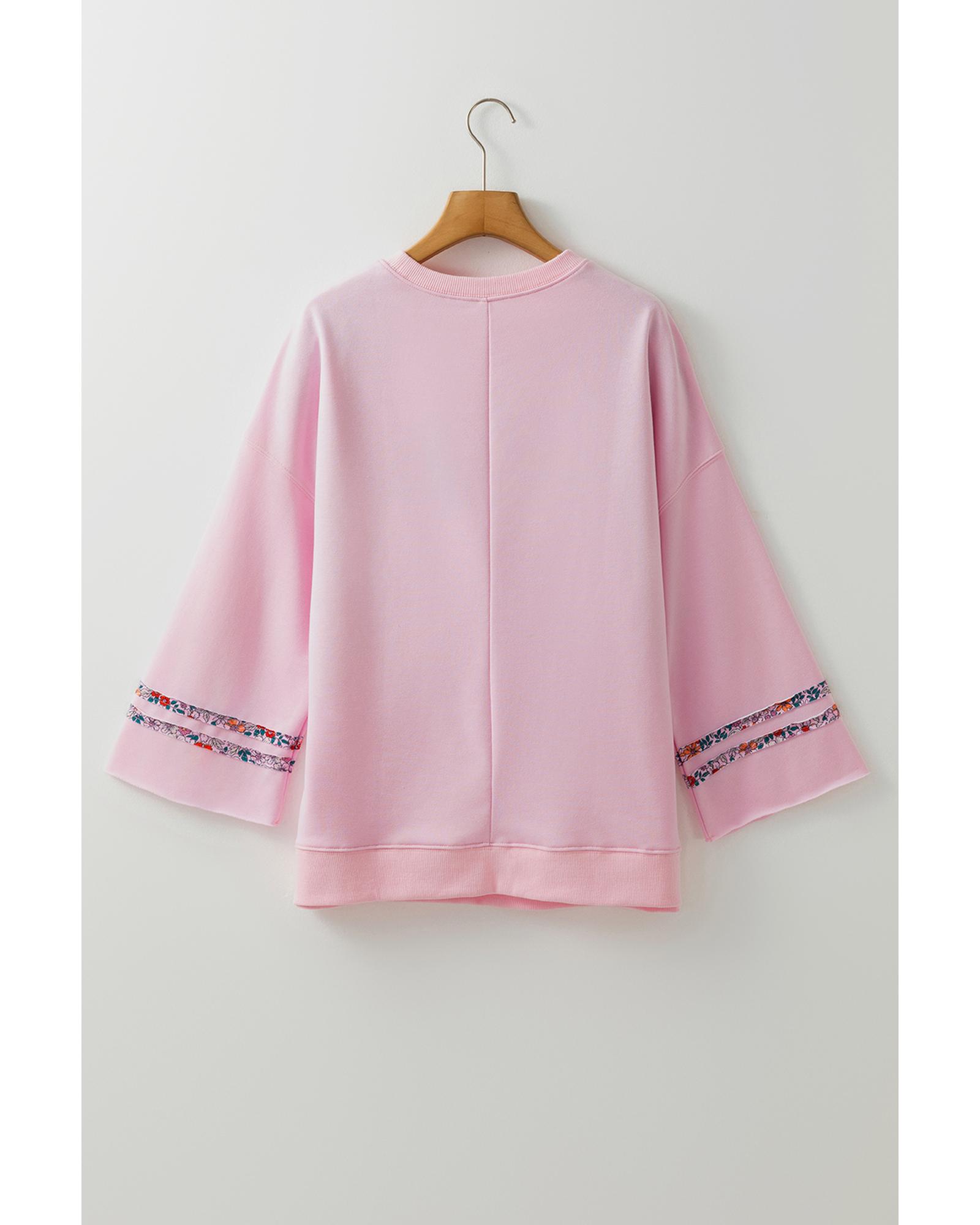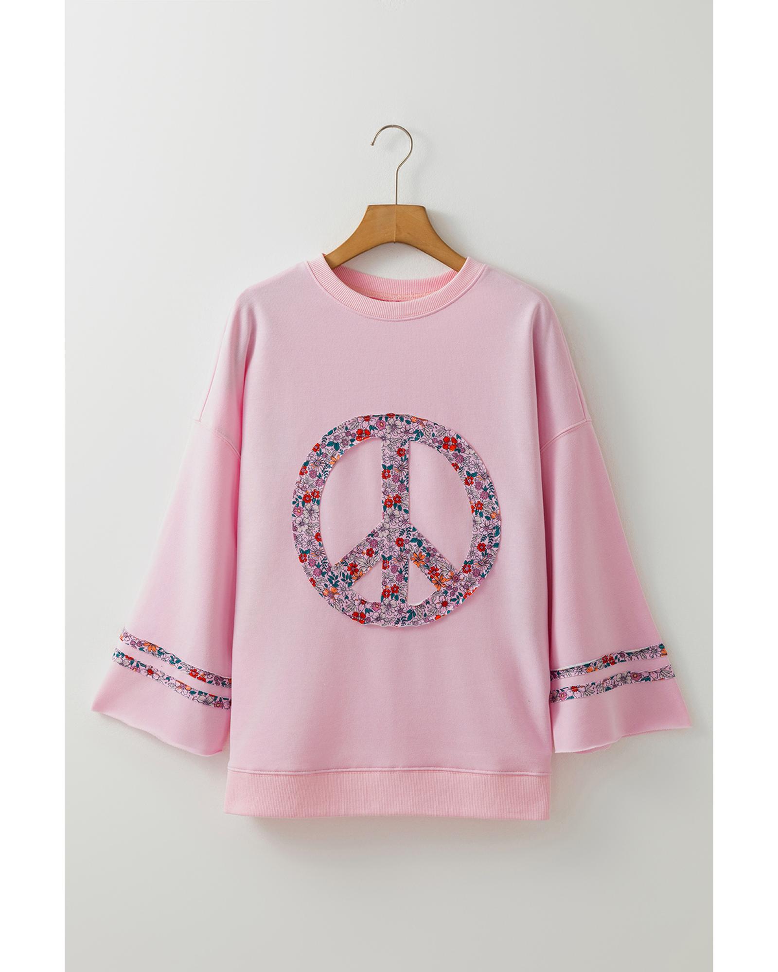 Light Pink Floral Peace Sign Graphic Drop Shoulder Wide Sleeve Casual Top – S