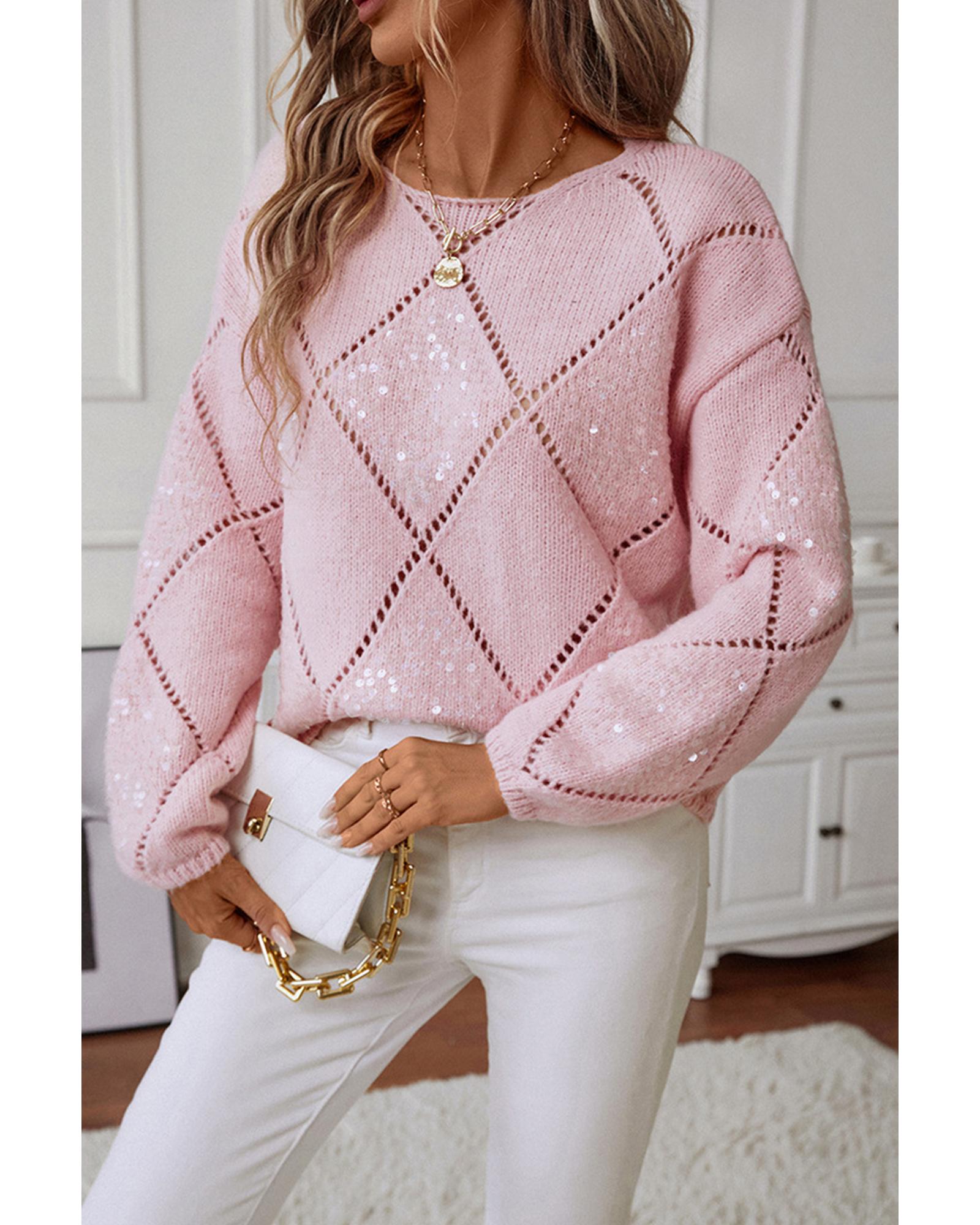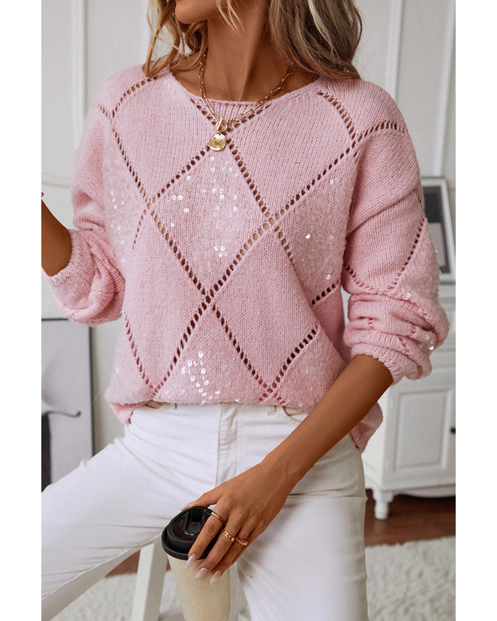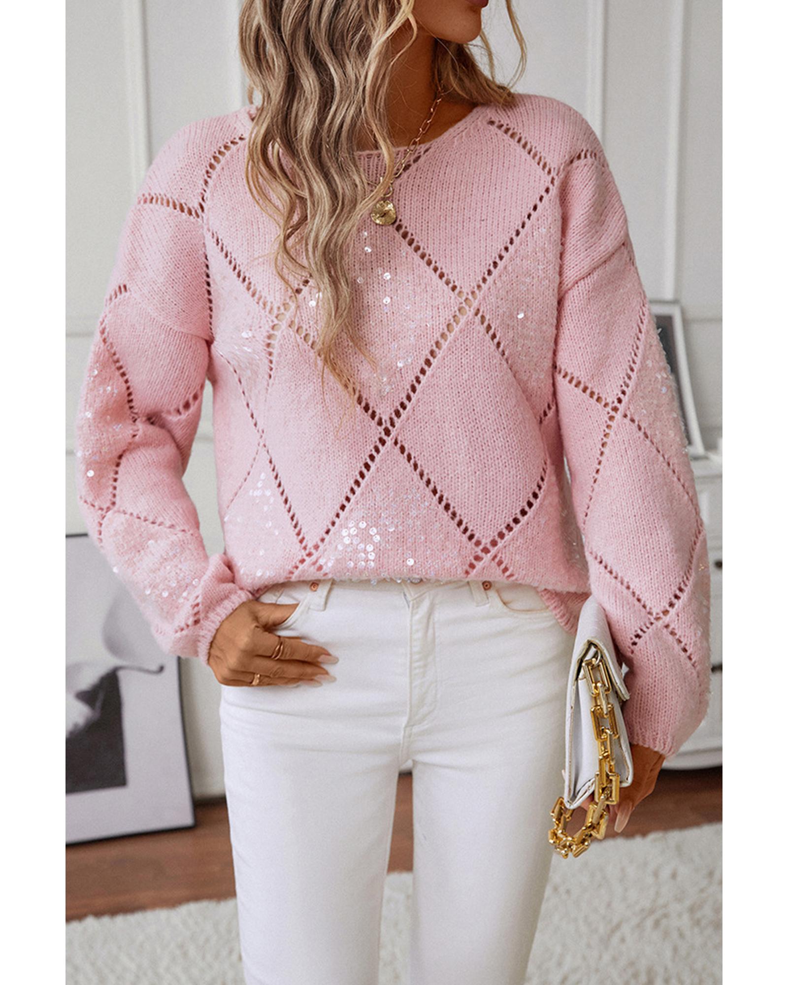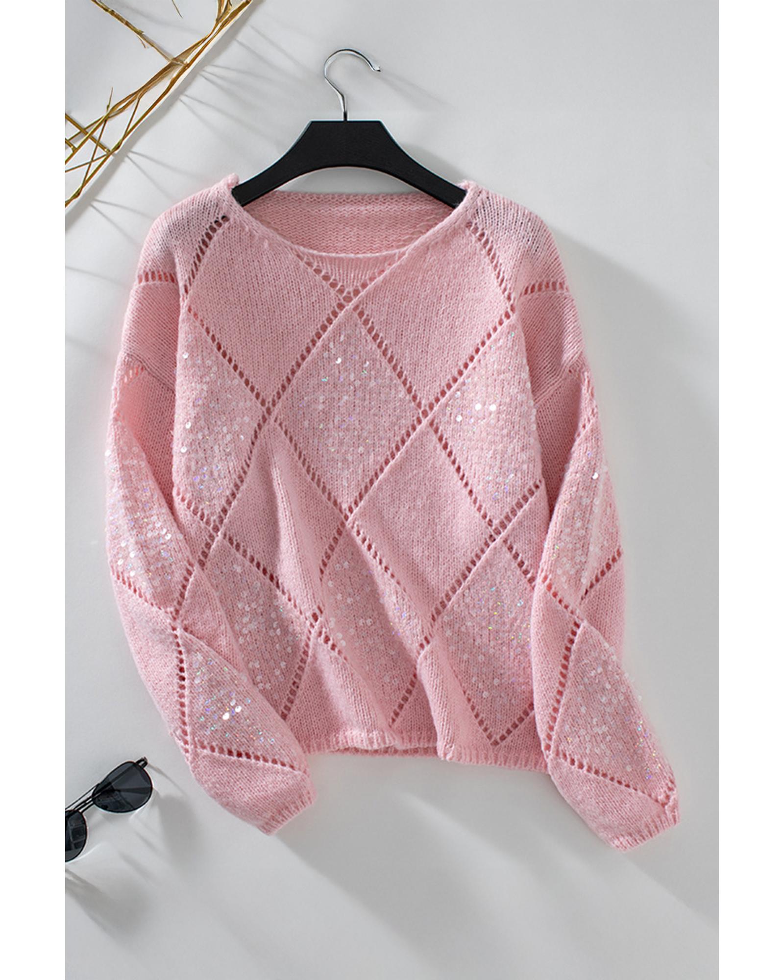 - Package includes: 1 x Light Pink Hollowed Rhombus Pattern Sequin Detail Round Neck Sweater