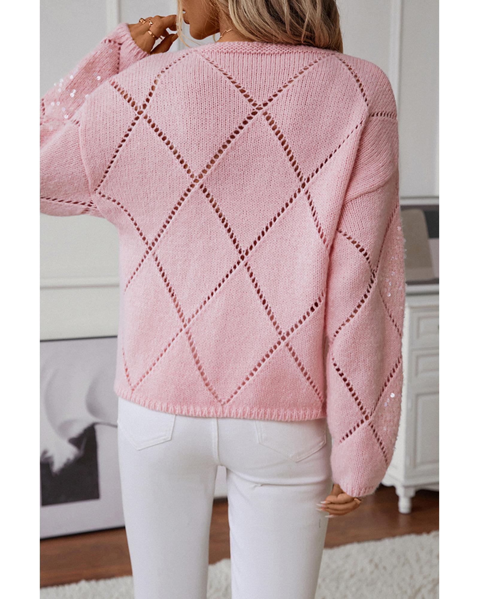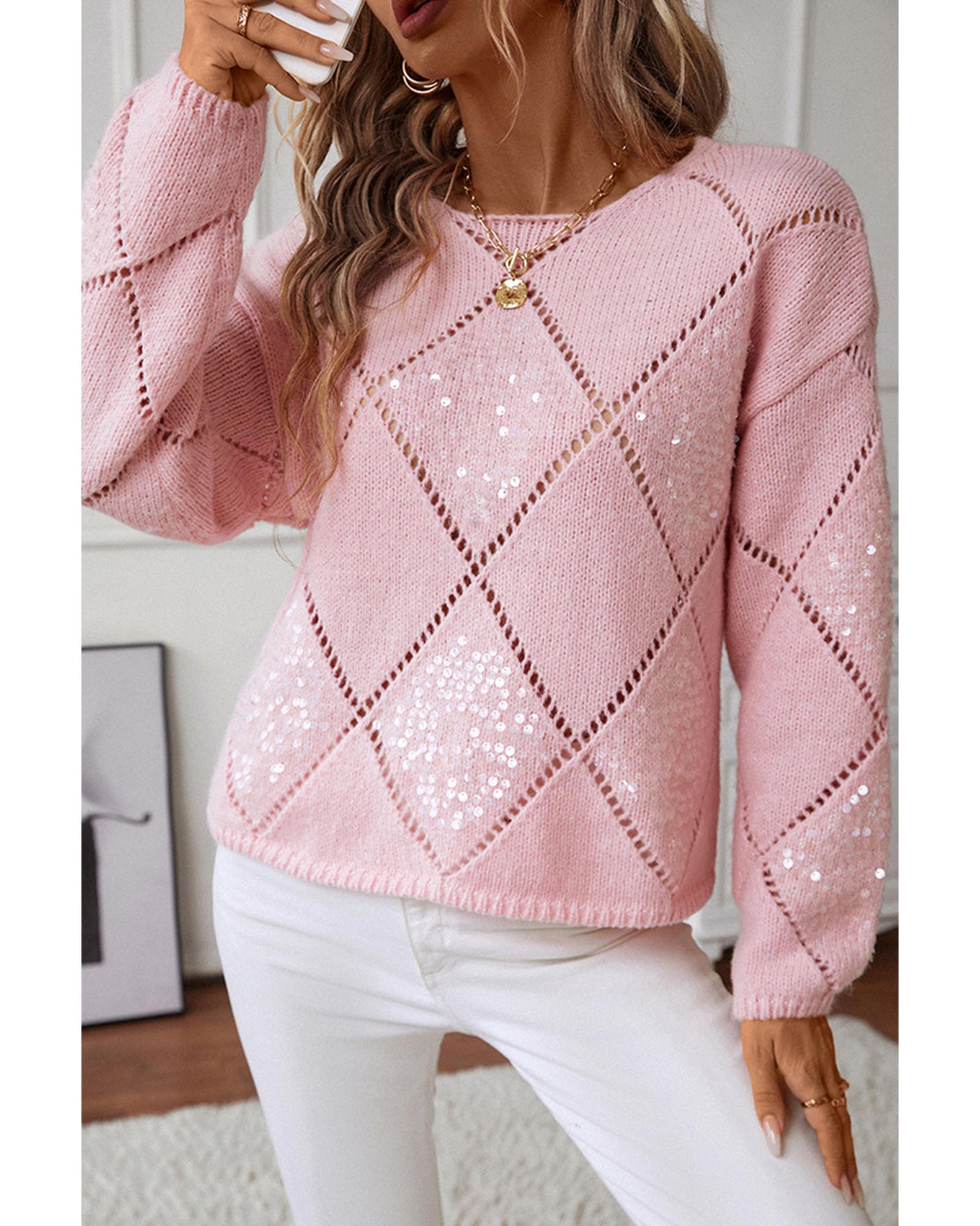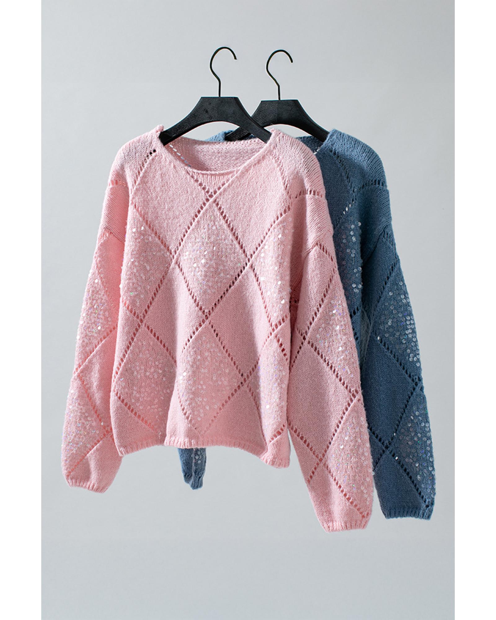 This light pink sweater features a hollowed rhombus pattern with sequin embellishments, offering a stylish and casual look. Its lightweight knit construction and openwork details make it comfortable for everyday wear, while the round neck design adds a classic touch. The loose fit provides a relaxed silhouette suitable for various casual occasions.