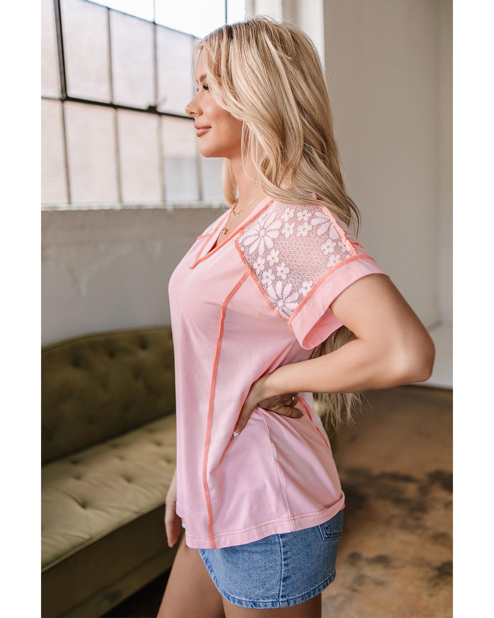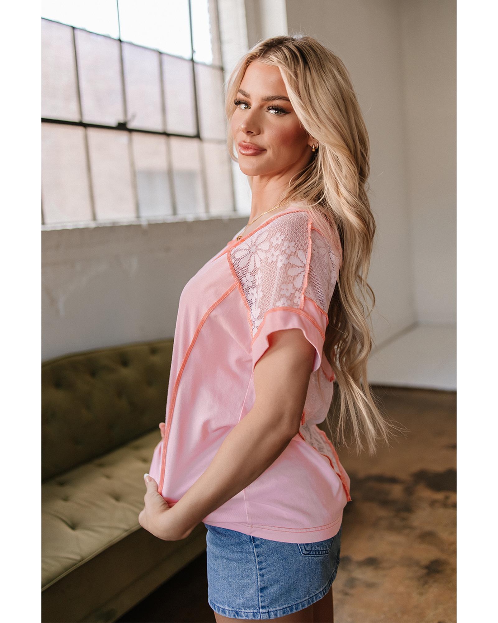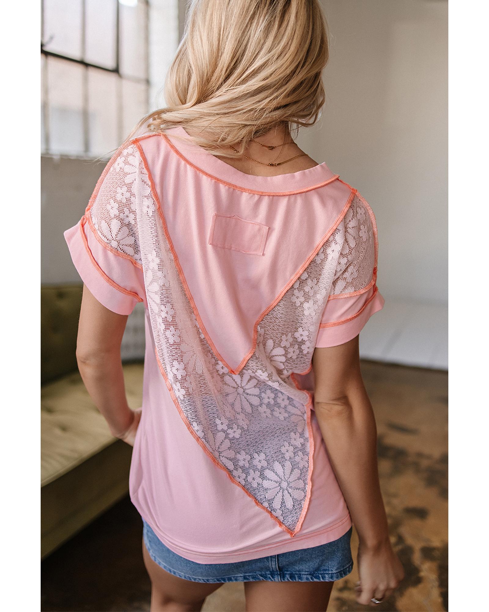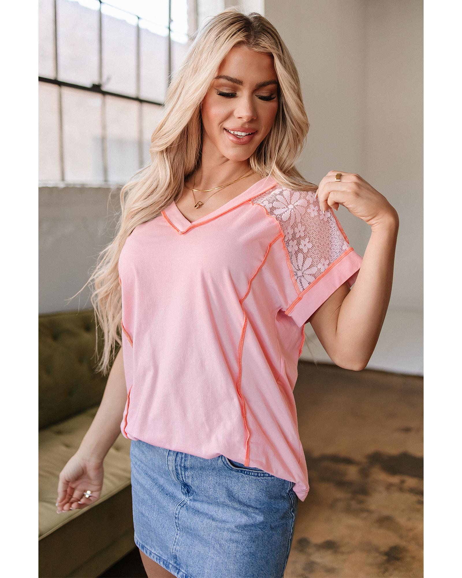Package Content: 1 Light Pink Lace Patchwork Exposed Seam V Neck T-Shirt